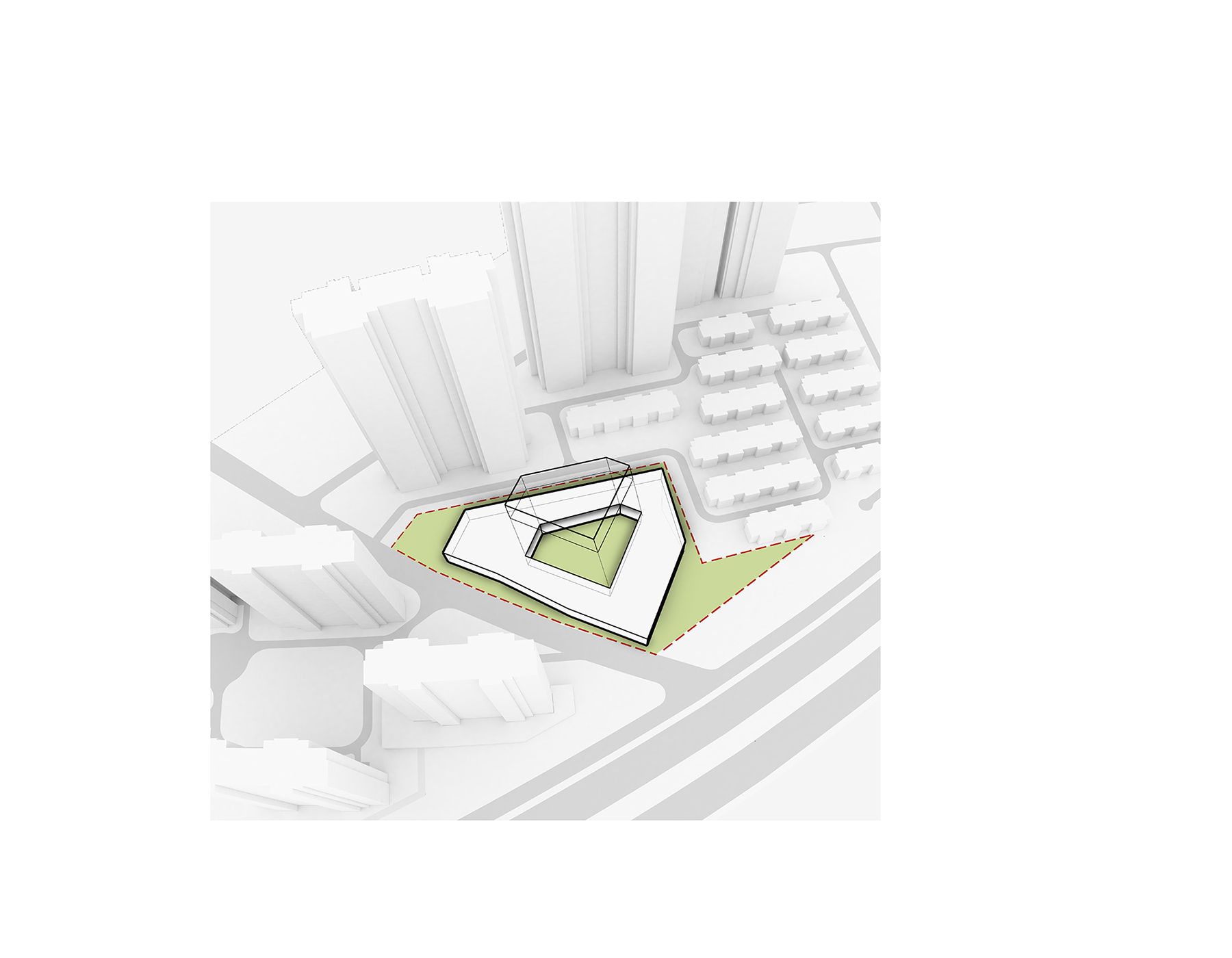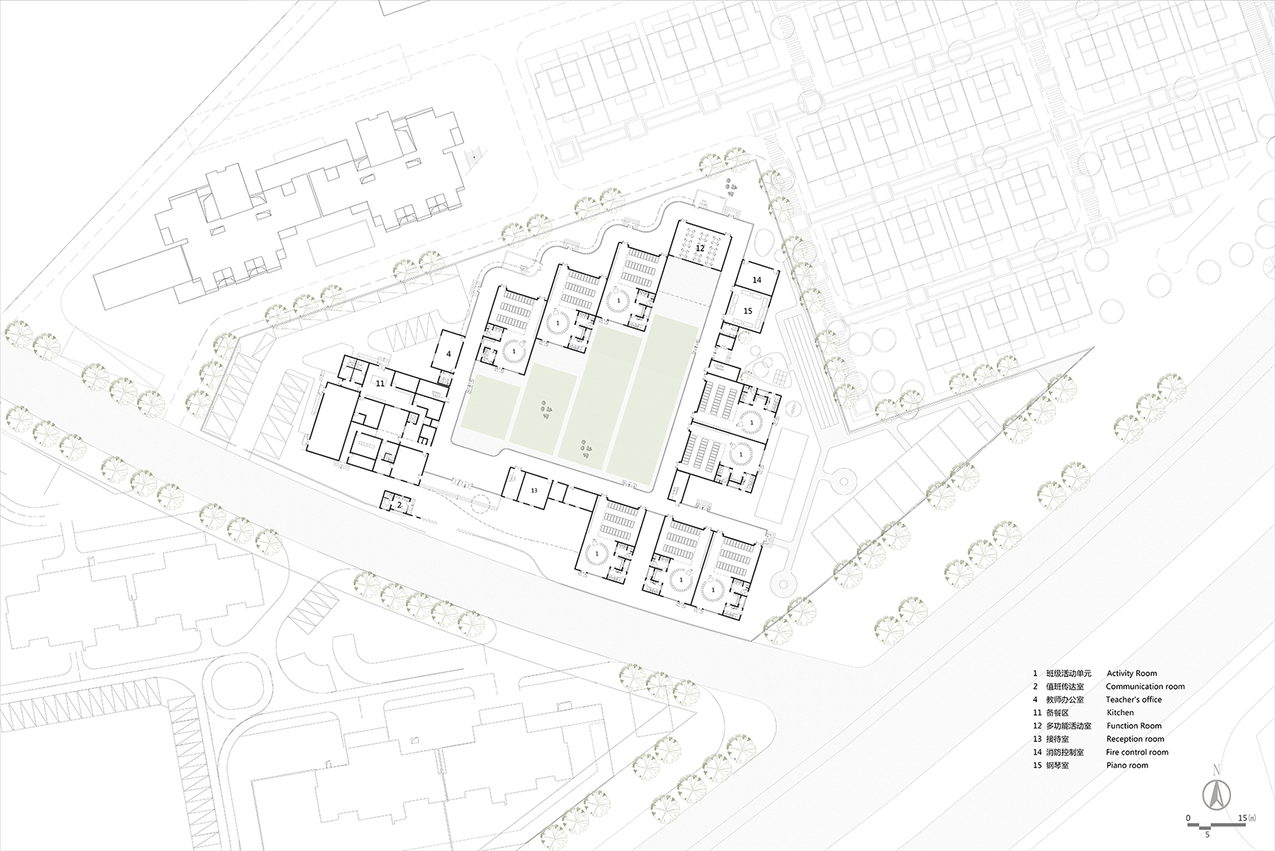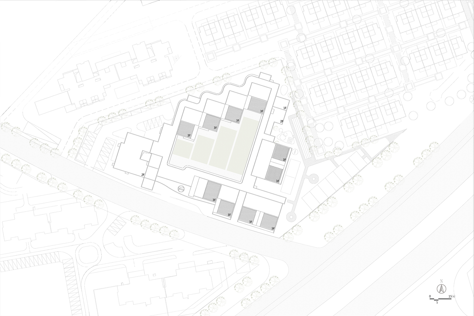 设计以“退让”为核心策略,着力缓解幼儿园与周边高层的对峙关系。建筑体量沿用地展开,以一种类似“甜甜圈”的形态围合成一个内聚性中心庭院,所有班级单元及辅助用房均围绕该庭院展开。中心庭院为小朋友们提供了一个安全内聚的游戏场地,并为日常全园性集中活动提供了空间。