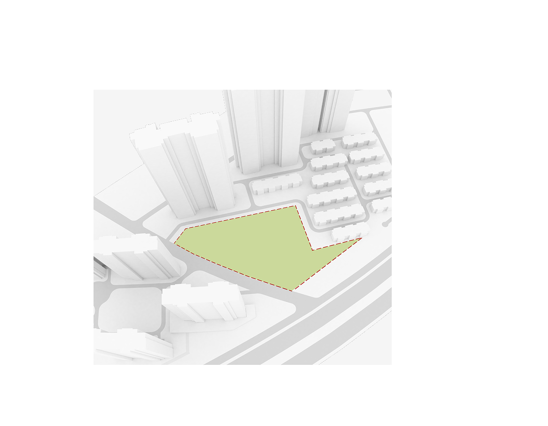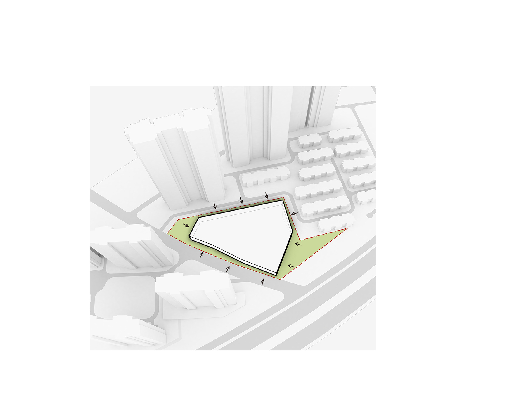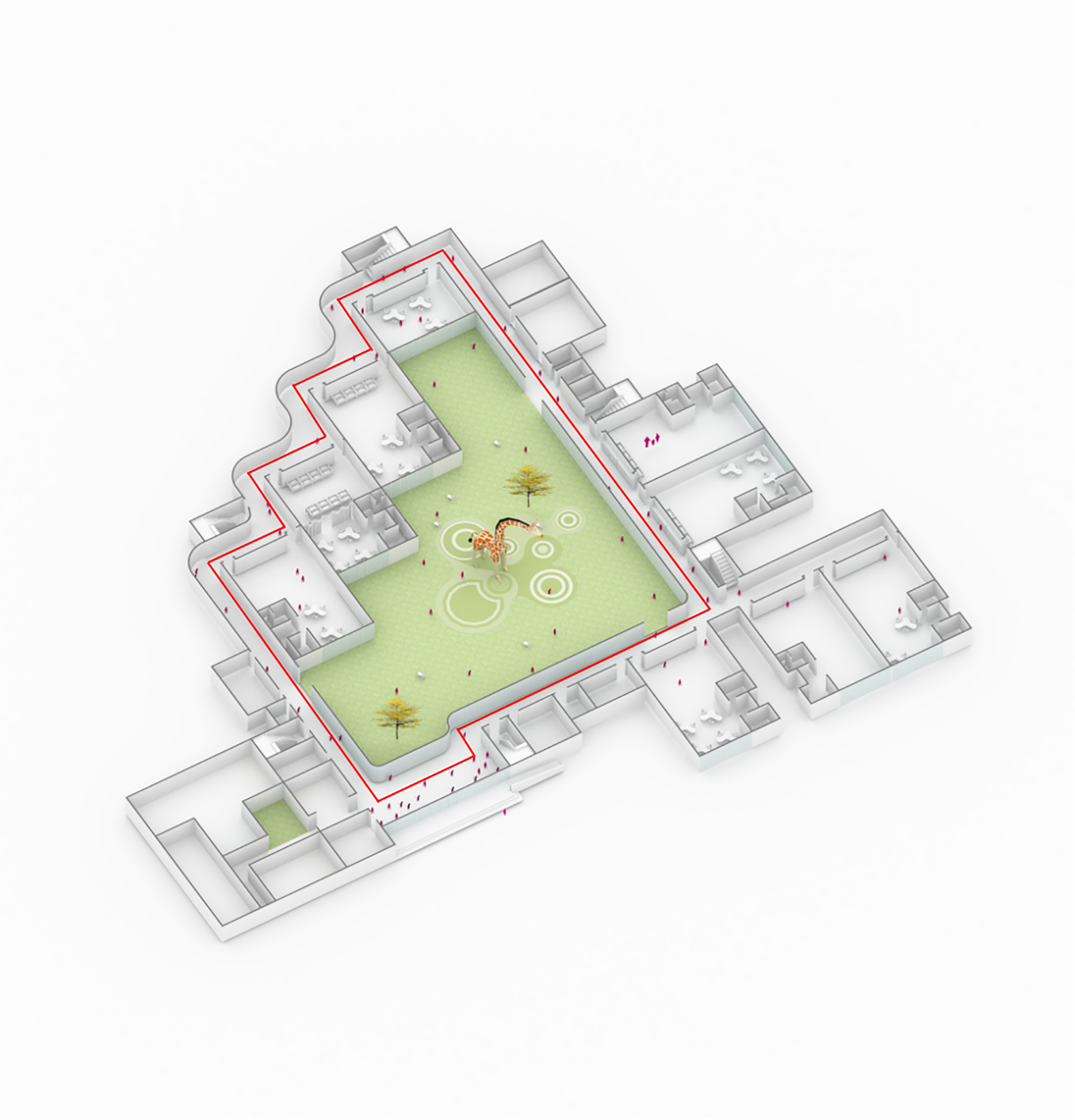 设计以“退让”为核心策略,着力缓解幼儿园与周边高层的对峙关系。建筑体量沿用地展开,以一种类似“甜甜圈”的形态围合成一个内聚性中心庭院,所有班级单元及辅助用房均围绕该庭院展开。中心庭院为小朋友们提供了一个安全内聚的游戏场地,并为日常全园性集中活动提供了空间。