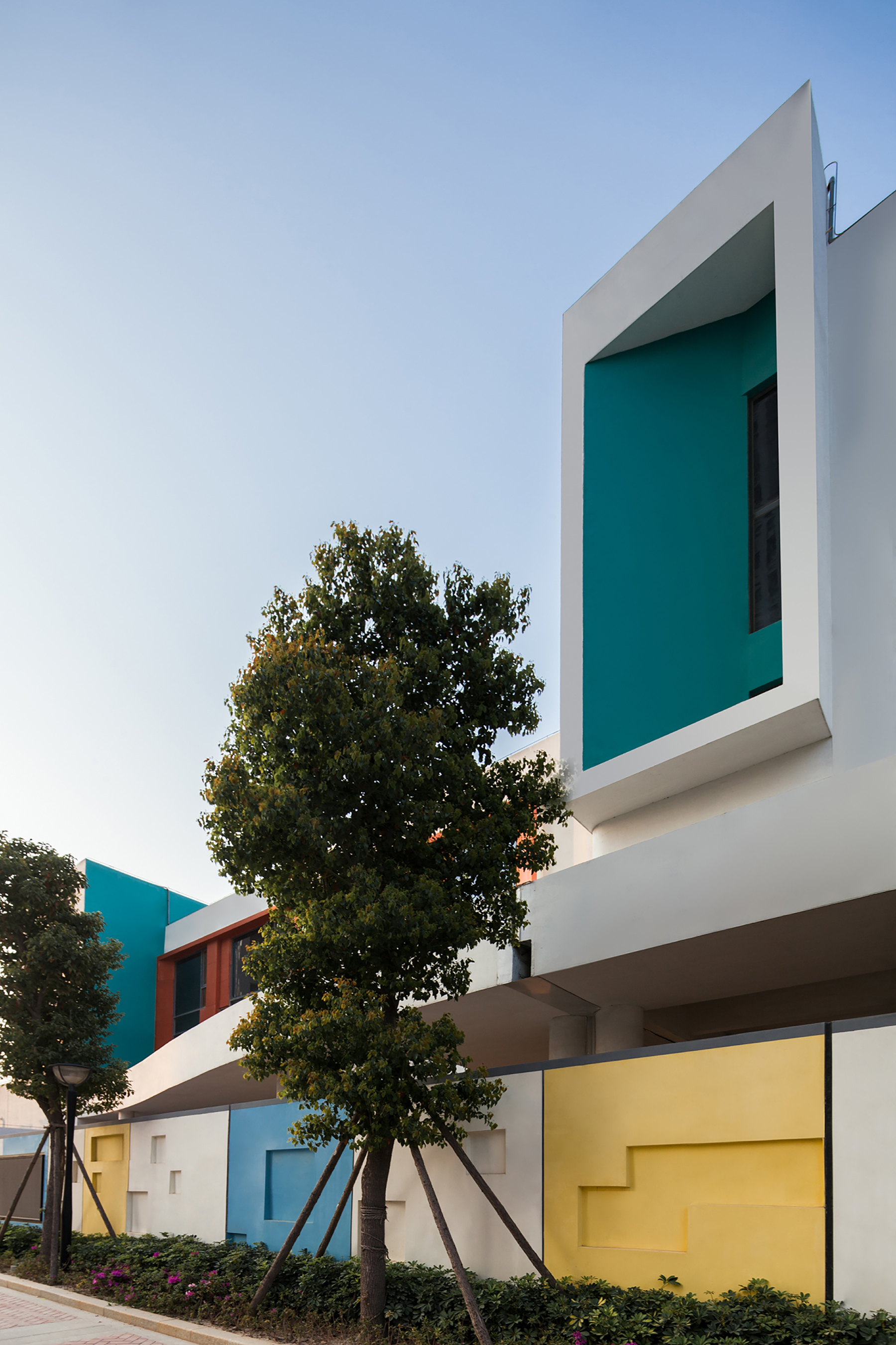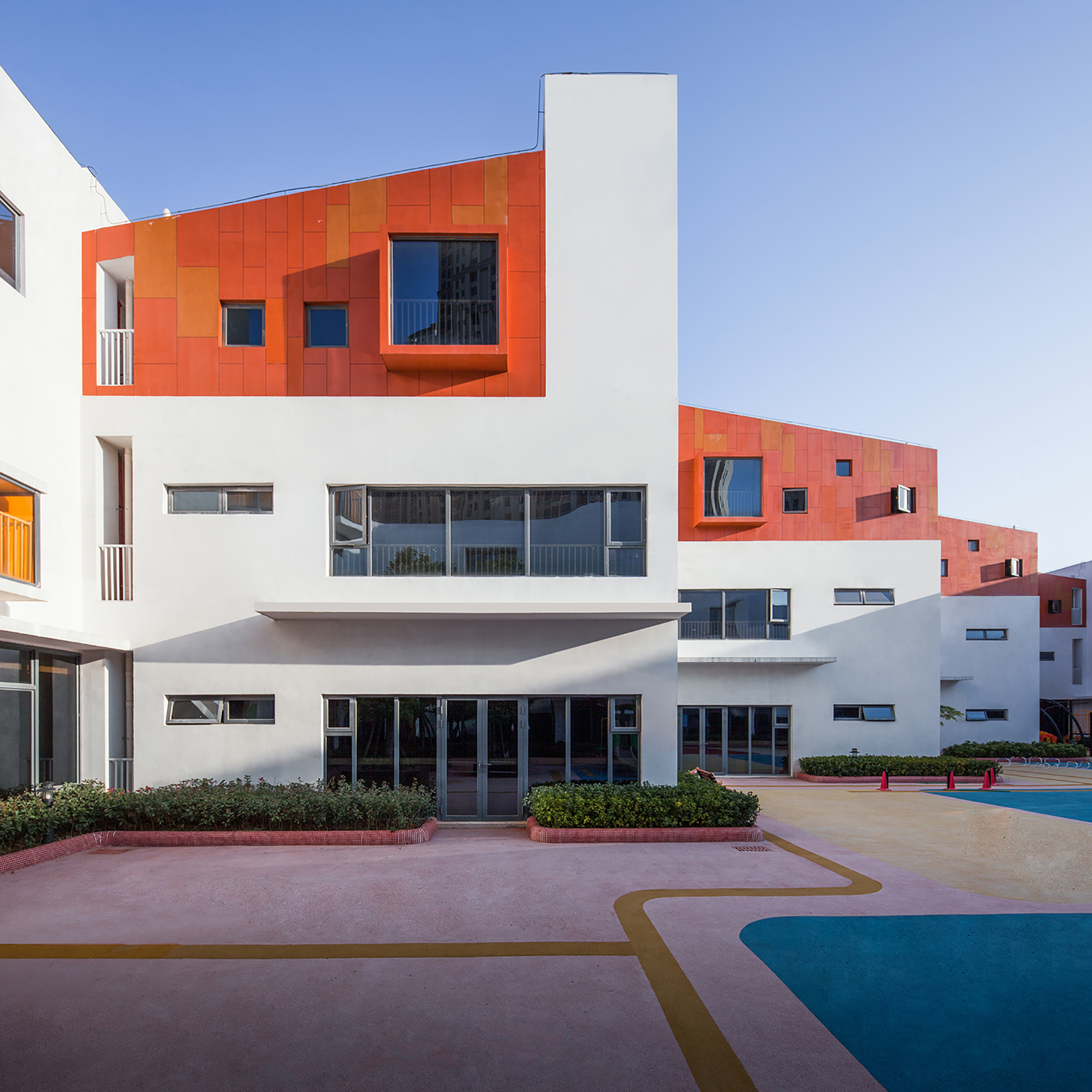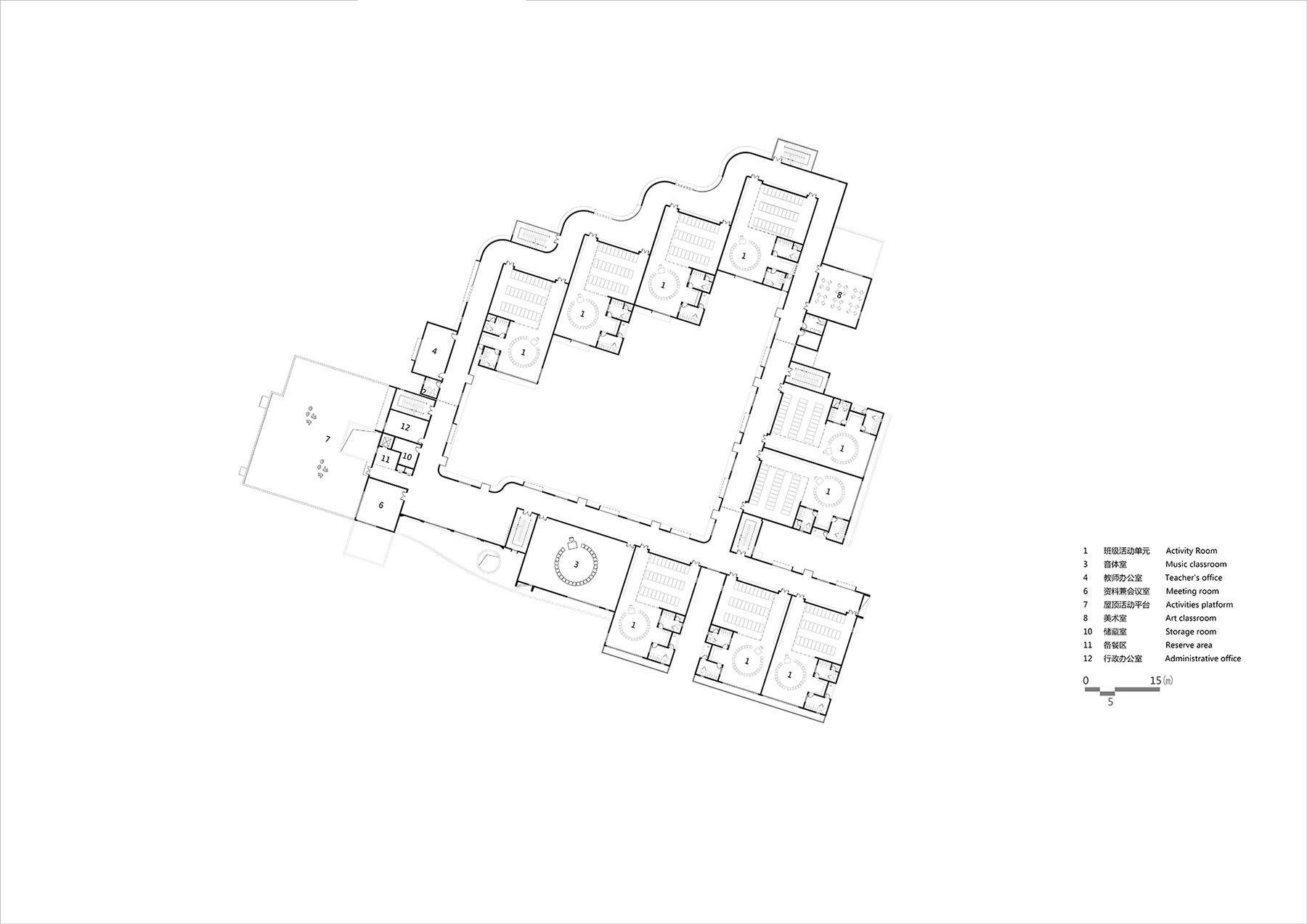 标准班级单元采用了形体简洁的单坡屋顶,坡屋顶对于小朋友们来说是就是“房子”或“家”最典型也是最抽象的表达,它是一种建筑符号,也是一种情感媒介。坡屋顶不同的组合方式形成了丰富的建筑立面效果,也为周边高层住户提供了有趣的园区“第五立面”。