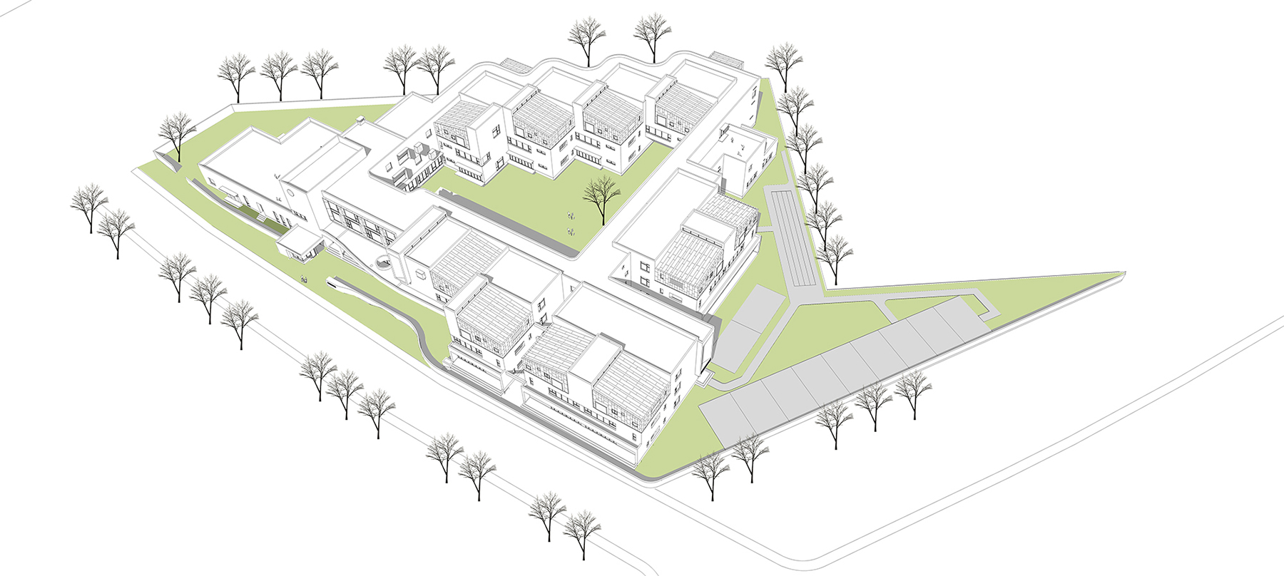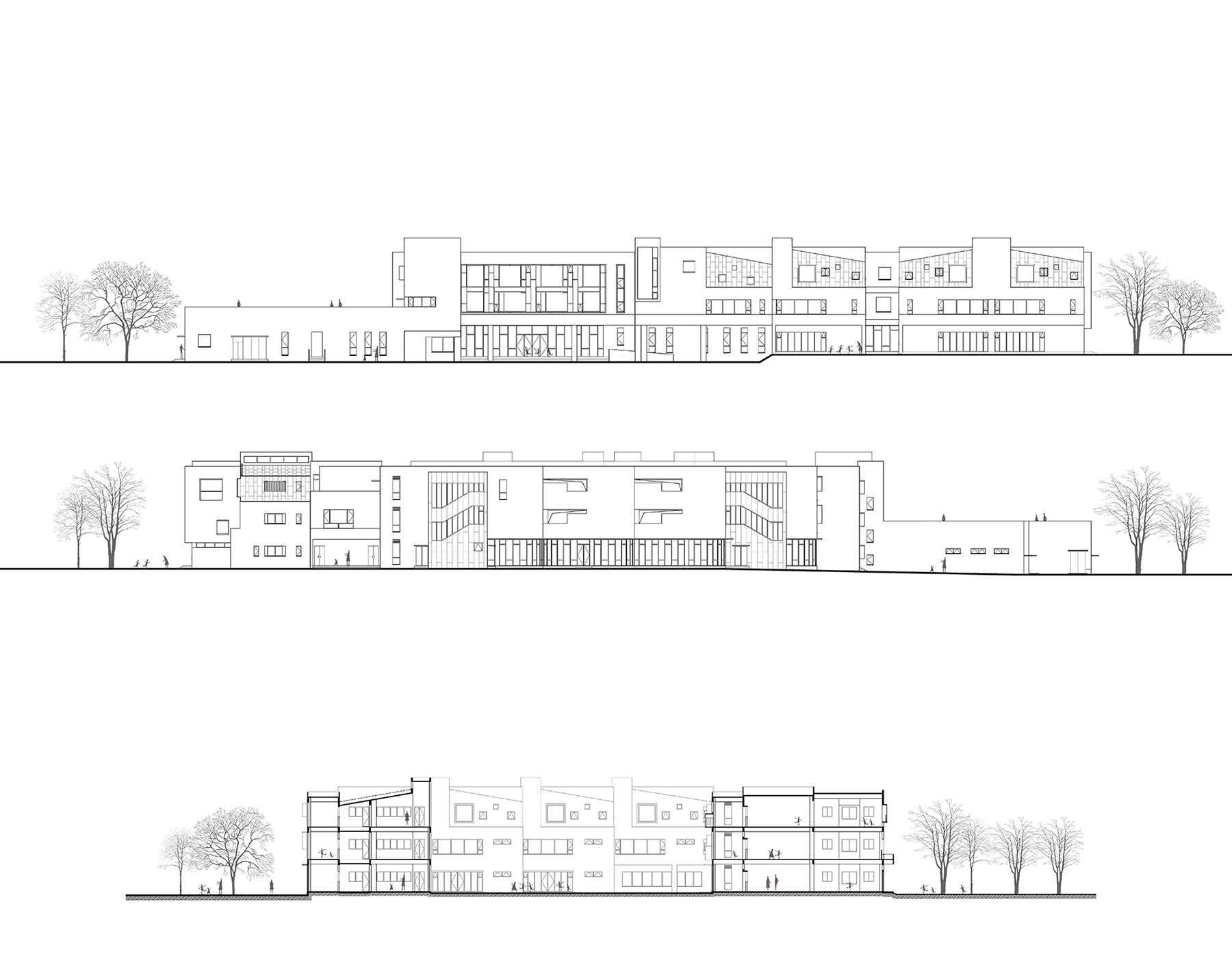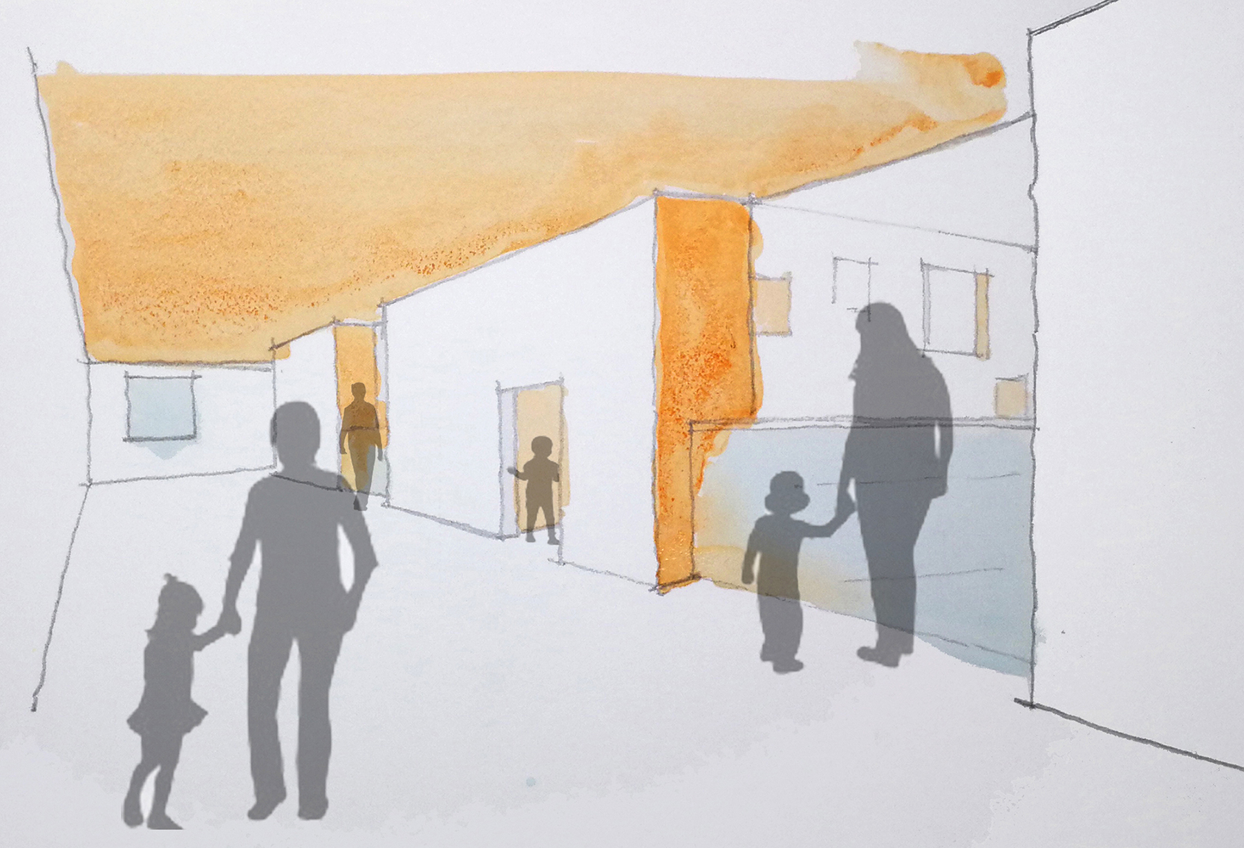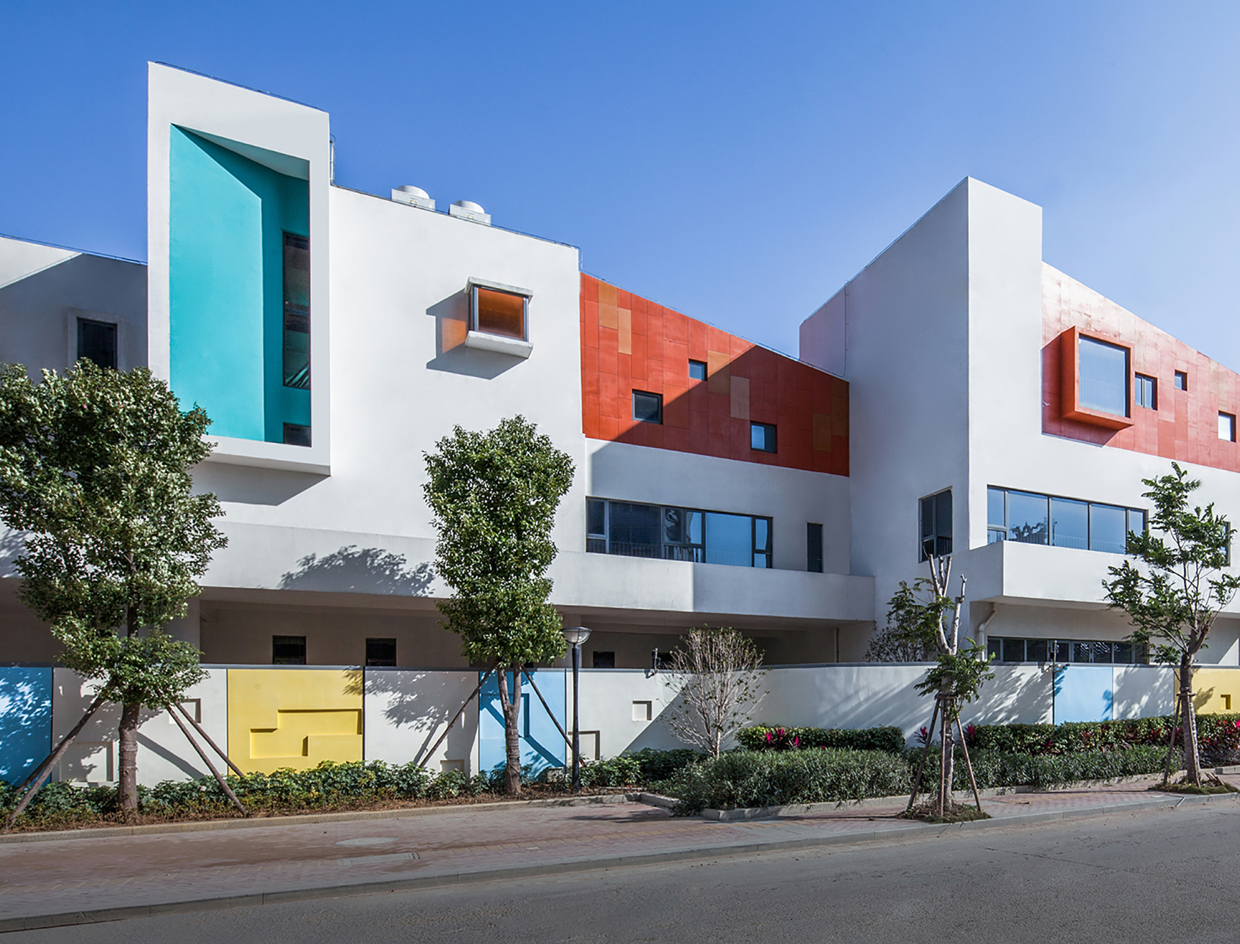 标准班级单元采用了形体简洁的单坡屋顶,坡屋顶对于小朋友们来说是就是“房子”或“家”最典型也是最抽象的表达,它是一种建筑符号,也是一种情感媒介。坡屋顶不同的组合方式形成了丰富的建筑立面效果,也为周边高层住户提供了有趣的园区“第五立面”。