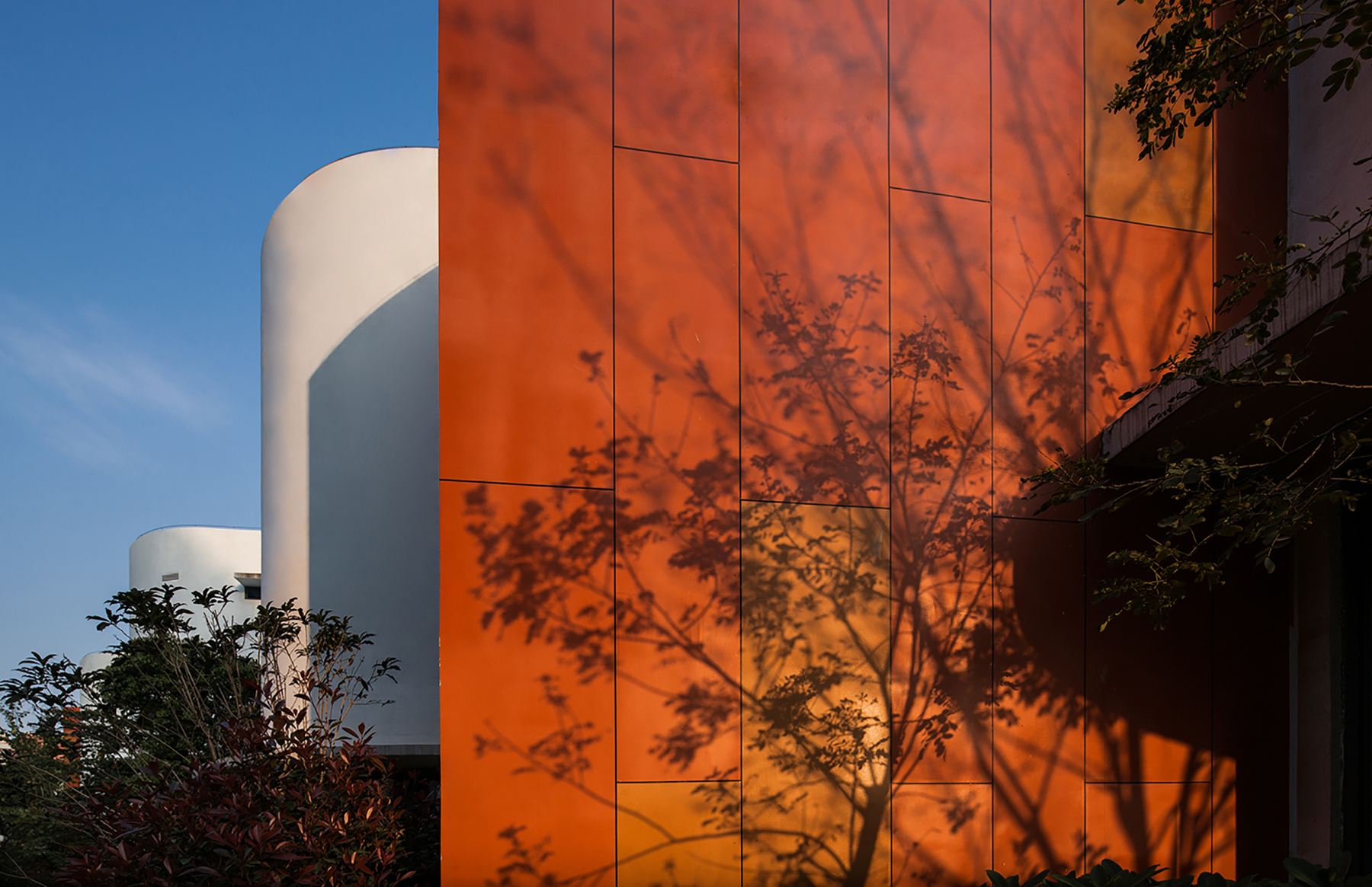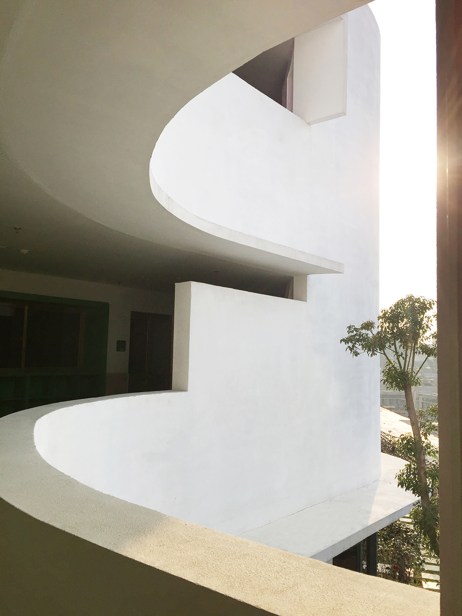 为减少对北侧住宅的压力,幼儿园北侧的建筑体量沿界以“波浪”起伏的曲面形态呈现,塑造出一种有趣的缓冲界面,为紧邻的低层住户提供了表情生动的对视景观, 同时也为建筑内部塑造了一段富有戏剧性的围廊空间。