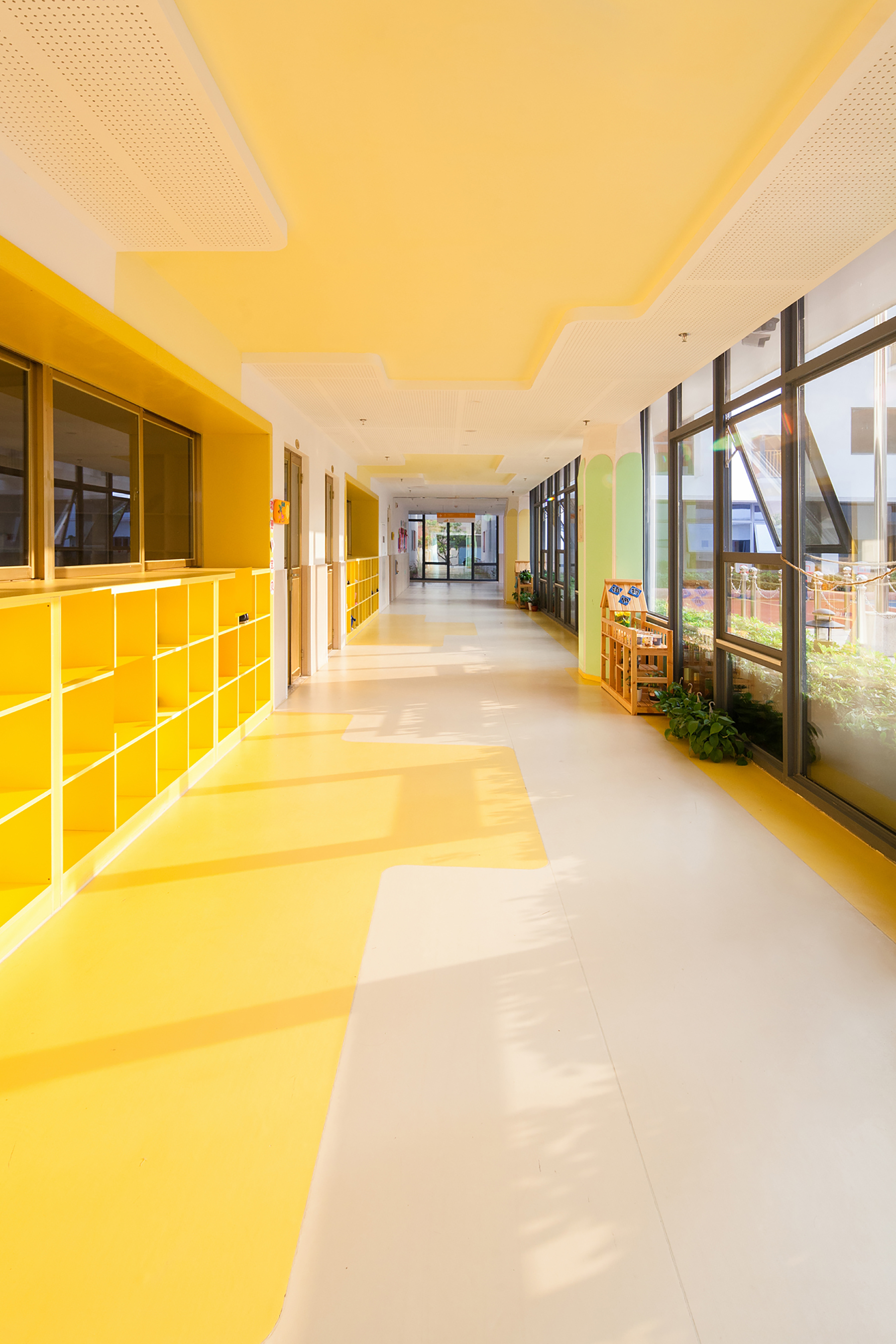 3.8M宽的大尺度环廊串联每层的班级单元和功能房间,为全园的小朋友们提供了一条长达220余米的带状室内活动空间,它将普通的交通需求替代为小朋友的全天候活动场所,在这可以尽情奔跑、追逐,无拘无束地游戏。