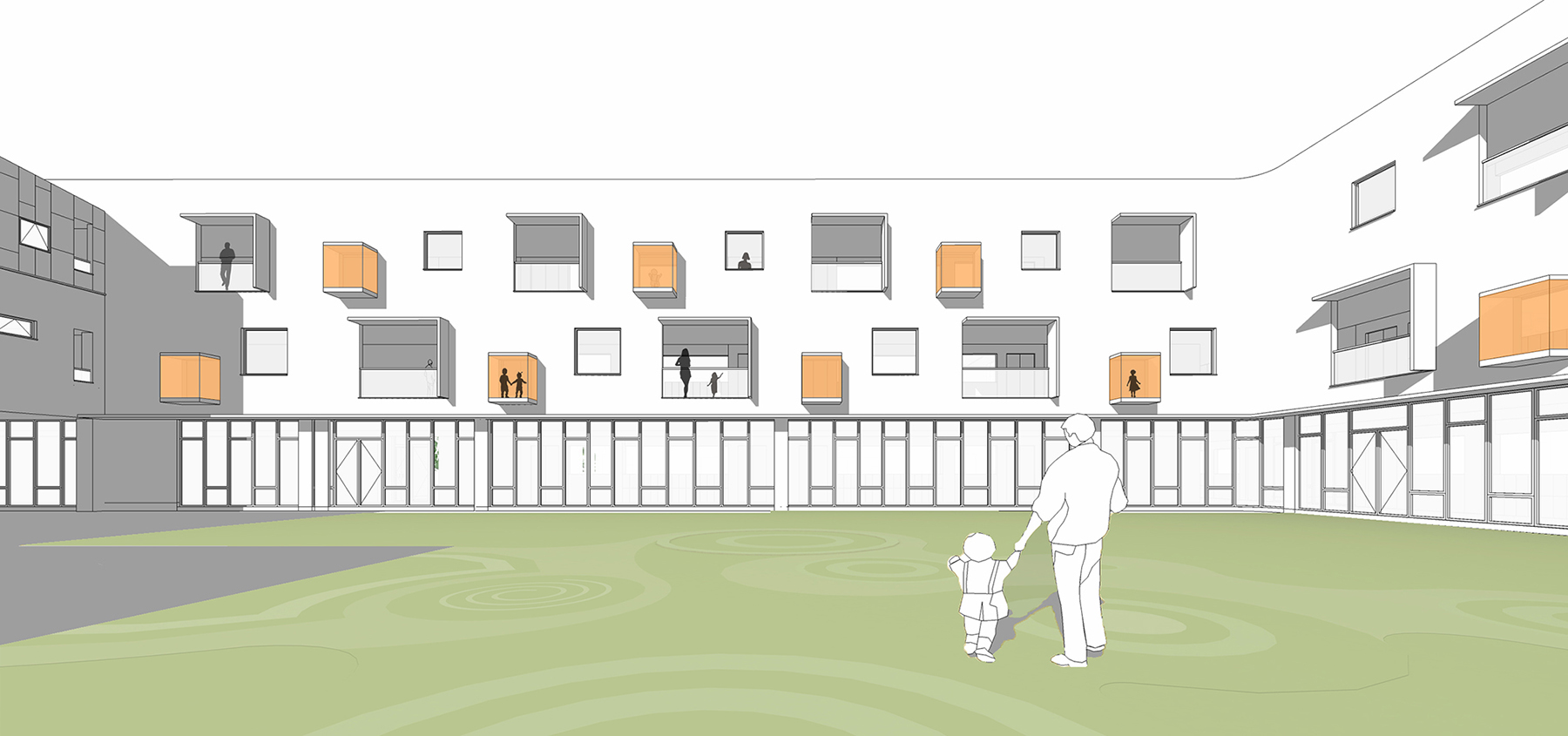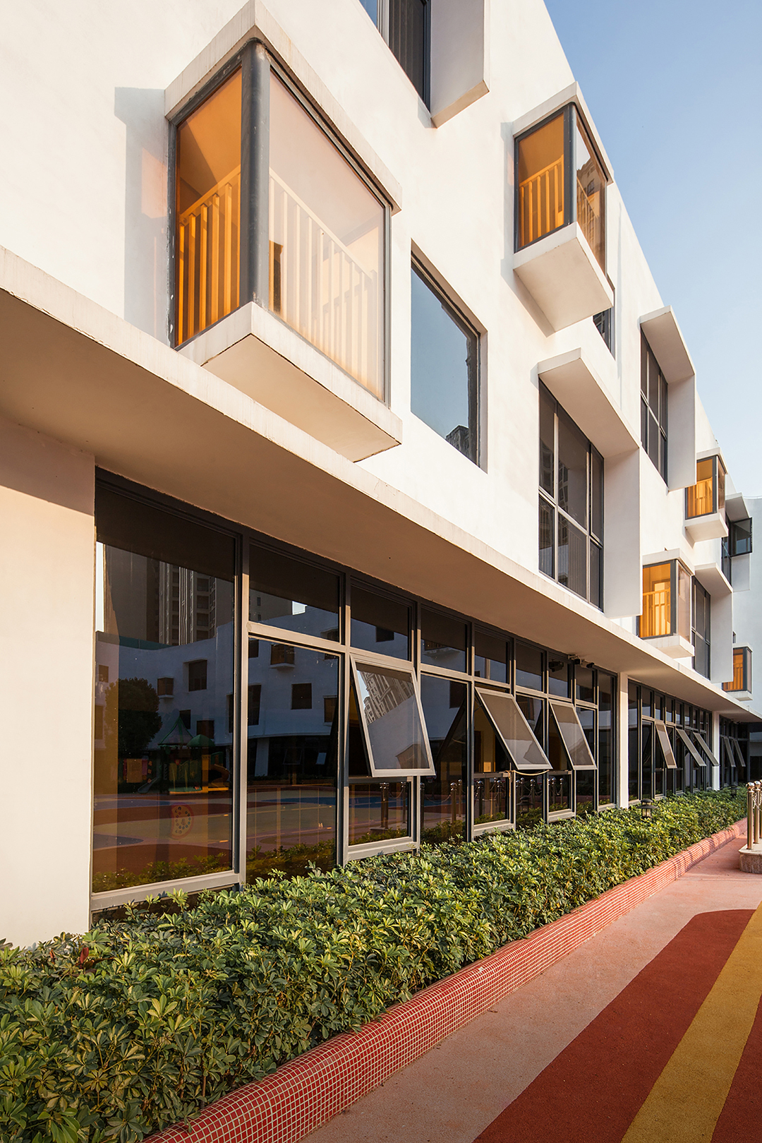 朝着中心庭院的环廊外墙,设置了三种不同尺度的洞口,对应不同的活动场景,洞口尺寸分别为2700*2700——落地窗洞,老师和小朋友都能通过这个窗洞看到中心庭院; 1800*1800——距地900的窗洞,老师能往外看到庭院,小朋友能往上看到天空;1500*1500——进深900的落地凸窗,大人不便进入,它是小朋友们的私属小屋,三两个小伙伴可以躲在“小屋”里分享彼此的小秘密,或者与走廊上的其他小朋友玩捉迷藏的游戏。