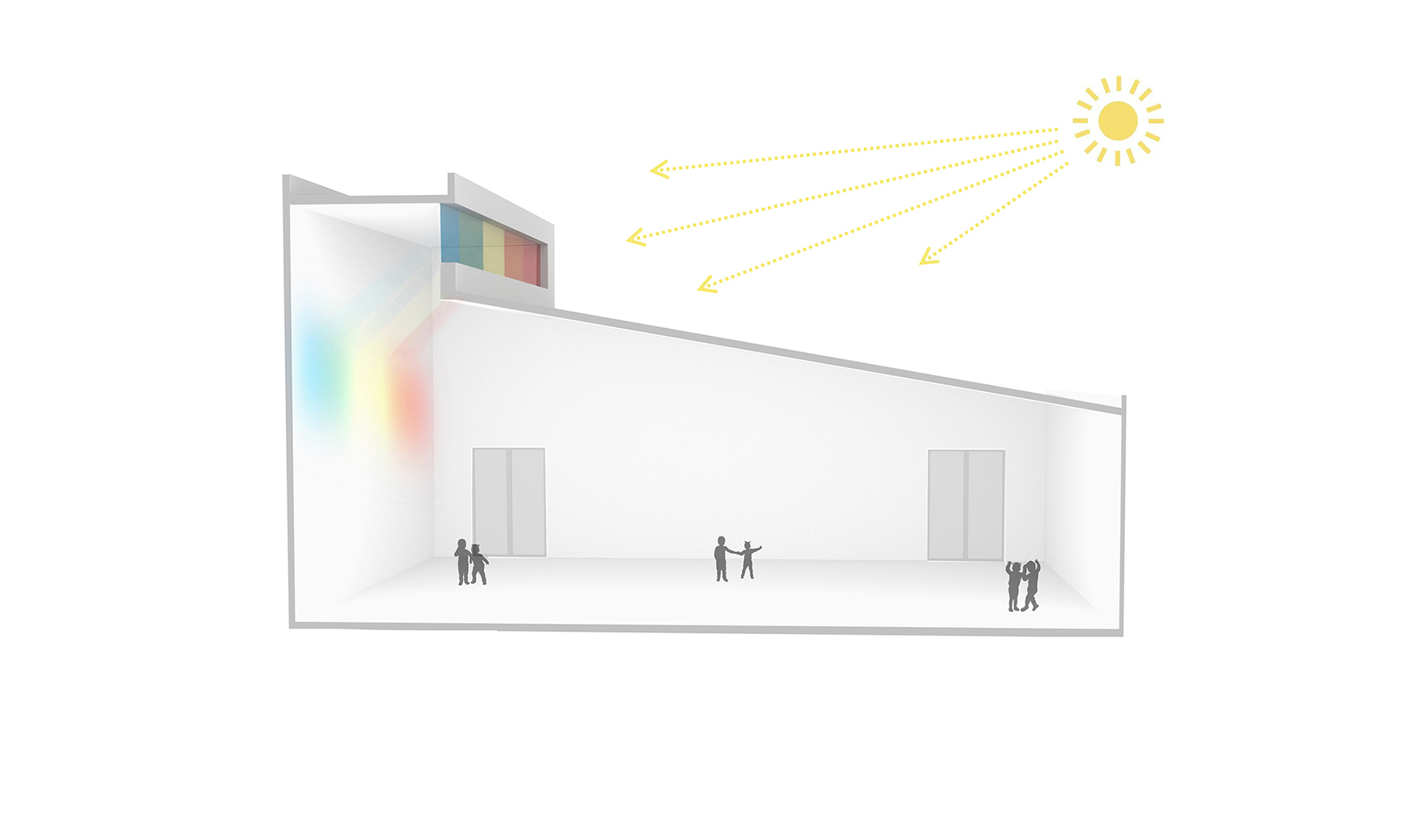 设计师给三层的每一个班级单元都设置了彩色天窗,期望每天早晨的阳光透过天窗投射到活动室的白色墙面上,产生如七色彩虹般的光影效果。这面墙将成为小朋友们的天然调色板,从早晨到傍晚,随着时间变幻出不同的色彩和图案。