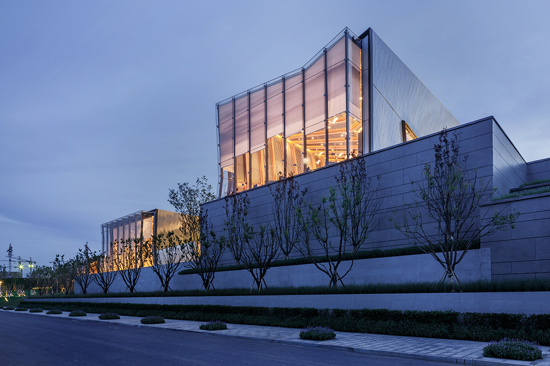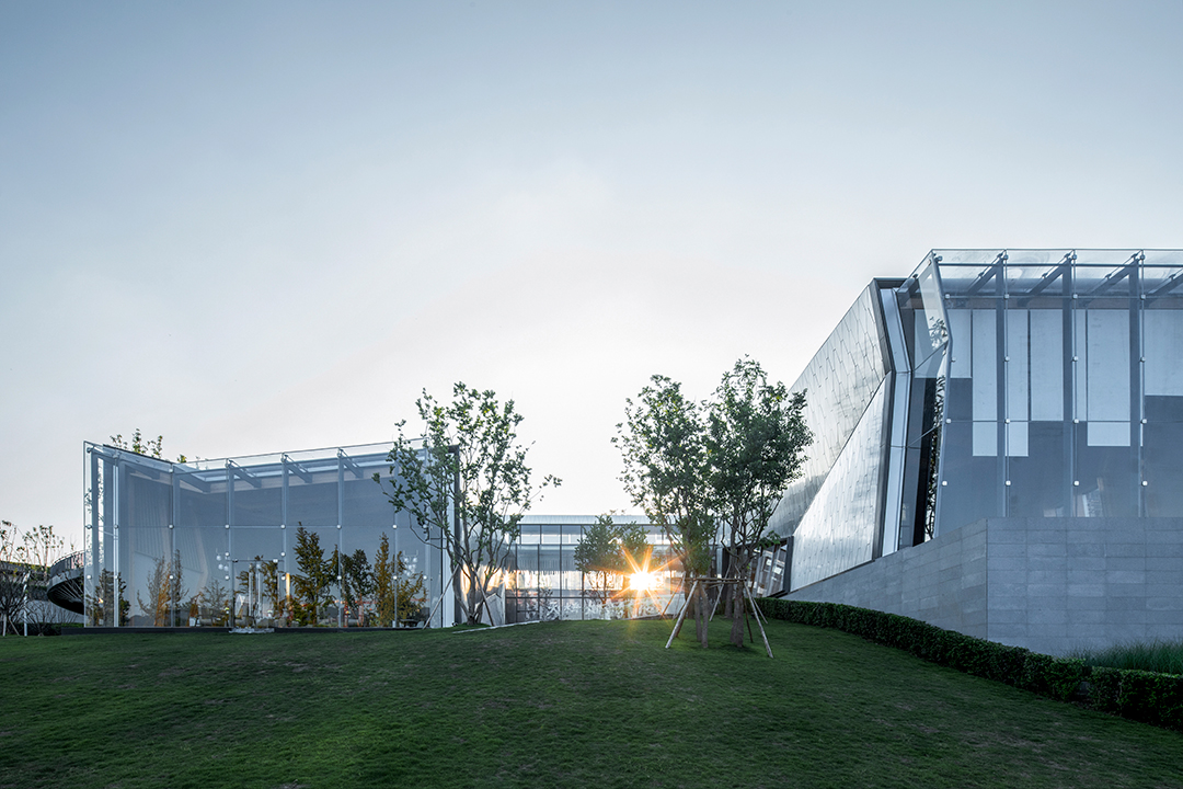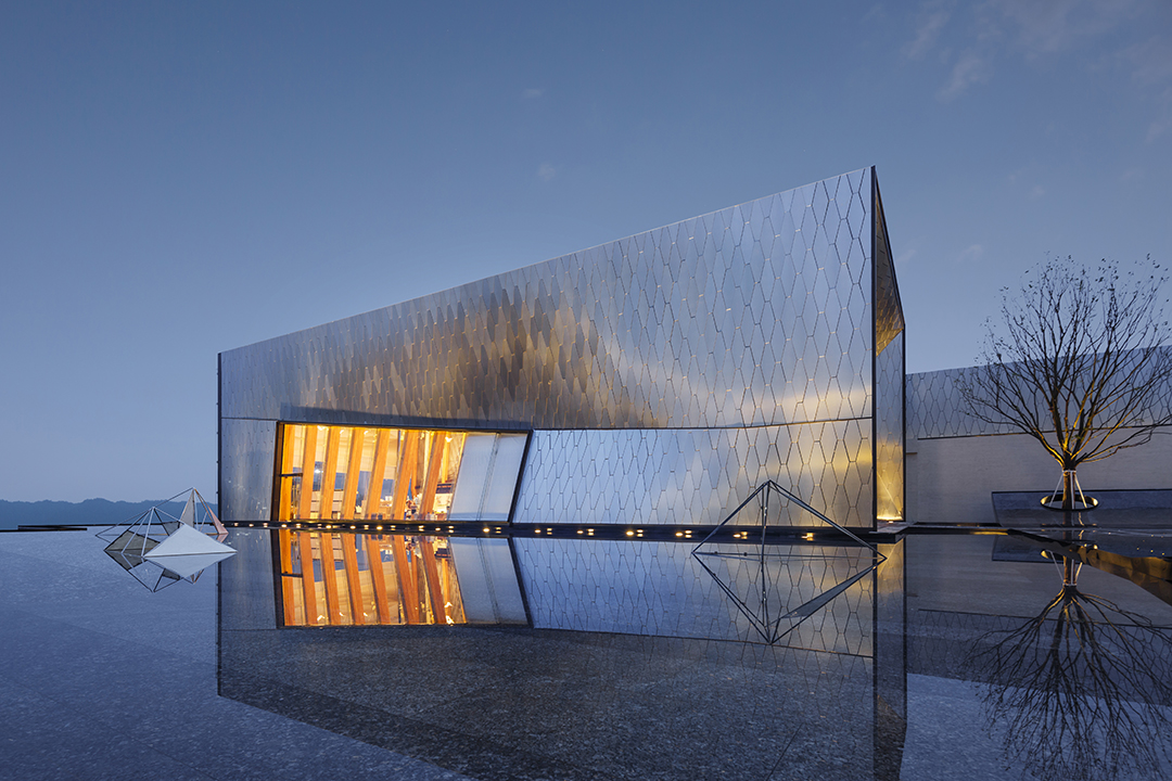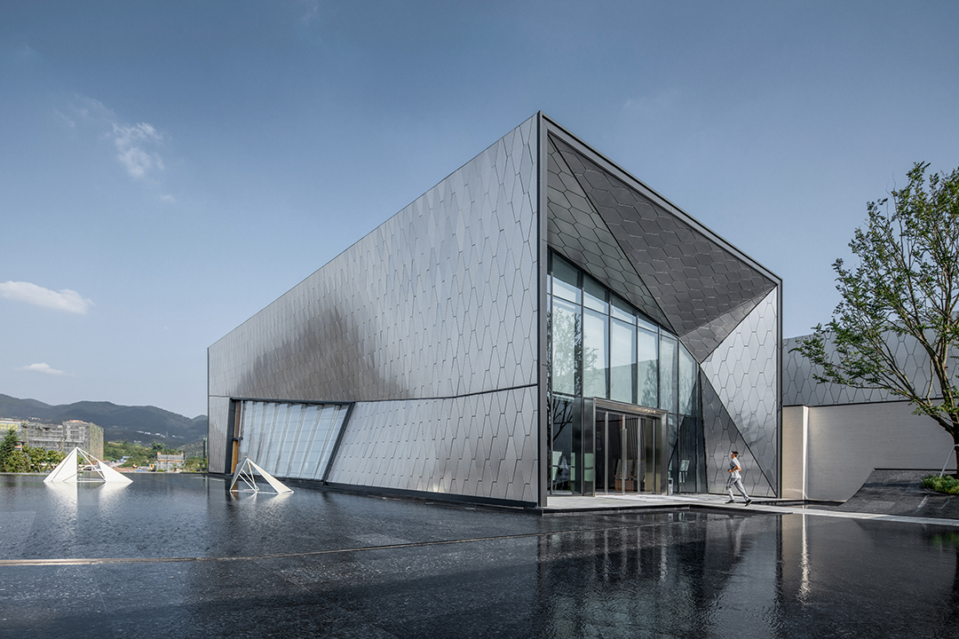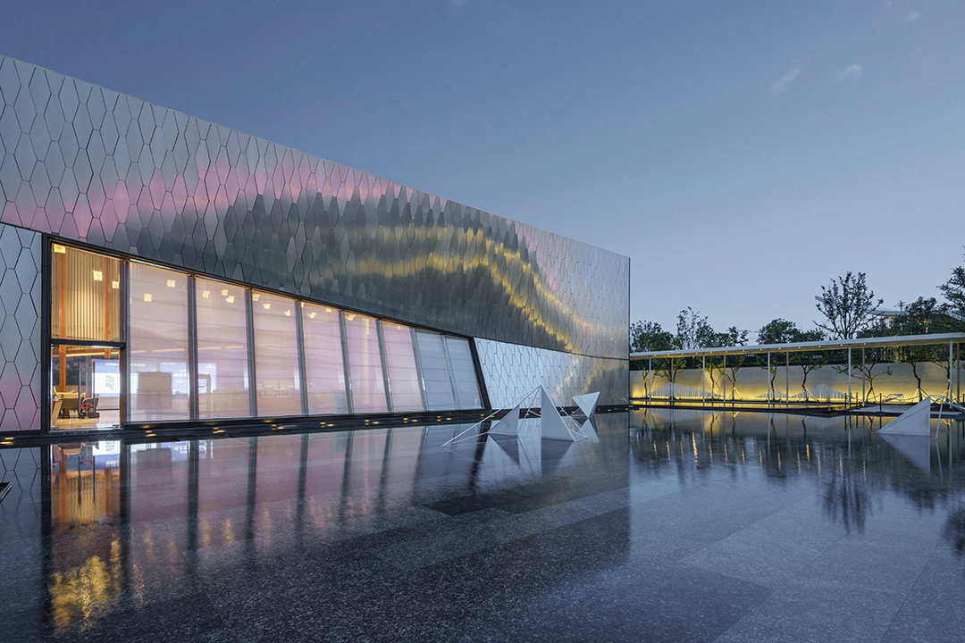 建筑师以六边形铝板作为主要界面材料,覆盖于内部结构之上。表皮顺应真实的建筑形态变化,每块蜂窝铝板精细包边,开缝拼挂,细节考究。数字化的表现手法营造出“Cyberpunk”(赛博朋克)的超时空现代感,表皮在自然光下形塑特质,追随光线的变化,产生复杂而神秘的视觉效果。