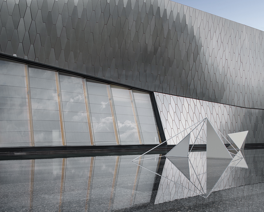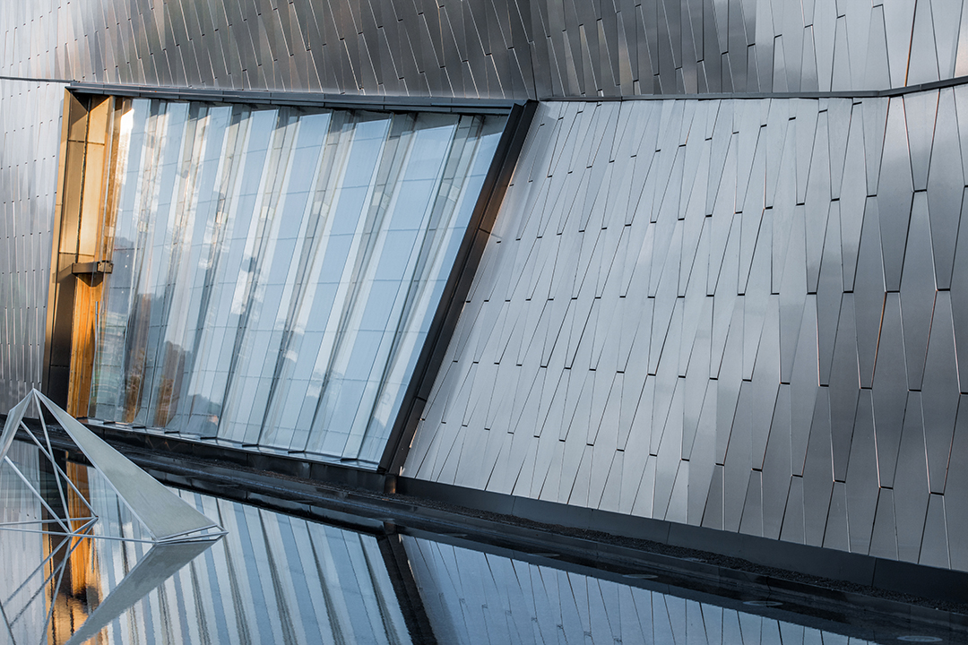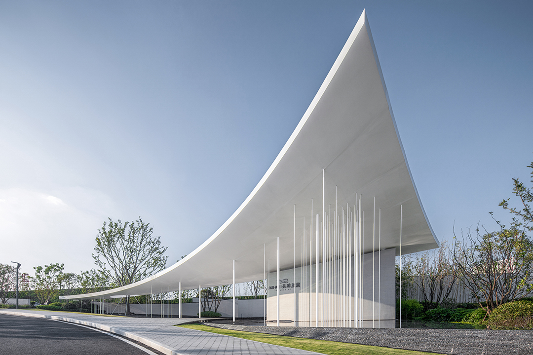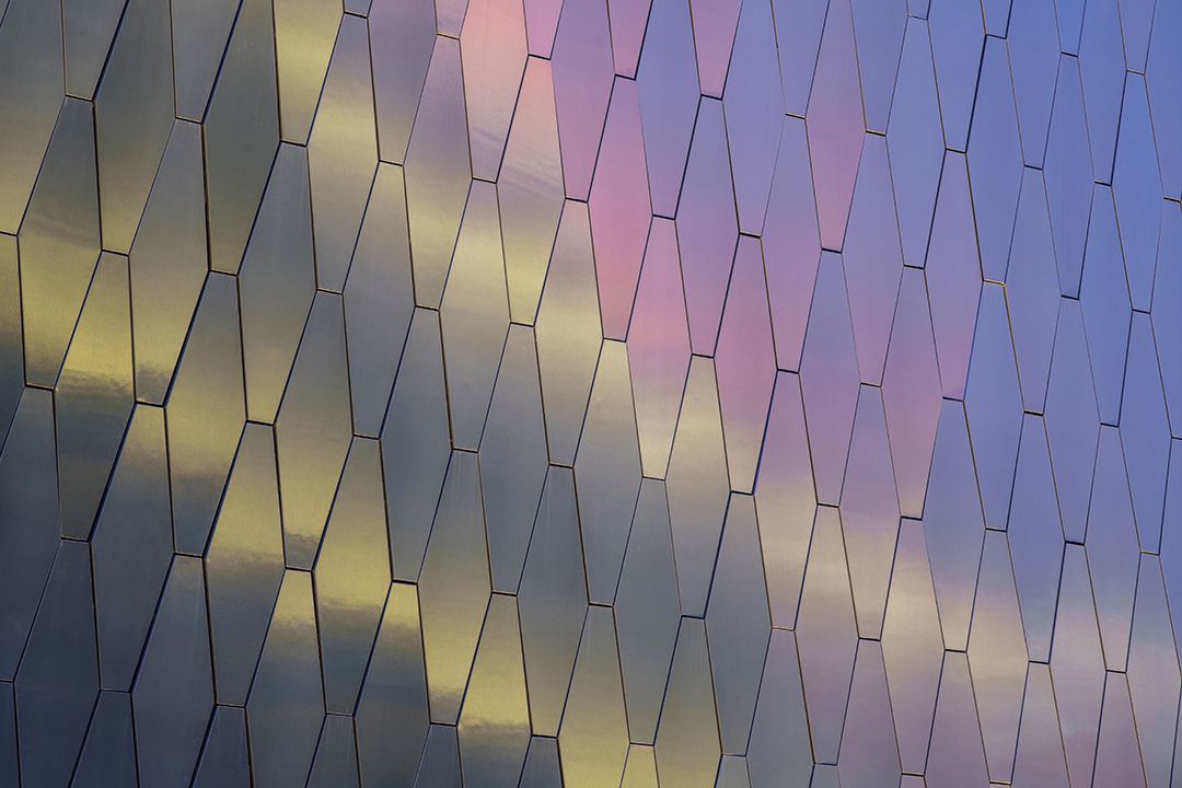 建筑师以六边形铝板作为主要界面材料,覆盖于内部结构之上。表皮顺应真实的建筑形态变化,每块蜂窝铝板精细包边,开缝拼挂,细节考究。数字化的表现手法营造出“Cyberpunk”(赛博朋克)的超时空现代感,表皮在自然光下形塑特质,追随光线的变化,产生复杂而神秘的视觉效果。