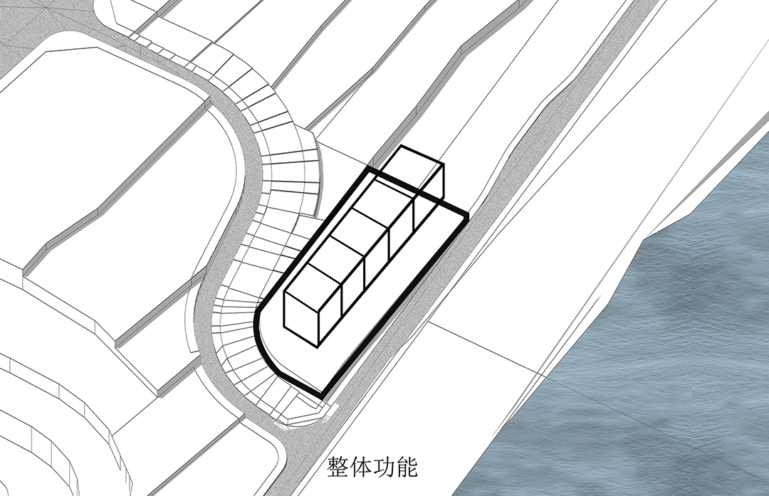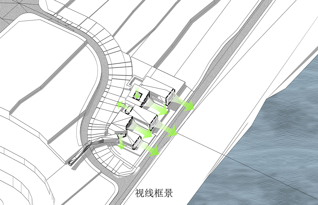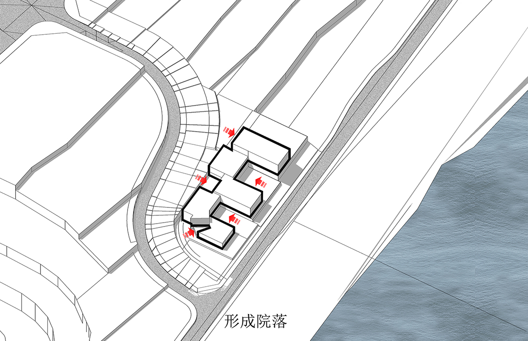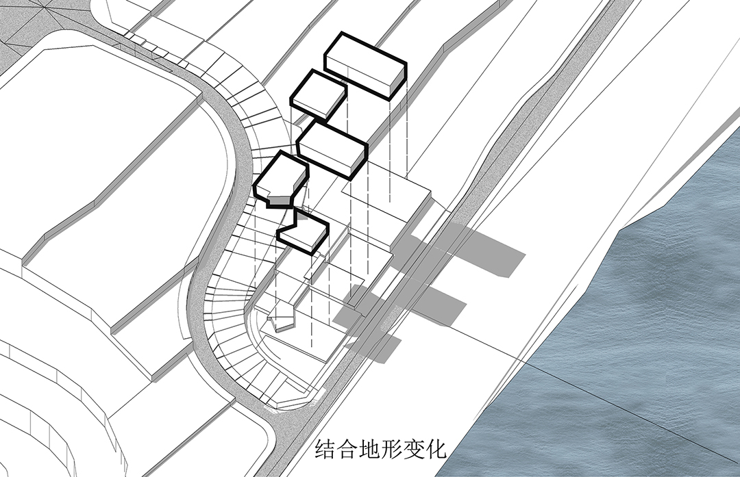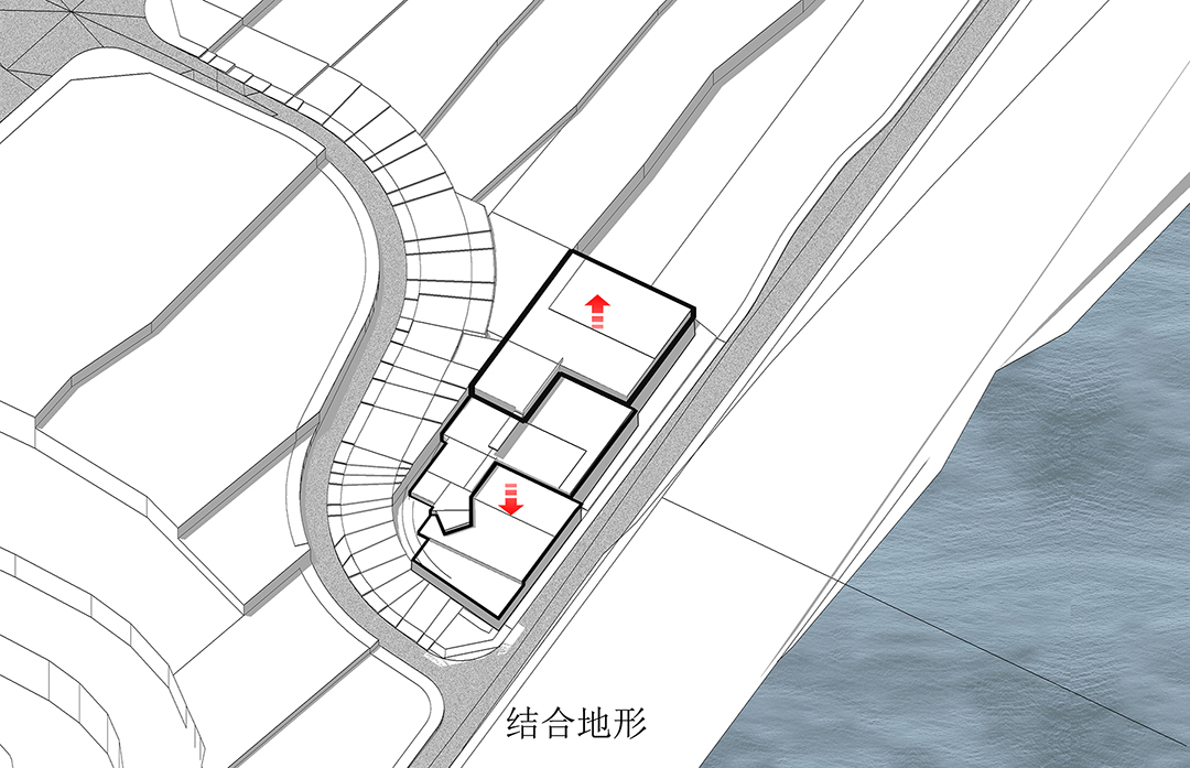 作为对环境的回应,建筑师将三个体量不同的盒子并列于山坡上,垂直于滨河道路,以期达到滨河景观及远山的最佳观赏。通过建筑与环境的互塑共生,使远山、河流、庭院、建筑重塑构成新的秩序,营造独有坡地特征的建筑群落。