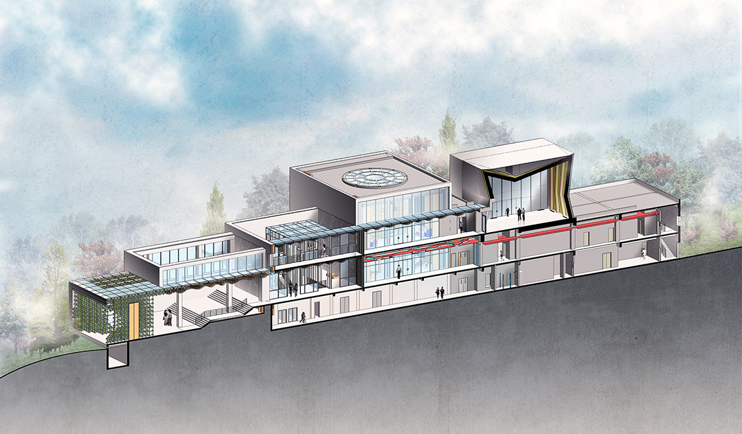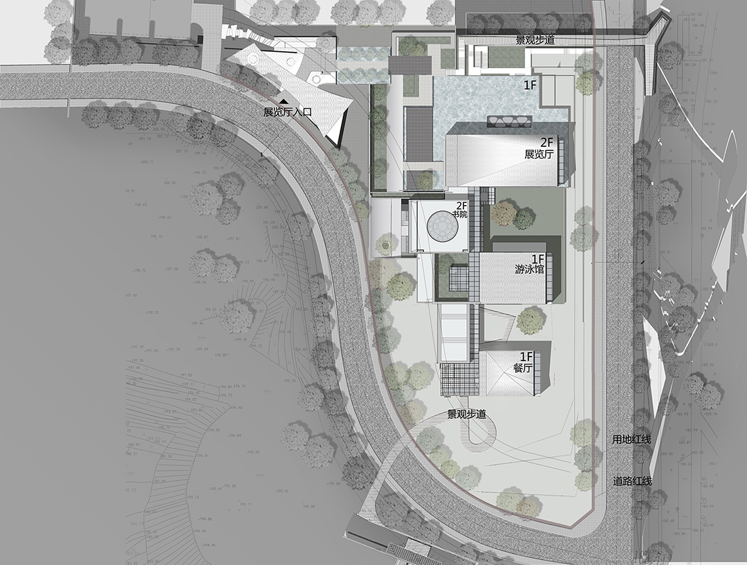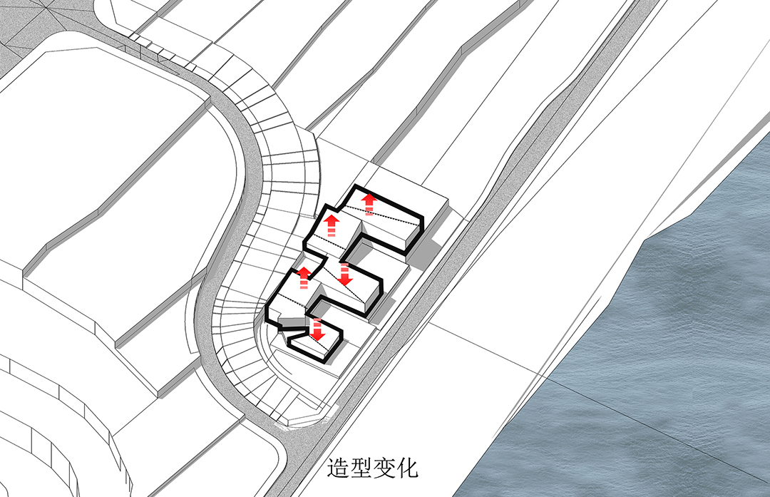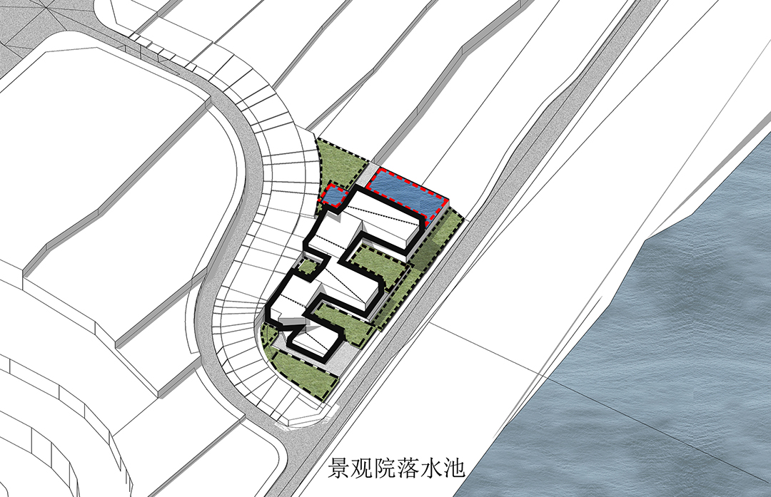 作为对环境的回应,建筑师将三个体量不同的盒子并列于山坡上,垂直于滨河道路,以期达到滨河景观及远山的最佳观赏。通过建筑与环境的互塑共生,使远山、河流、庭院、建筑重塑构成新的秩序,营造独有坡地特征的建筑群落。