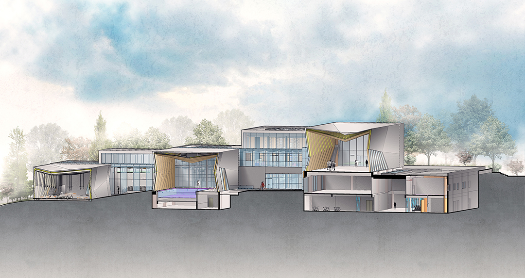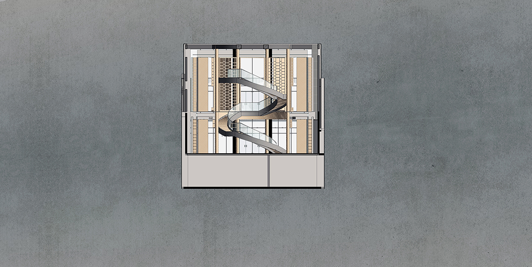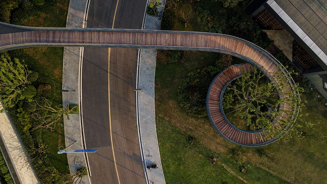 暴露的胶合木结构构件是建筑中最重要的视觉元素。建筑师以重庆传统的折坡屋顶秩序的形式语言转换成为建筑形体,抽取变化的单元模式转为结构构件,多片构件以秩序和变化排列组合,产生紧密的空间与形体的变化。