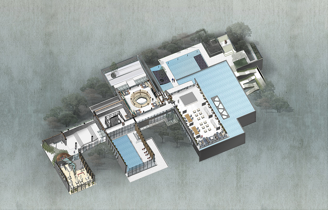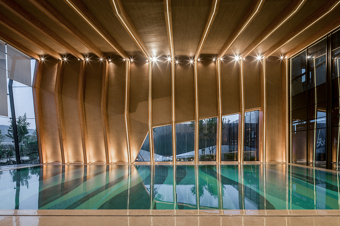 建筑师依据功能将每一个建筑空间依序形成不同的体量,展览厅、书吧、游泳池、餐厅等顺次形成多重院落空间,虚实空间的变化过渡一如中式游园,将传统中式意境融入现代空间中。