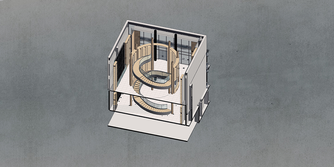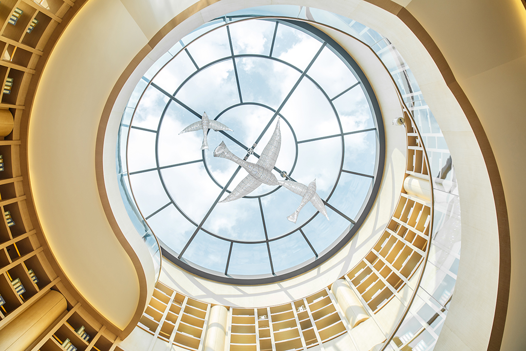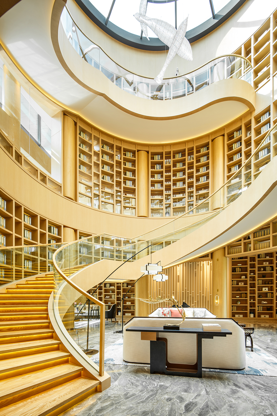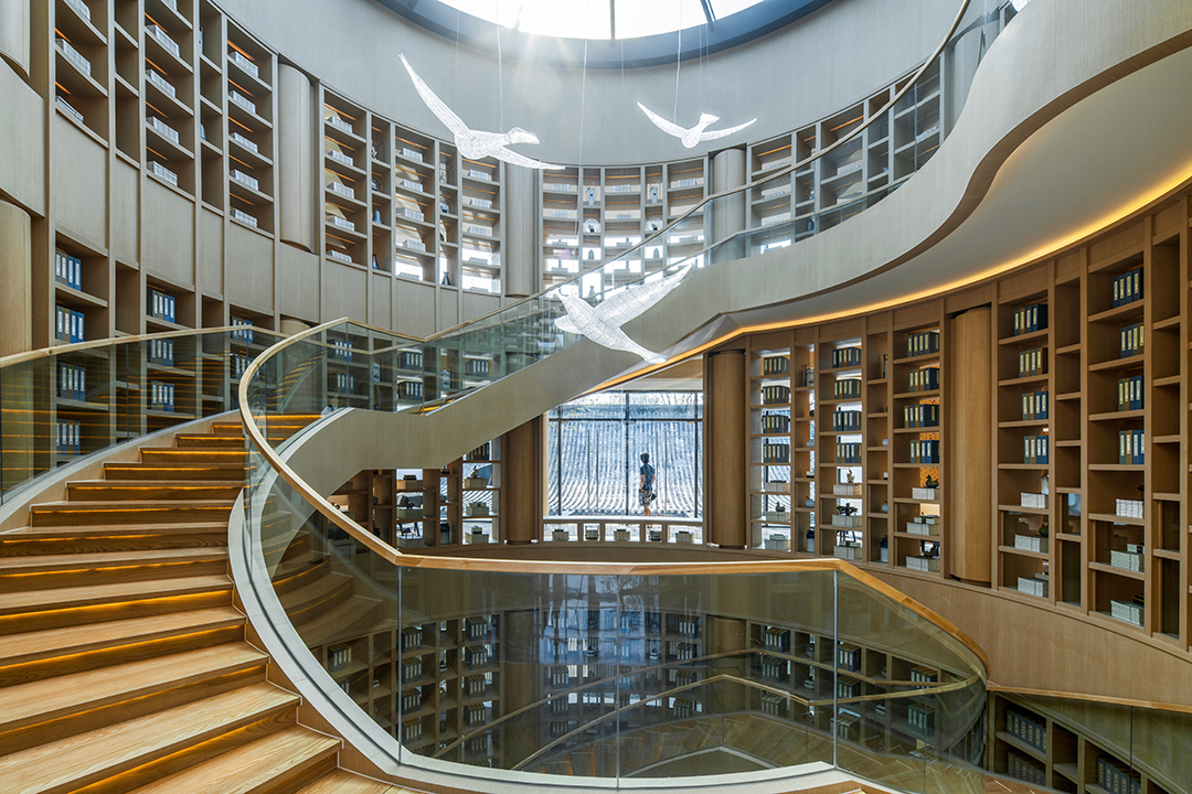 设计师将书院定义成一个能让人阅读、思考、安静下来的场所,并希望成为阅读者的场所记忆,生活方式通过书院的一呼一吸中不断进行新陈代谢。书院中旋转迂回的楼梯,书架环绕,顶部引入自然光,呈现流动灵活却有震撼力的空间,光线的变化还使读者感受到时间的游走。