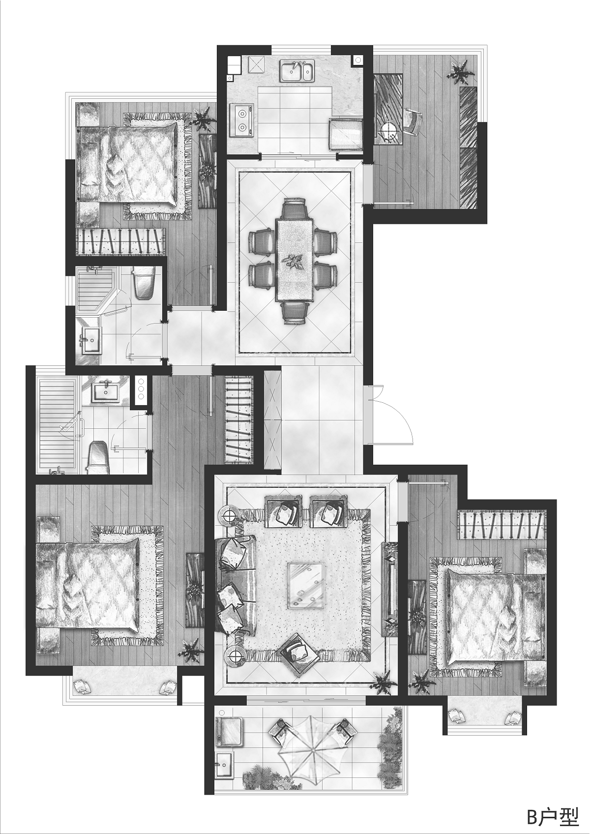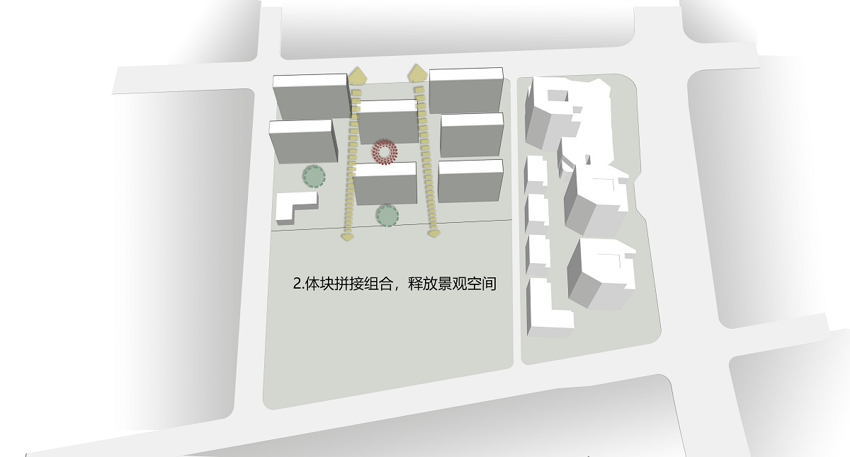 项目用地局促,面临的首要问题就是如何在较高容积率下进行合理的空间布局。为保证小区北侧入口区域一定的空间退让,满足沿城市道路界面的通透率,住宅楼栋采用错位行列式布局,并由此形成几个相互穿插渗透的庭院空间。两者之间的关系合理的处理,加强了内外之间的空间连续性。通过全区景观洄游路径的设置,实现小中见大,步移景异的空间效果。