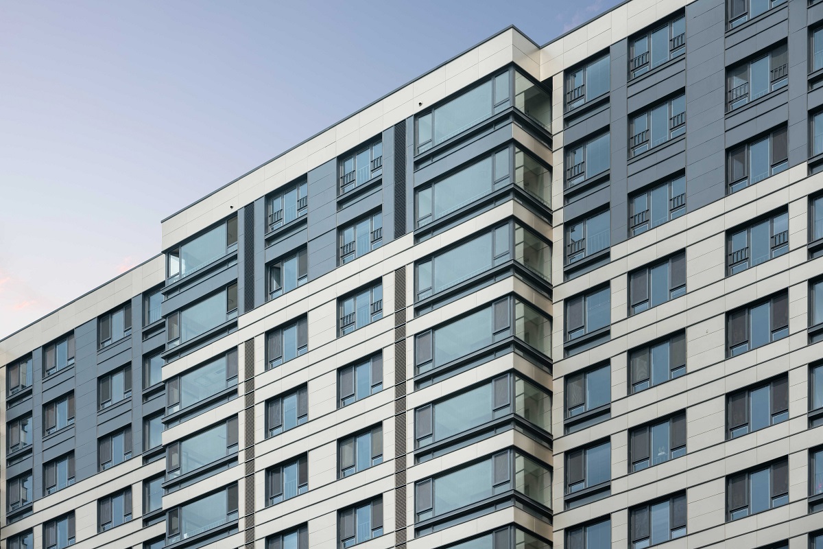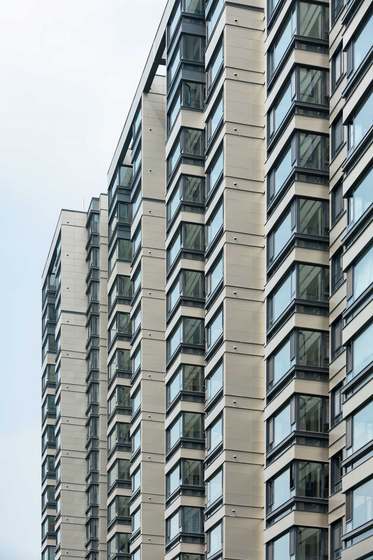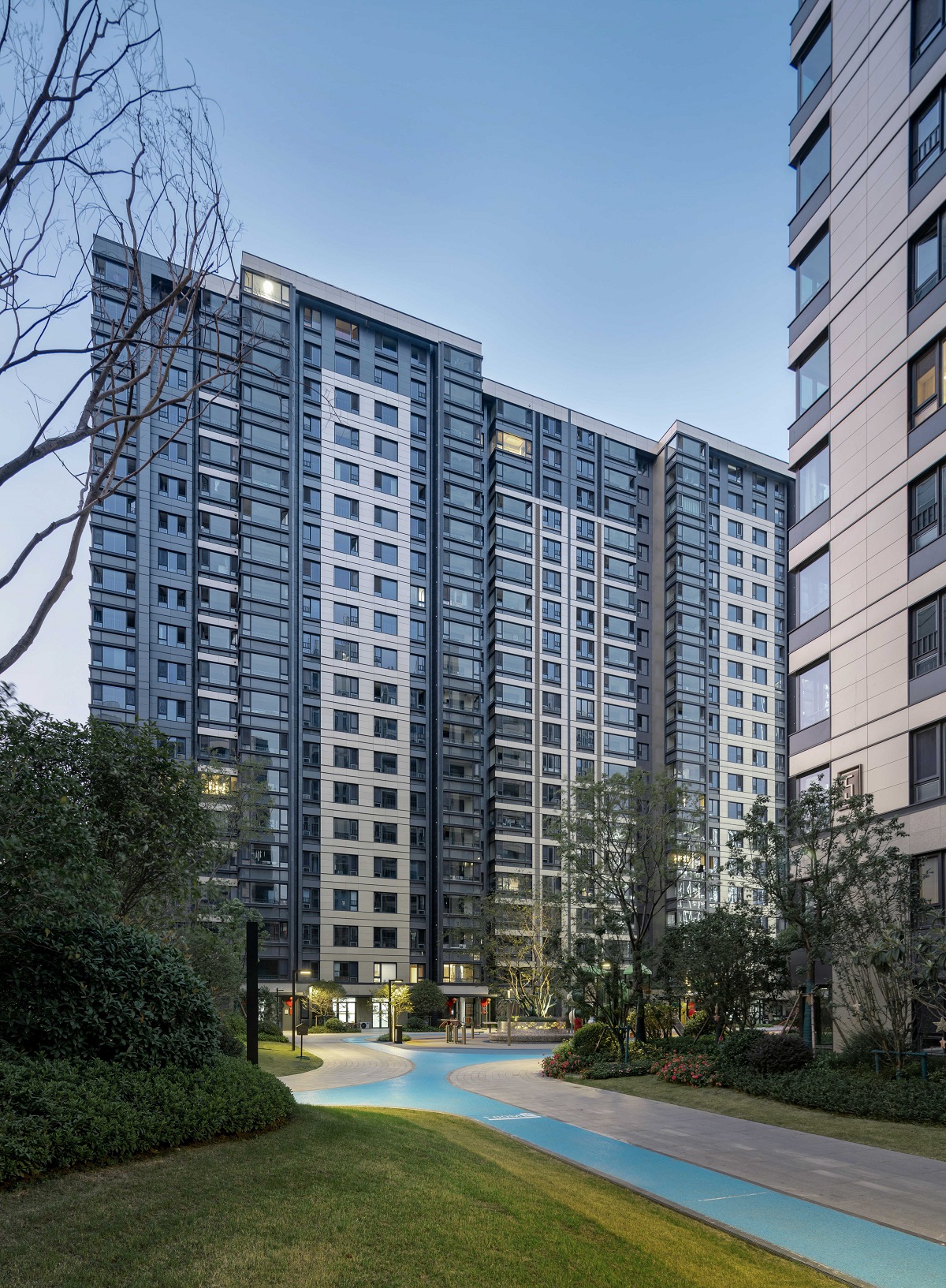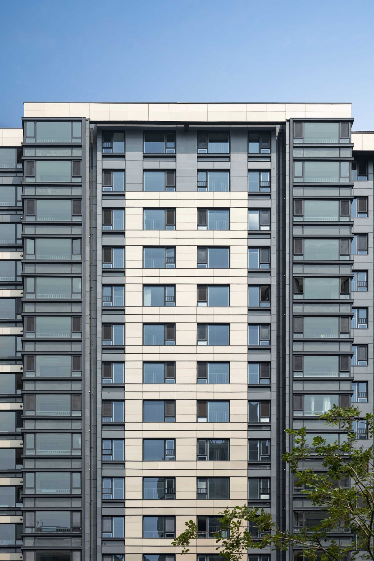 鉴于基地周边多为商办公建且临近城市干道,设计伊始住宅就已定调为公建化立面。设计团队从建筑形体的比例关系着手,引入类幕墙窗系统,在建筑整体的形体内通过虚实关系的提炼和优化,具有更明显的昭示感。最终呈现一个比例合宜、整洁、轻盈的立面效果。