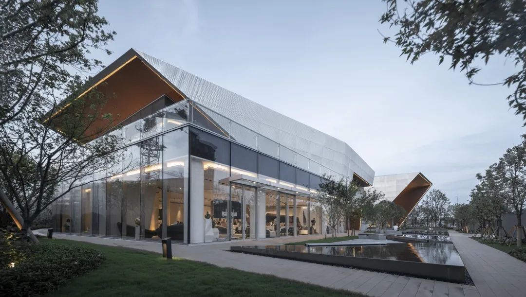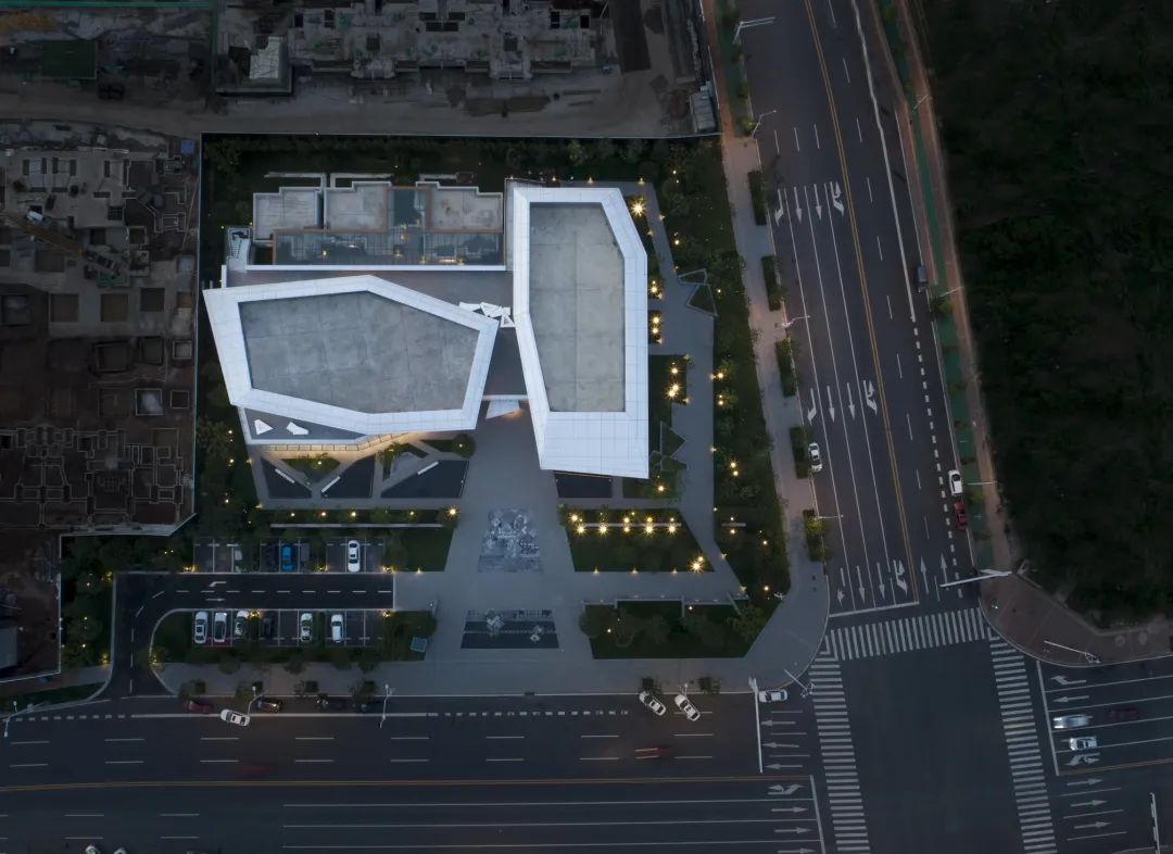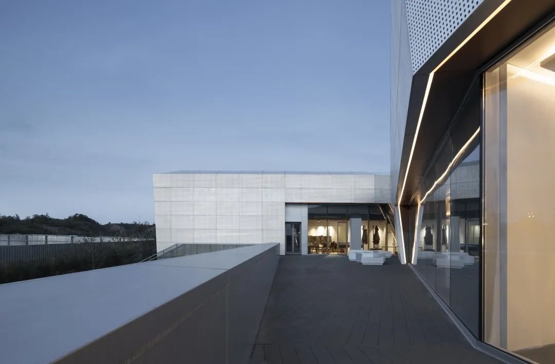 为了在夜晚照亮周界与广场,将建筑通透的玻璃面置于一层,实体的金属面置于二层,激活了内外部的行人体验。立面上仅使用3种建筑材料,纯净表皮最大化展示形态美。