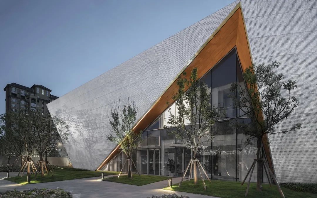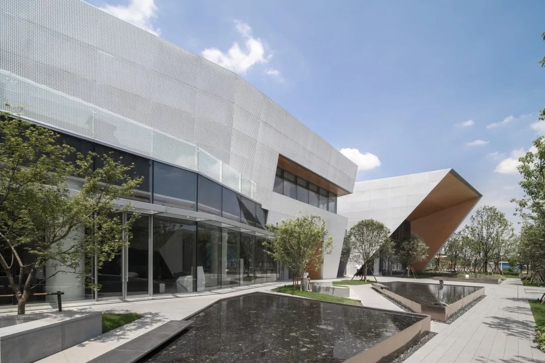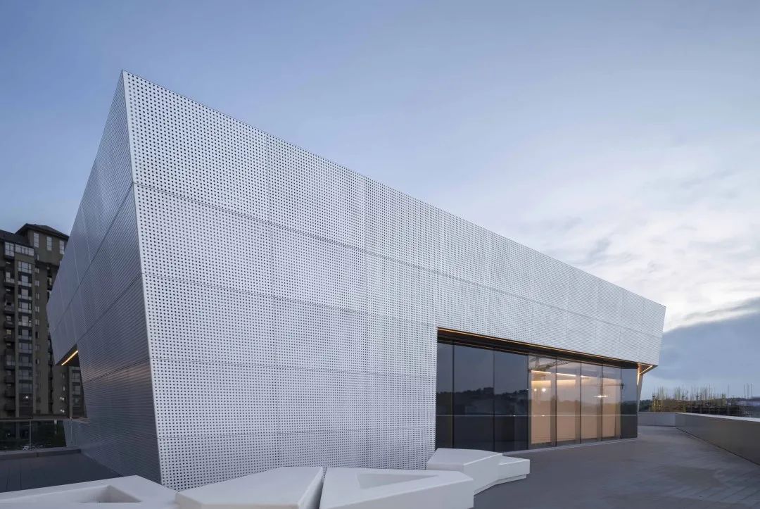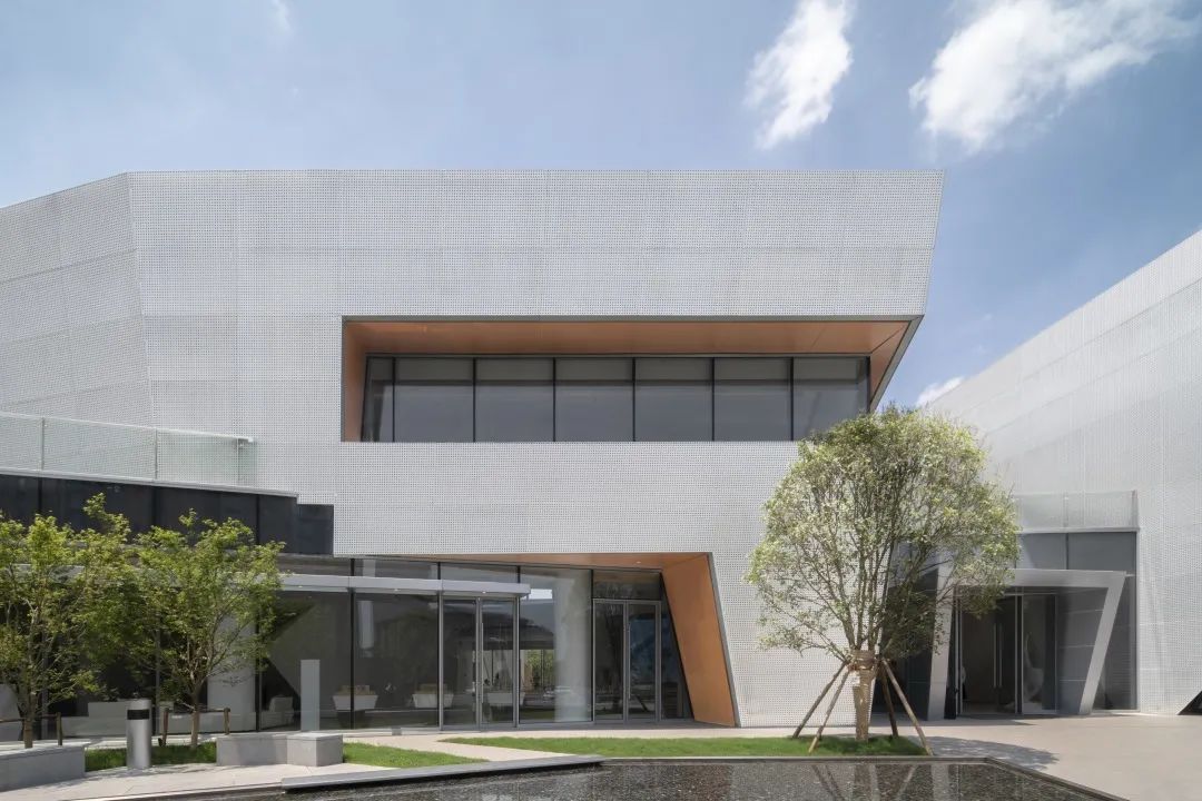 通过对体块的切割,形成前卫现代的建筑形体。大面积穿孔铝板、仿木纹铝板和玻璃体块的结合,使得整体形象极富张力和工业美感。