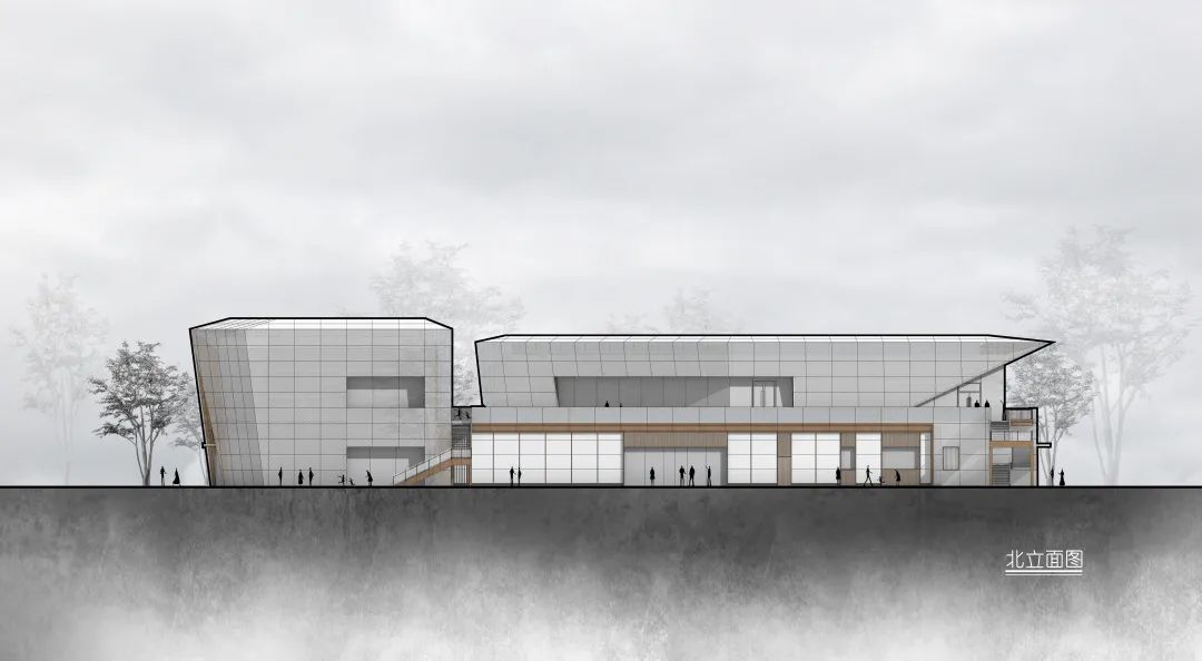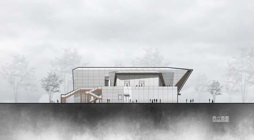 在二楼两个体块间预留预留露台空间,来访者可以到达建筑的屋顶露台,从而欣赏万丰湖湿地公园的全景风貌。并于露台预留架设天文望远镜的空间,游客可于此仰望满天繁星。