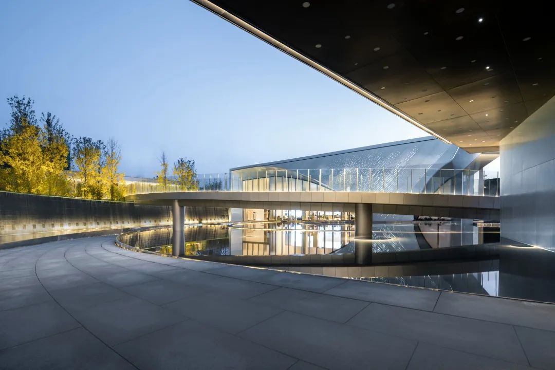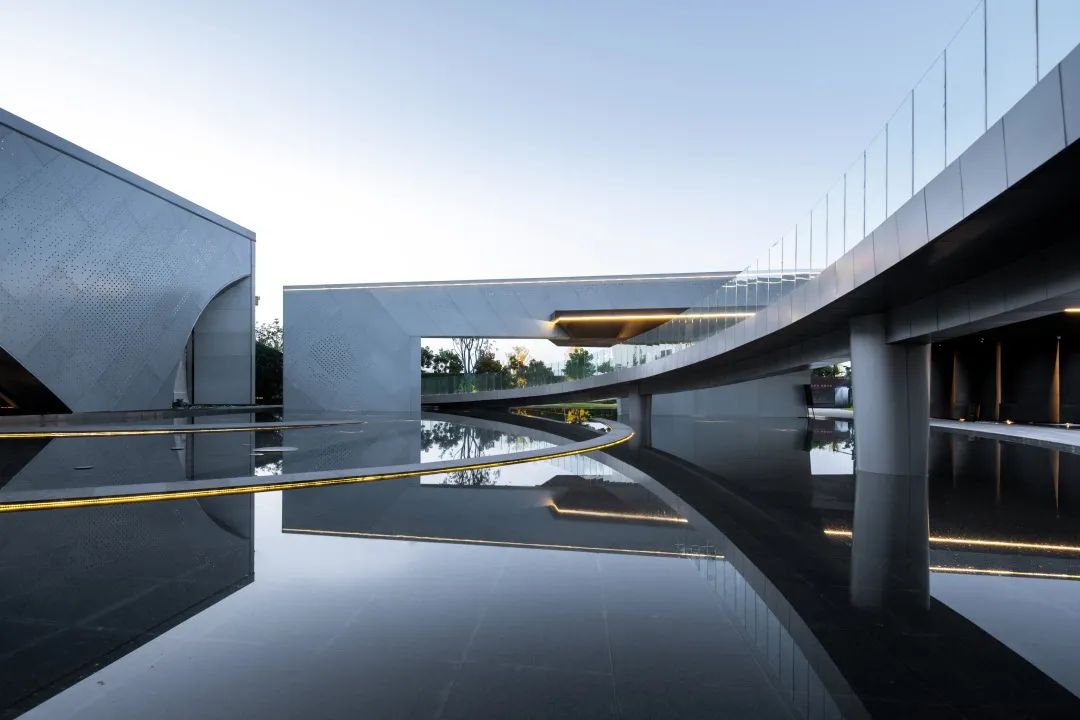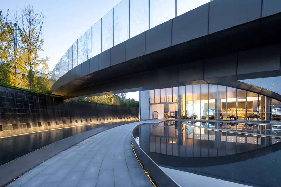 空间与视觉的连续性:立面的墙体通过艺术创作产生视觉上的肌理感,将光与影带入到空间中,微风拂过水波倒影连廊起伏,层层涟漪之上倒映出朦胧的树影与建筑。运用玻璃等半透明材料,舒朗别致的造型结构打破景观与建筑的界限,打造空间与视觉的连续性与纯净性。