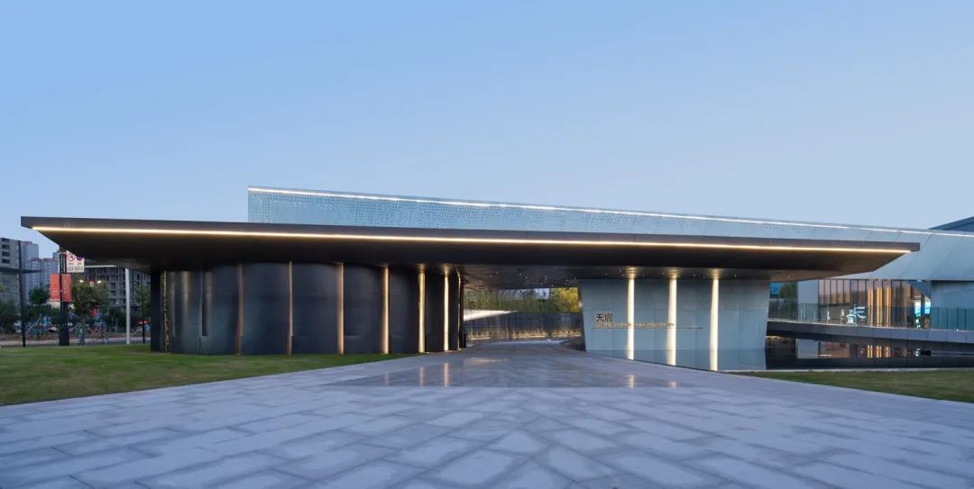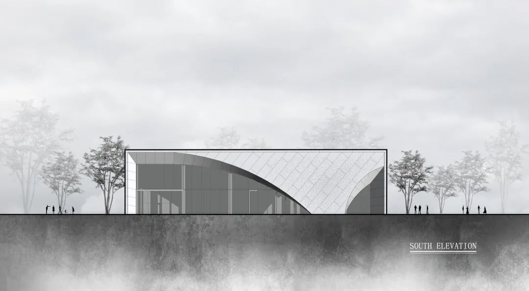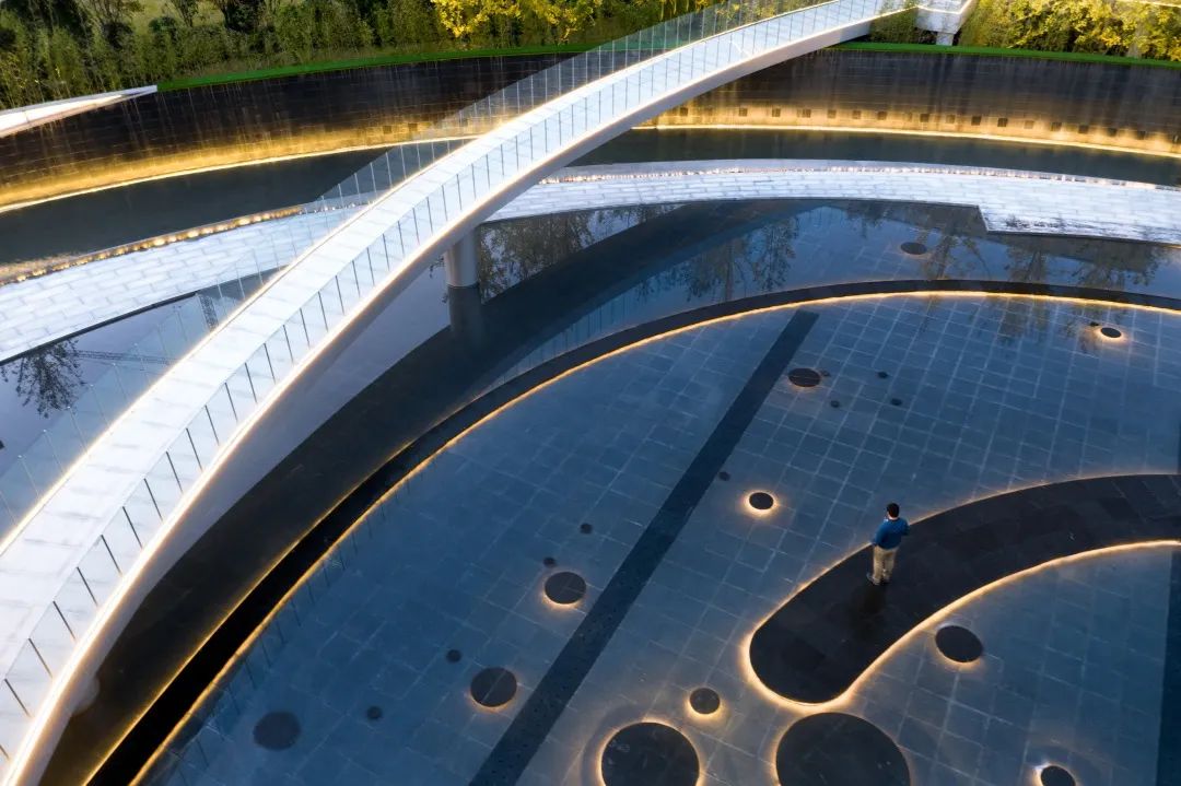 曲线形和方形的空间,与景观的廊桥相互回应。建筑立面的曲线与景观廊桥的曲线延续统一,这是一条隐性的认知流线——向上、向内、向光,悬隔日常,划过银河,回归自我。