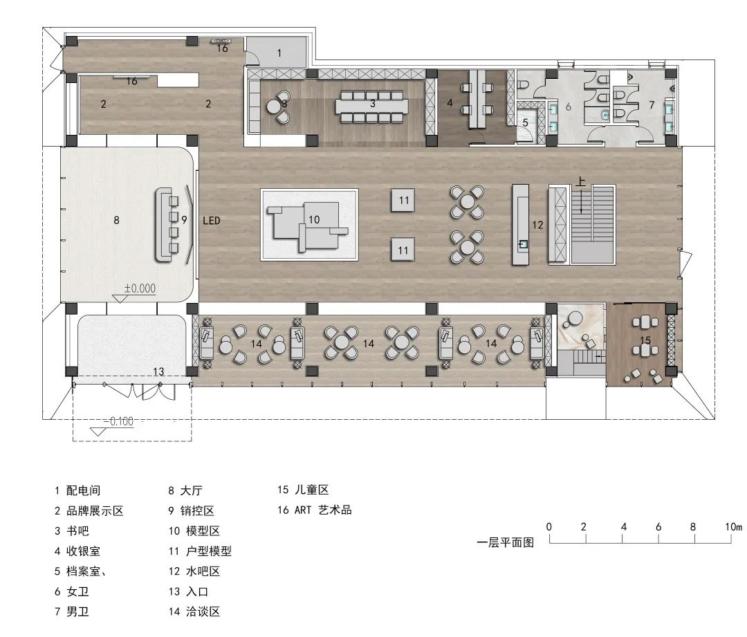 多空隙空间:挑高的回廊空间,横向的尺度将空间的线性感完美的体现。半透的玻璃界定着空间,透漏着光影与空间,同时作为载体描绘着线性构成的光的语言。充分利用灰空间实现建筑与景观的柔和过渡,使两者成为自然而有机的整体。