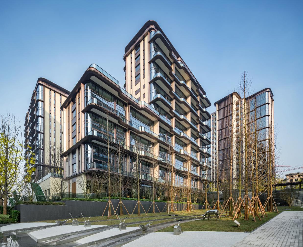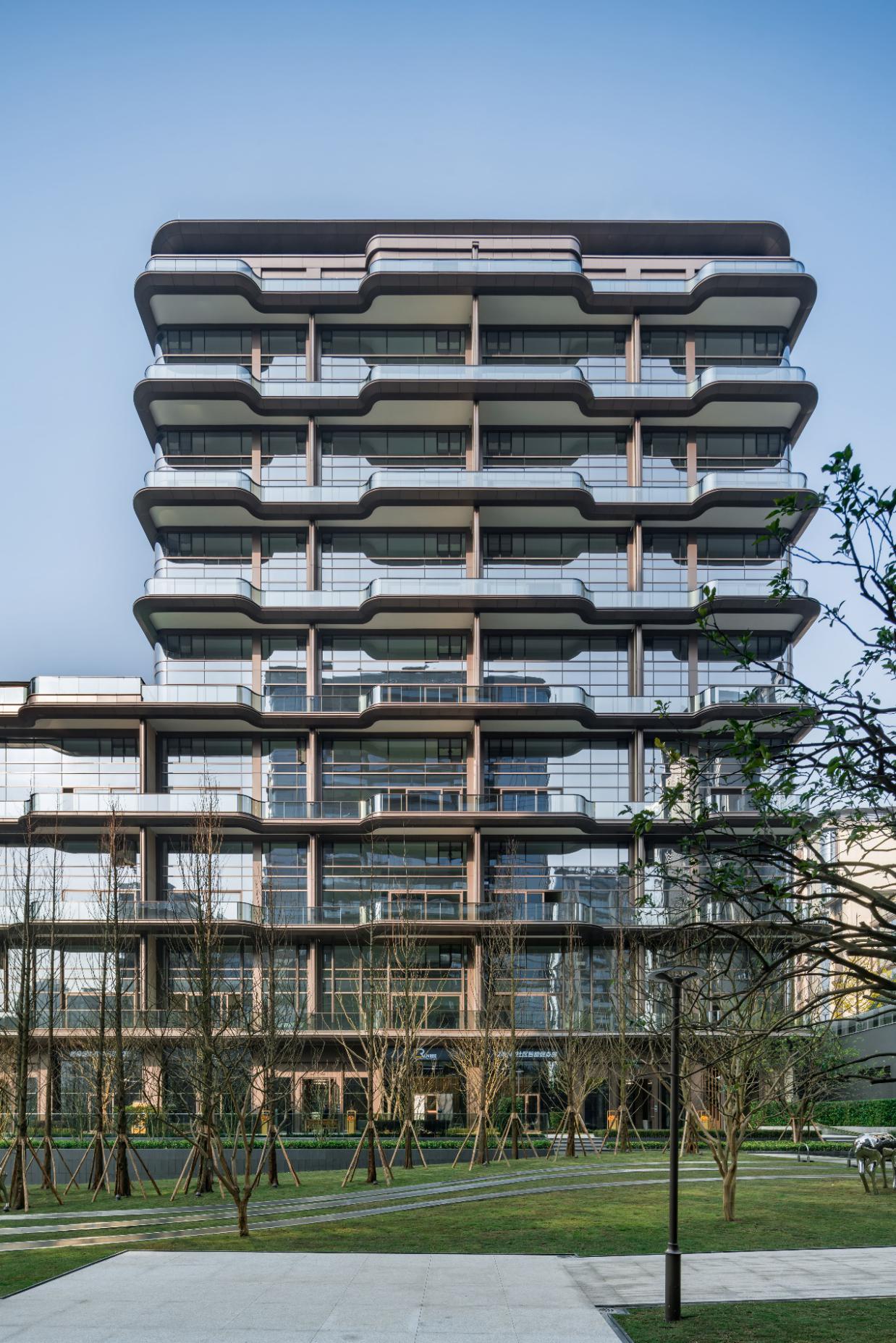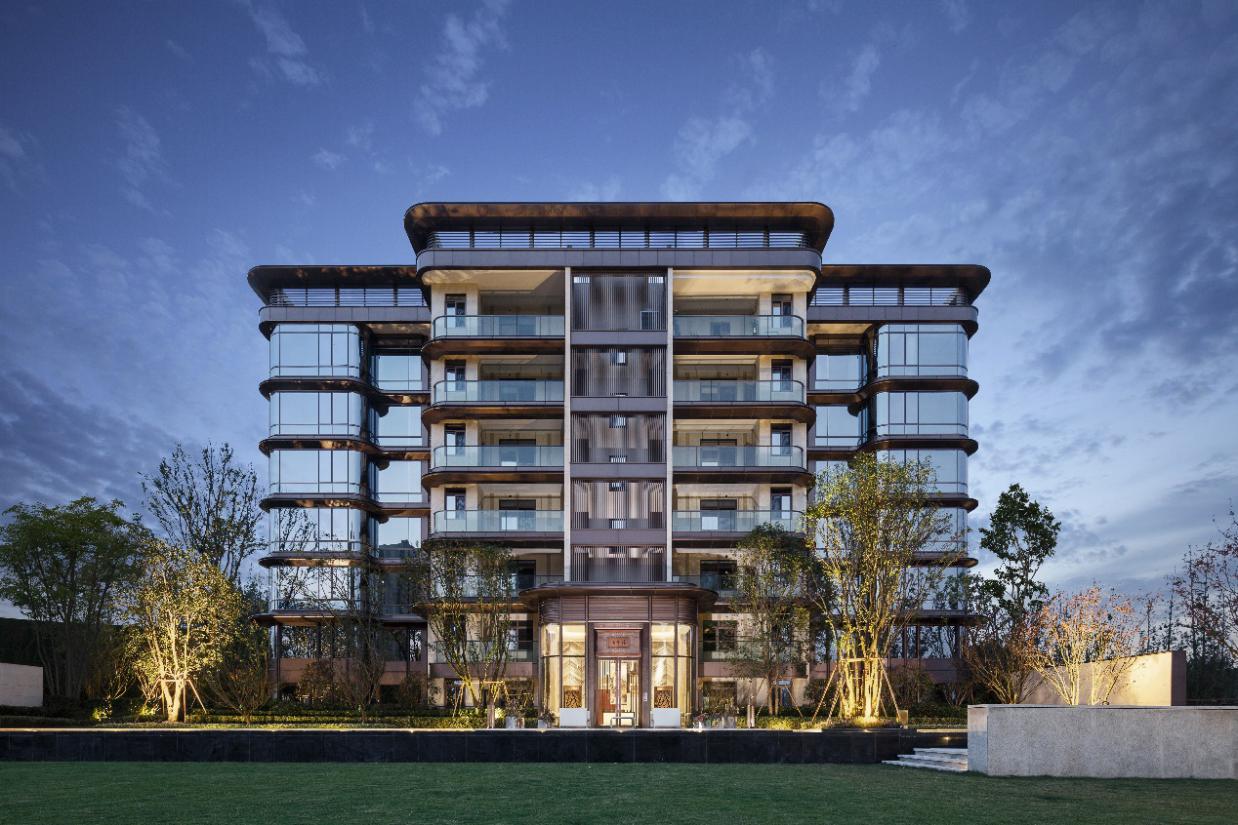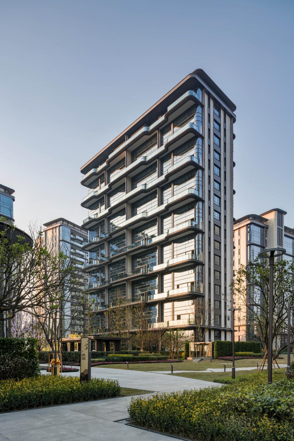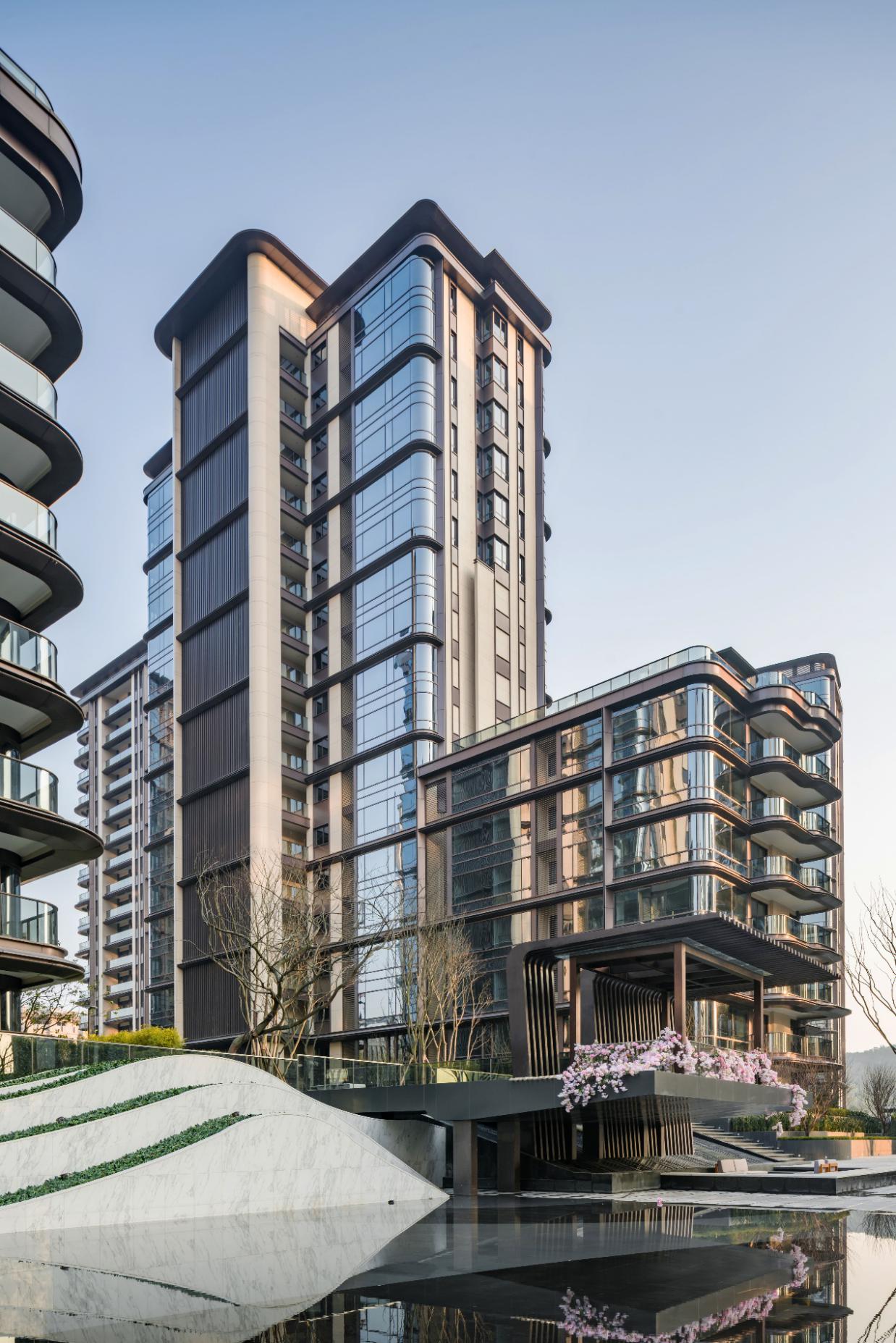 外立面设计上引用藏山纳水的设计理念,形态上舍弃了传统住宅的刚正形象,采用弧形立面设计,将山的刚毅,与水的柔和完美演绎,宛如生长在照母山上的植物一般,充满生命力。