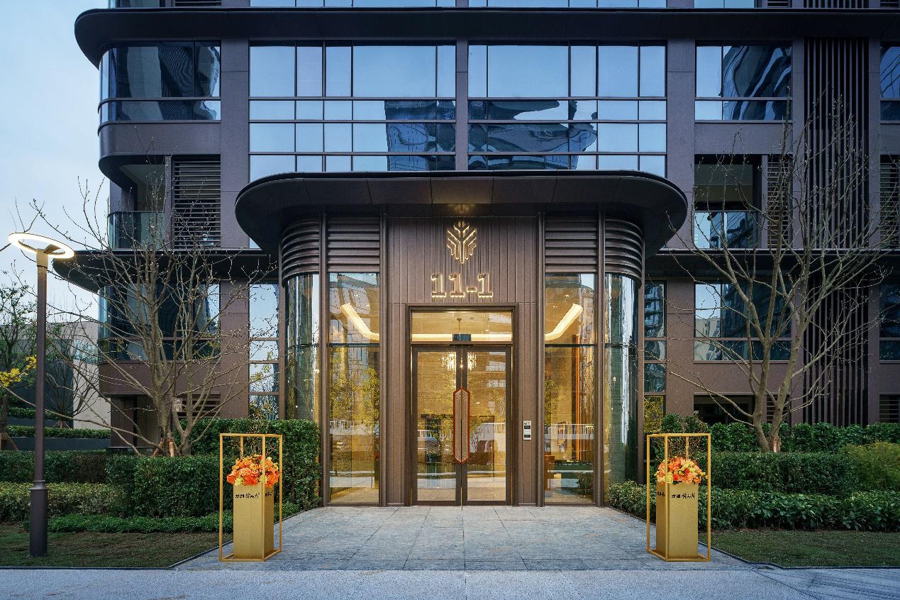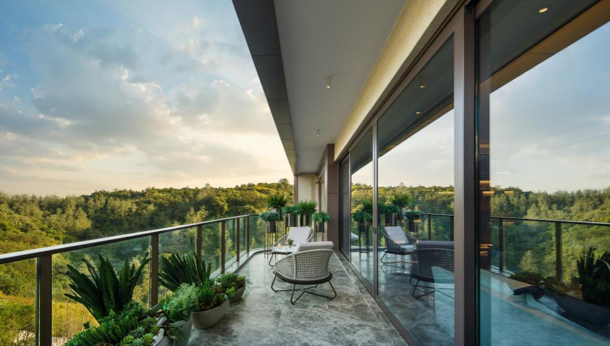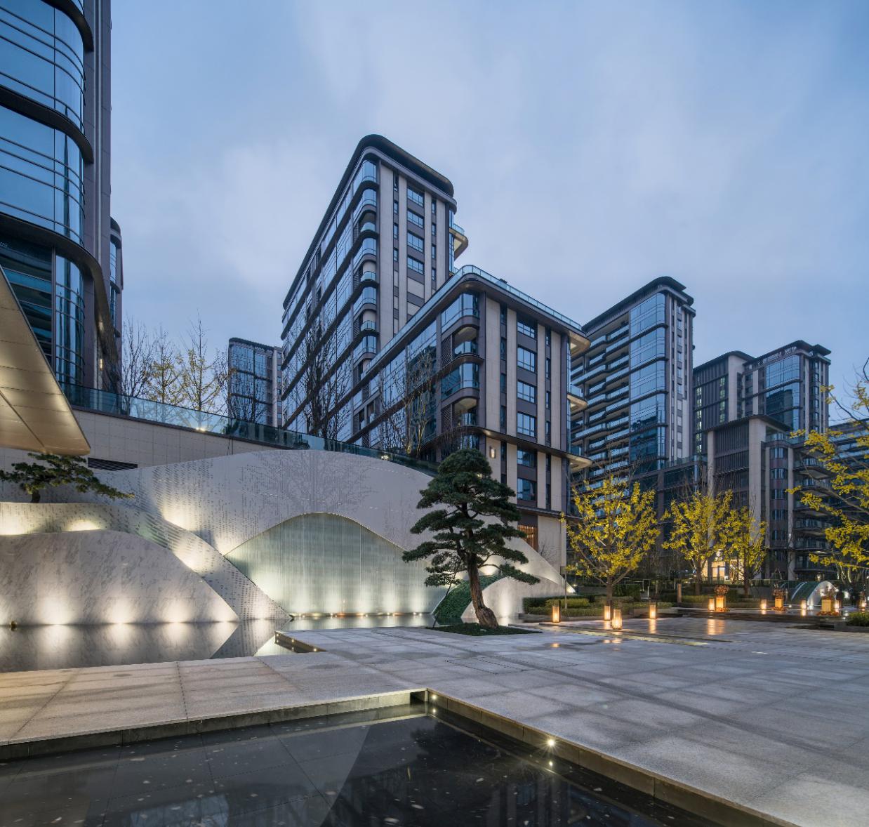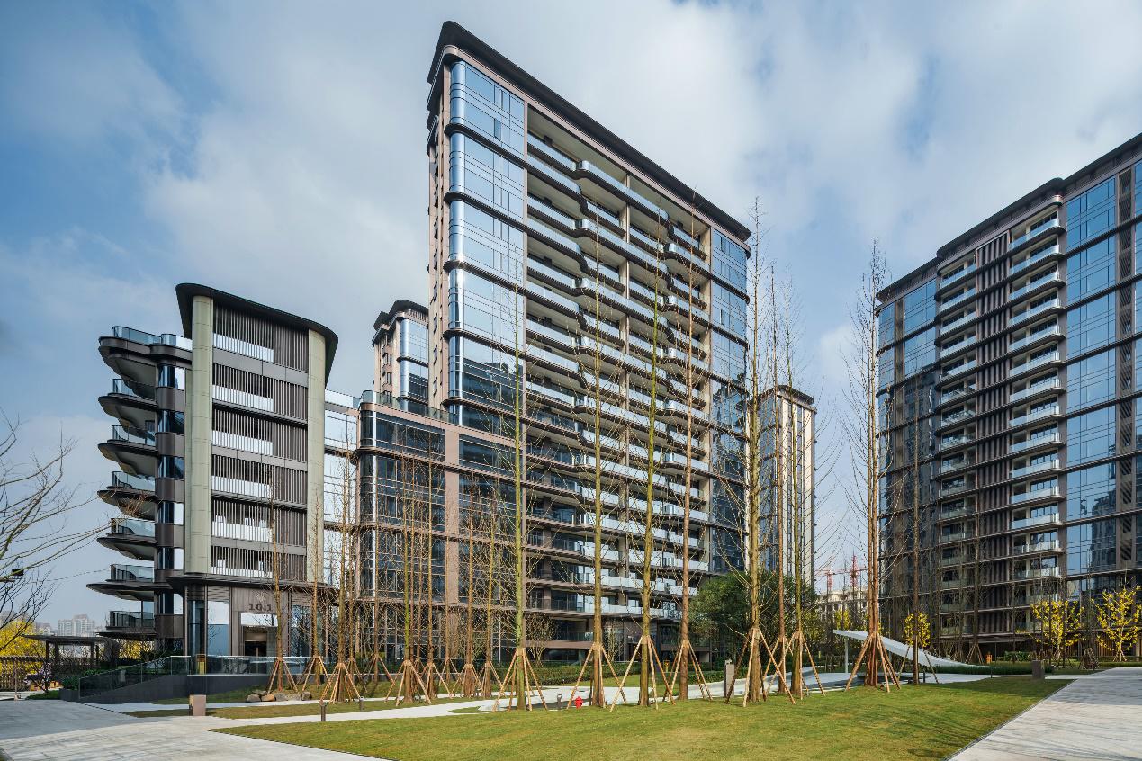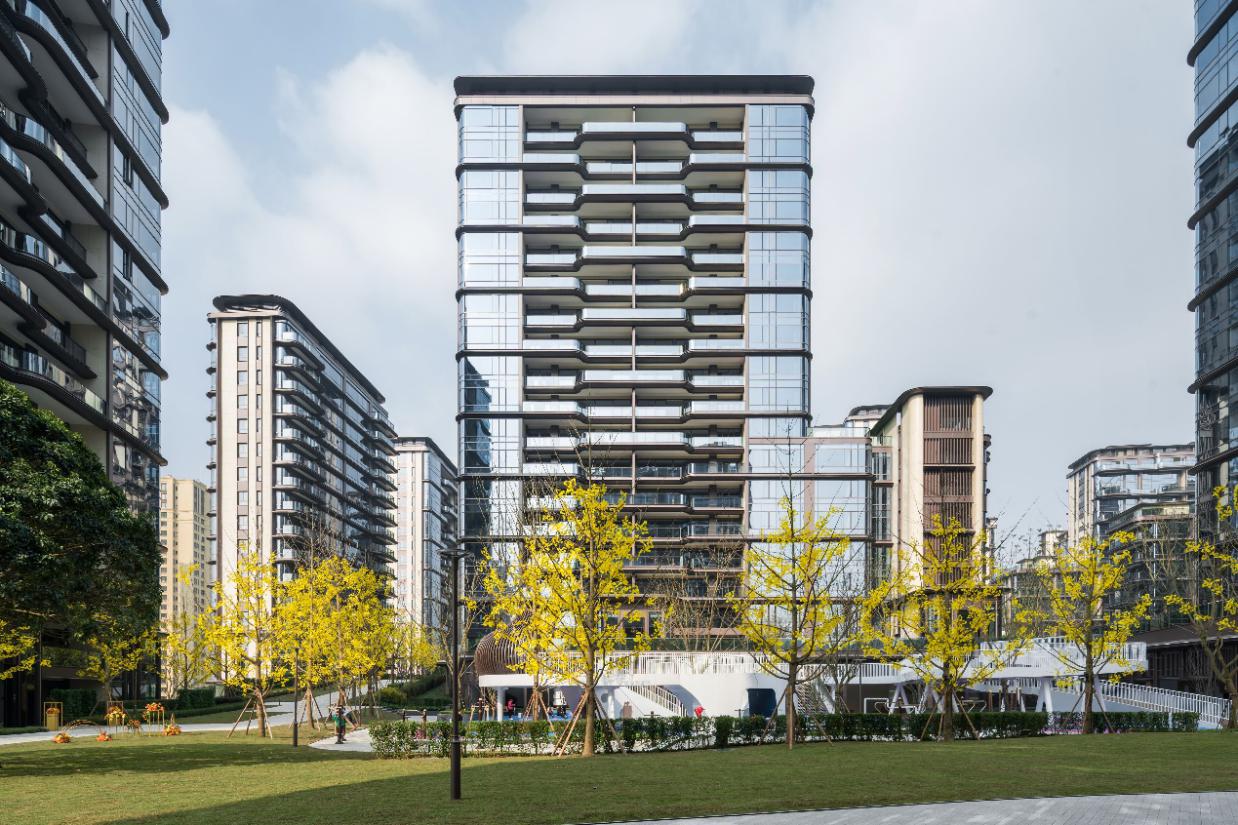 外立面设计上引用藏山纳水的设计理念,形态上舍弃了传统住宅的刚正形象,采用弧形立面设计,将山的刚毅,与水的柔和完美演绎,宛如生长在照母山上的植物一般,充满生命力。