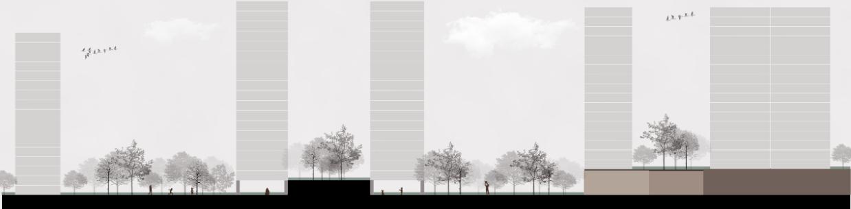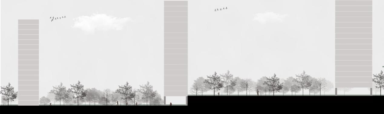利用多个架空层、平台、电梯等设计消化场地内的高差。架空层内部设计合理人居场景,绿色和生态的结合,在每一个架空层内规划了与生活功能相关的场景应用,从而形成一个“mini生活mall”。
