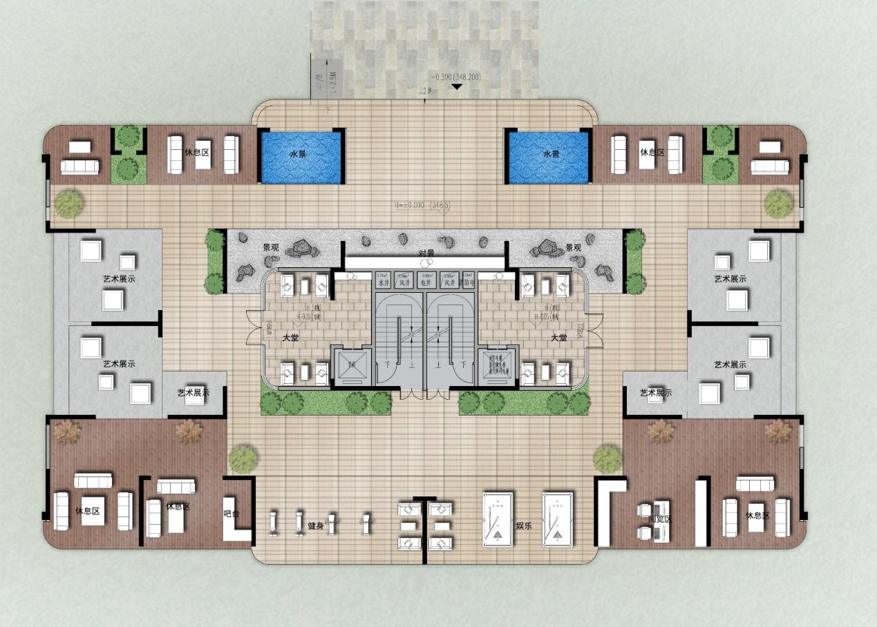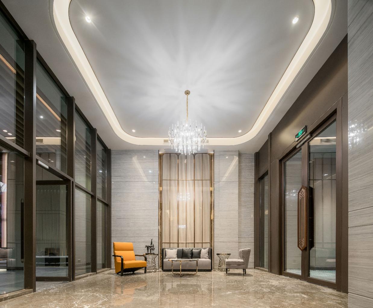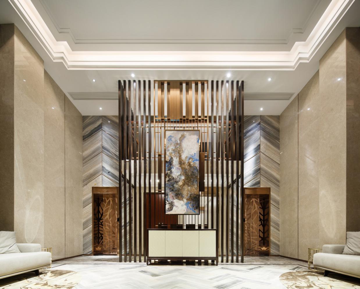 在入户大堂设计中,用精工打造出有“温度”的建筑空间,6米挑高来营造入户大堂的舒适感,即便是从山水里进入室内,也怡然自得。地面和墙面都是拼花的石材铺就,不会因室内而失了尺度。