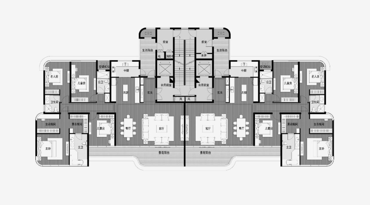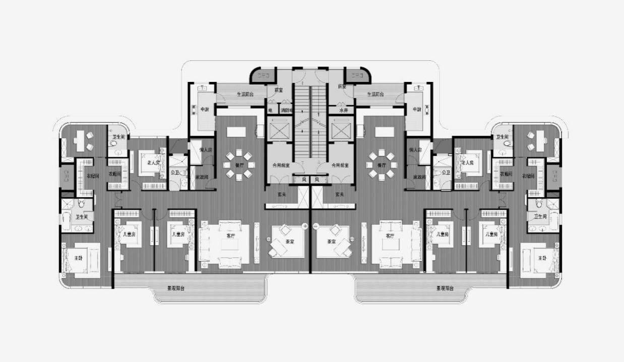 “当人类用感情和希望去创造一样东西,那一样东西就会被赋予灵魂。” 设计师对于居住人群生活方式的研究,利用空间设计不仅使家庭活动紧密团结,又给予各自私密空间。起居室的比例安排、对空间的正式与非正式程度的感知及入口空间的位置都是设计师在理解人类的生理和心理行为后所确定的。9米横厅,2米阳台,弧形转角窗都为居住者提供最佳景观条件。