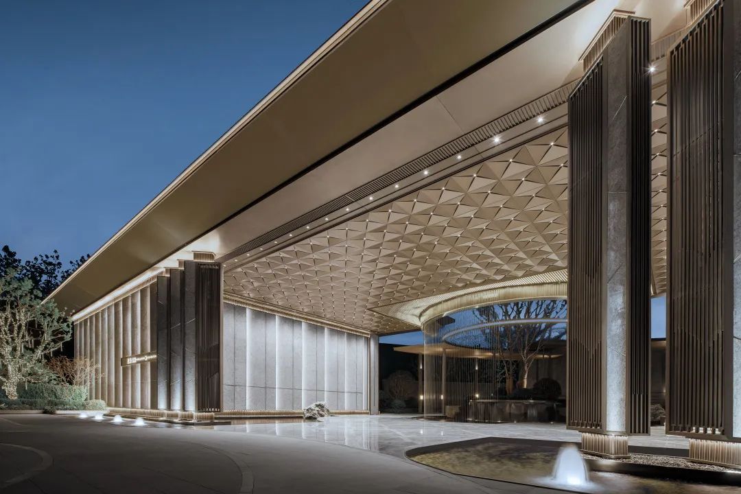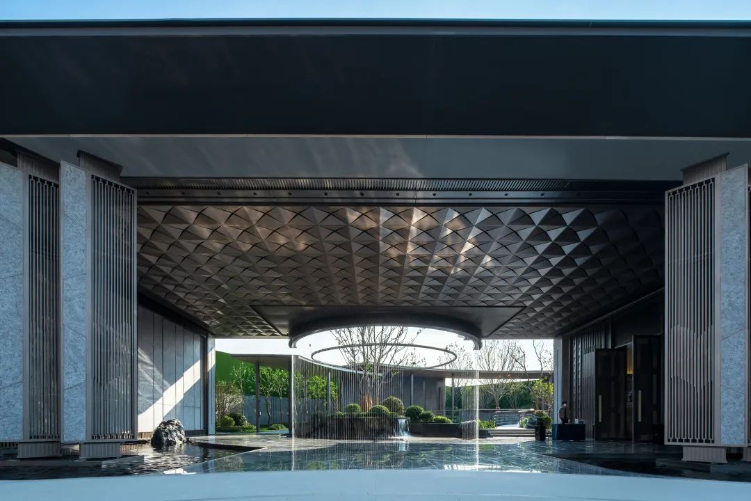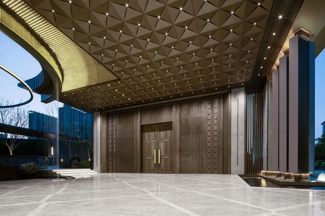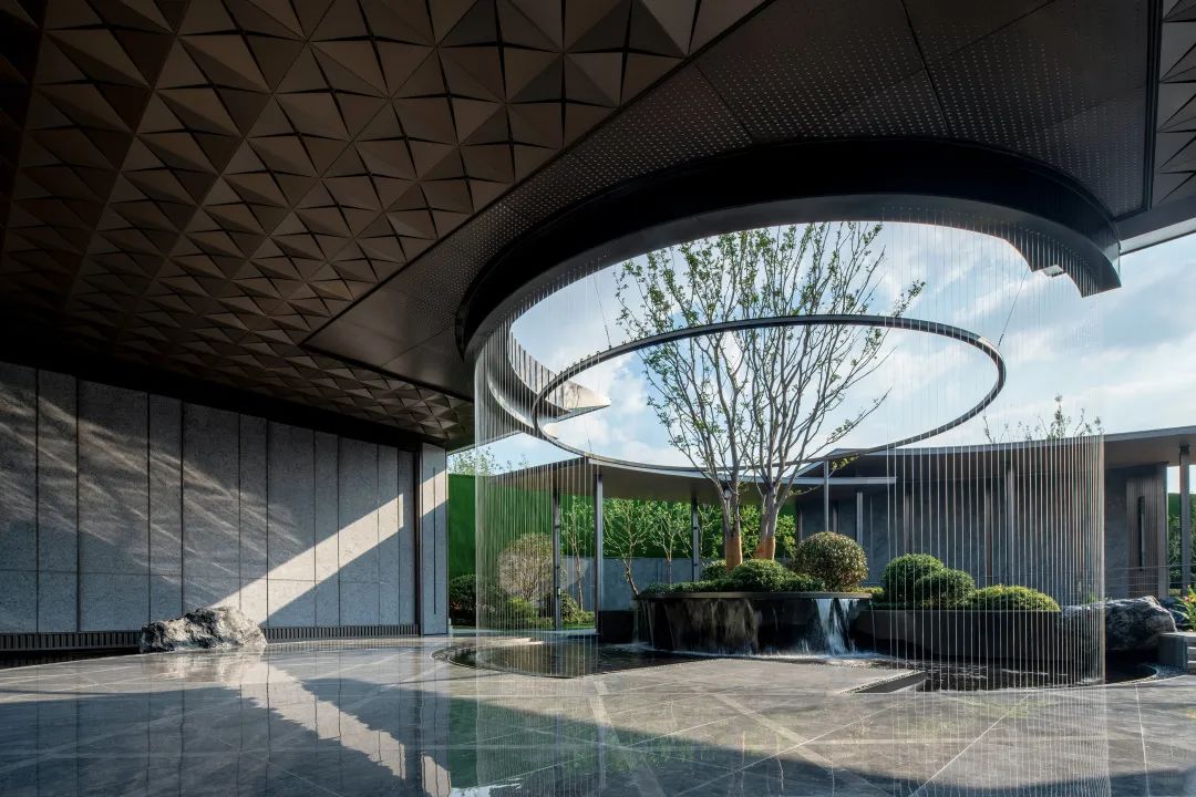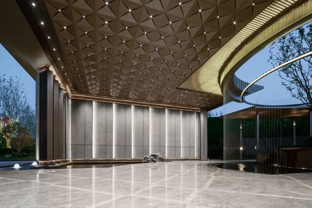 揽境倾向于现代化的艺术表达方式,约38m酒店式星空门头和巨型迎宾水瀑缔造高端奢雅的酒店式氛围,依照黄金分割弧线切入的天空消解了暗色、材质与体量带来的压迫感。