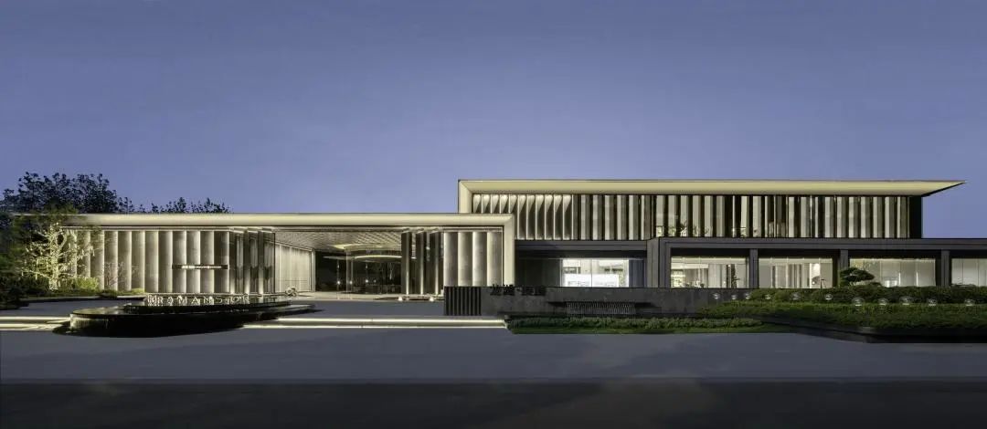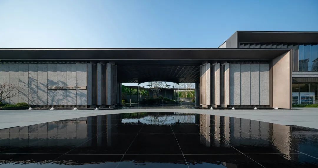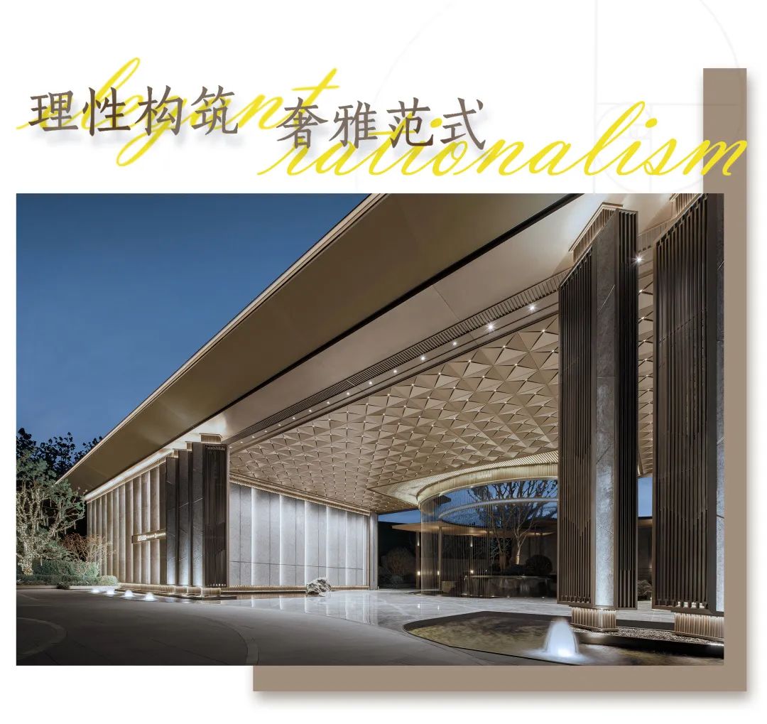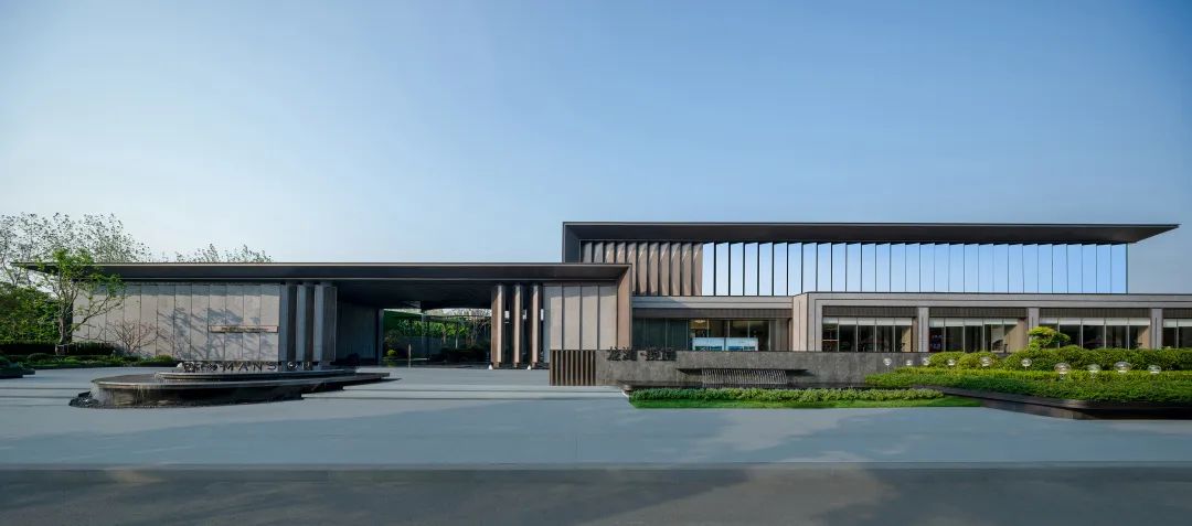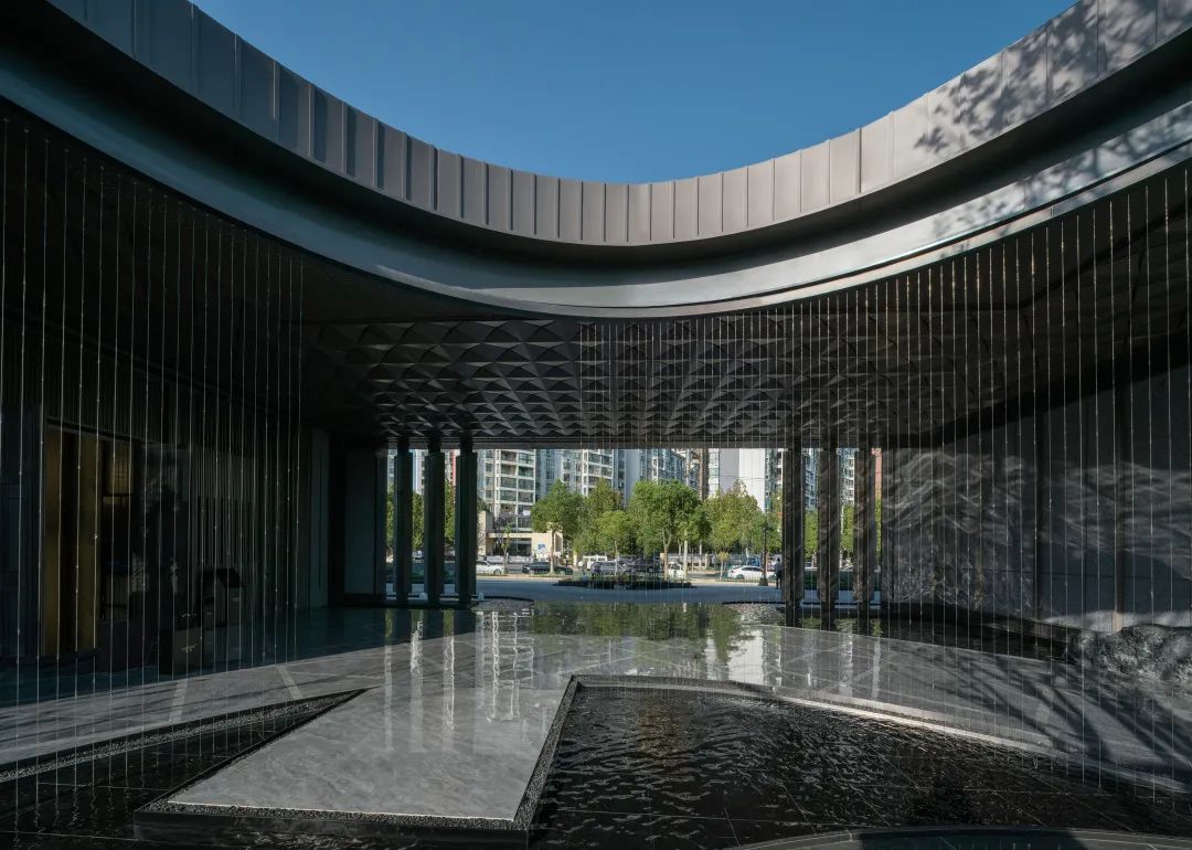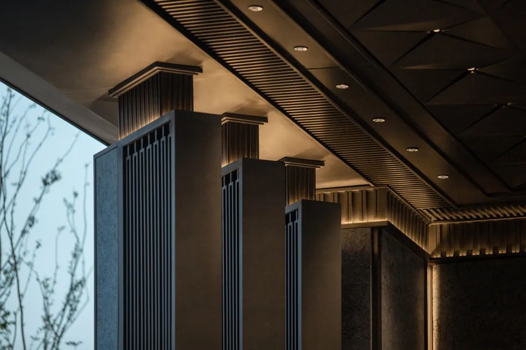揽境倾向于现代化的艺术表达方式,约38m酒店式星空门头和巨型迎宾水瀑缔造高端奢雅的酒店式氛围,依照黄金分割弧线切入的天空消解了暗色、材质与体量带来的压迫感。
