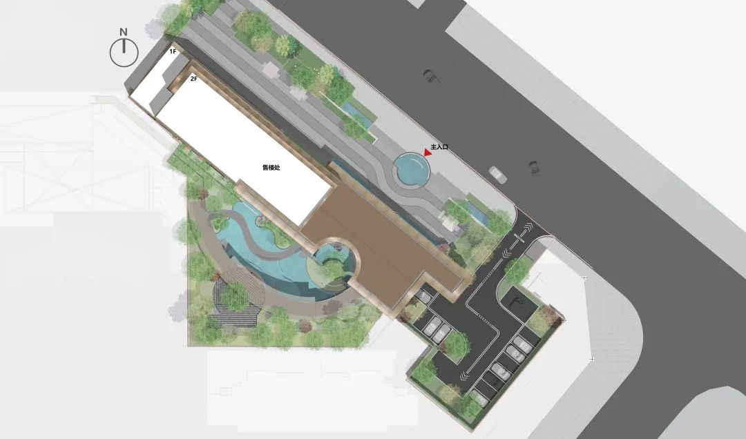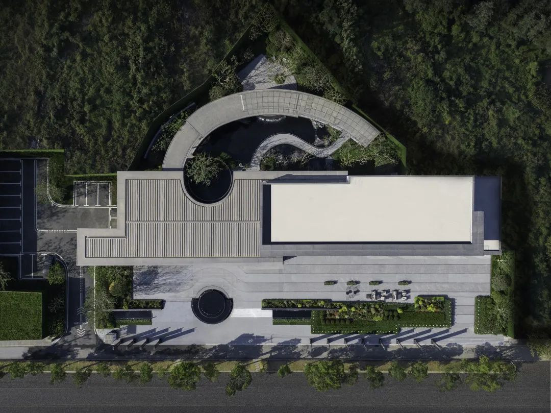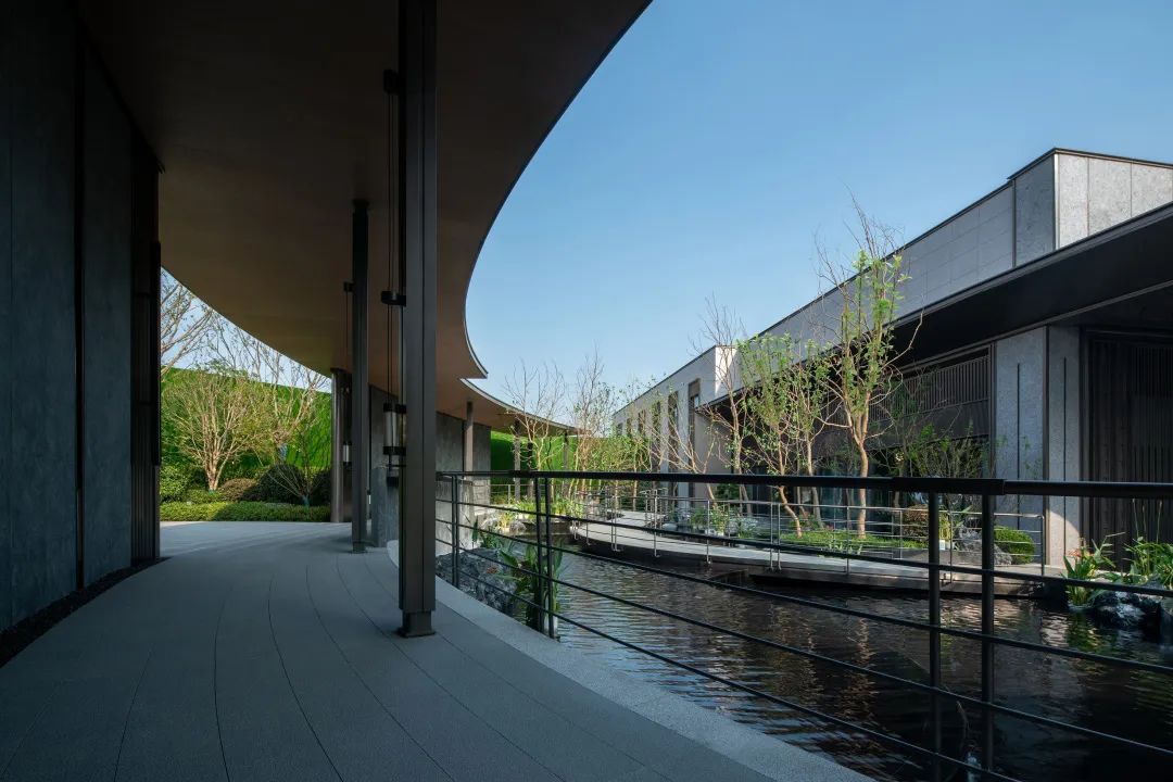 入口隔开了城市的喧嚣,开敞式的设计如同画框,步入后亦可回望繁华之色。沿着黄金比例柔和的弧线景观连廊和水上浮桥从自然中生长,圈一域水景,笼一方宁静。