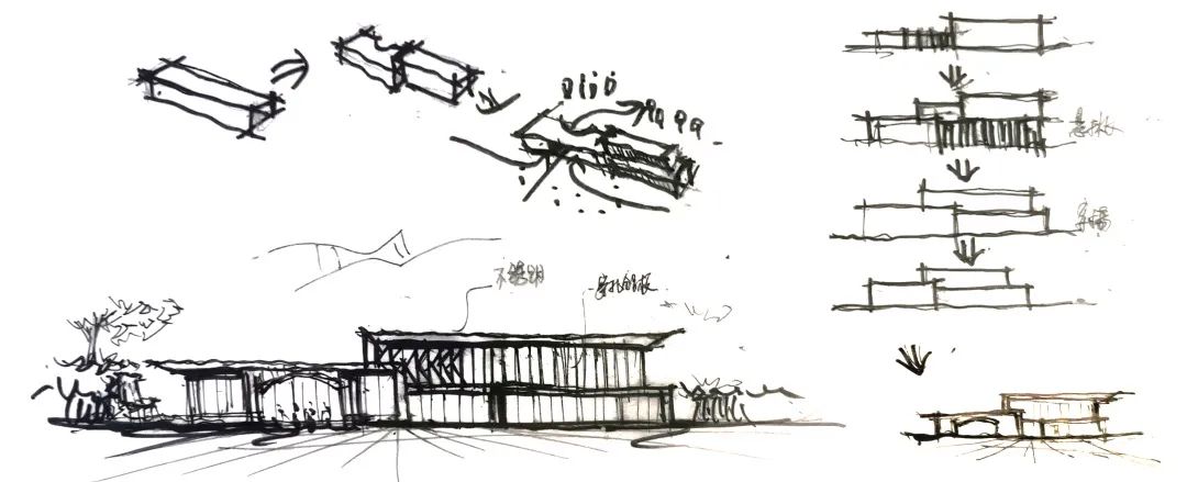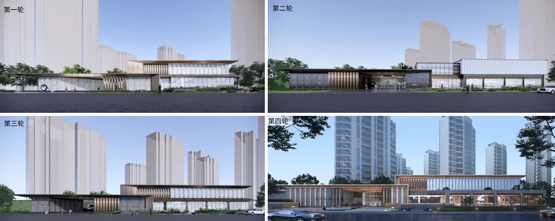 方案经过了多轮推敲逐渐细化,入口采用斜厅向外开口的形式,如同“喇叭口”外宽内窄,展示迎客之势,竖向柱廊采用“梭”形状阵列排布,确定基本造型体块后,深化细节做法,在人感触到的部位设计细腻,形成城市客厅的设计概念。