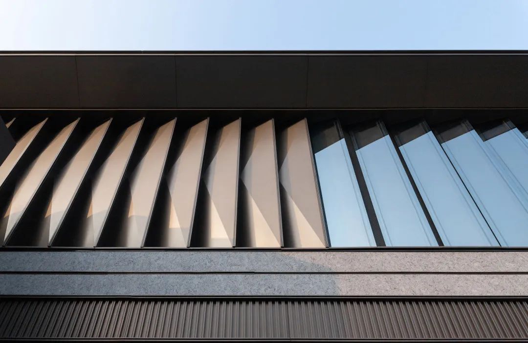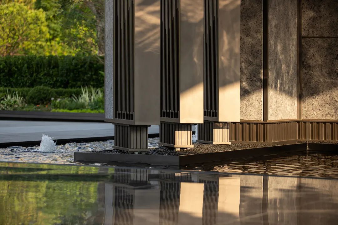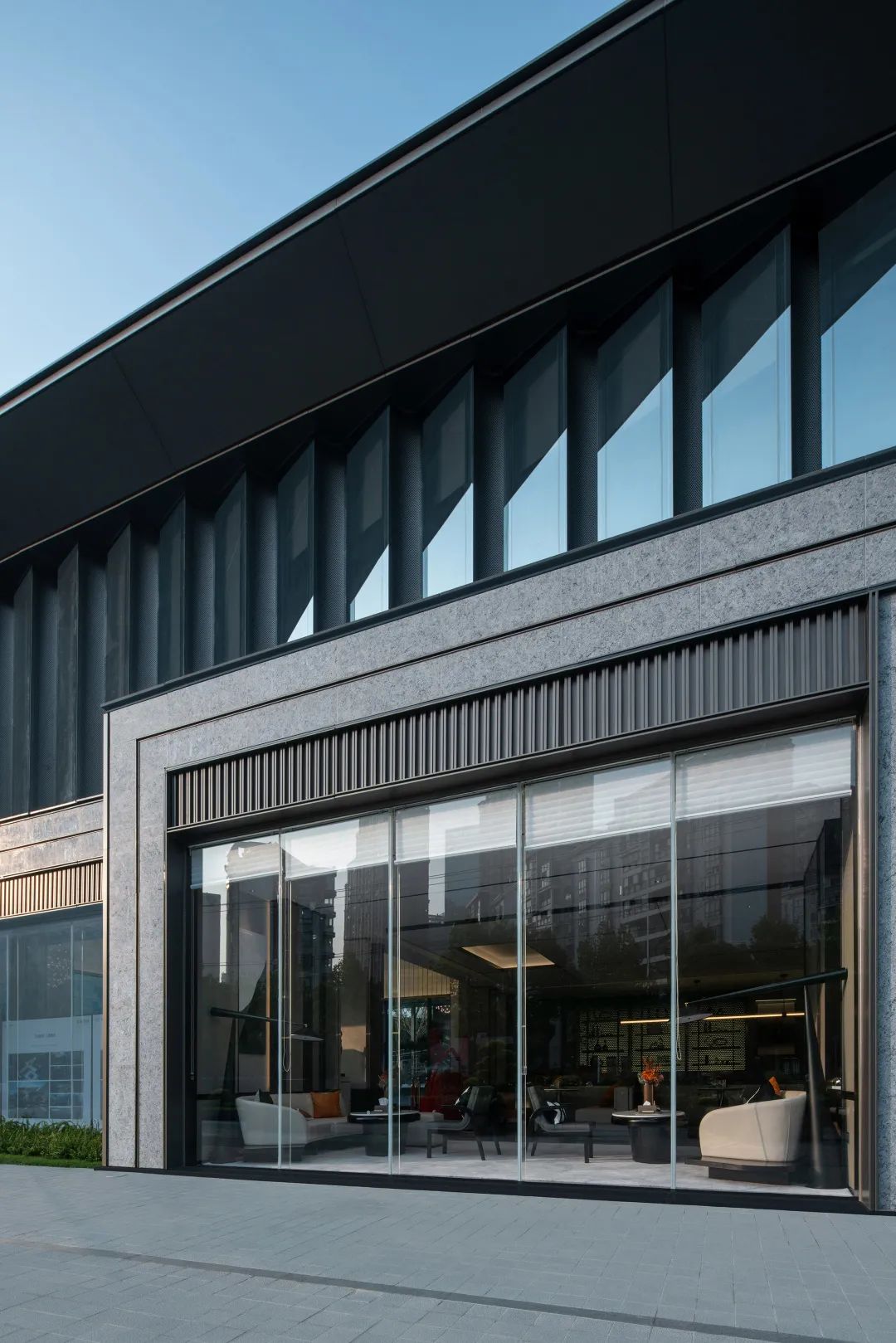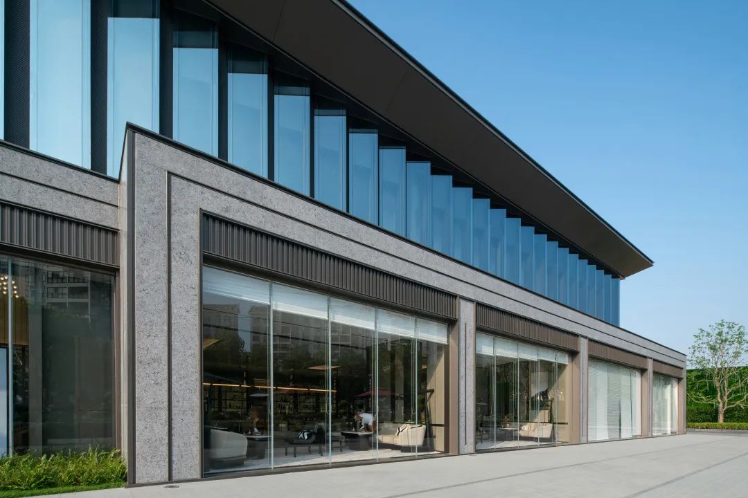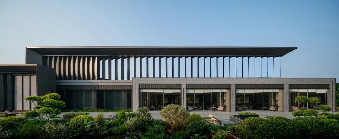 石材与金属无处不在碰撞,不同纹理间组成独特韵律,干净而纯粹的表达透露出精致,融合景观,达到景观建筑一体化,人与自然和谐共生。