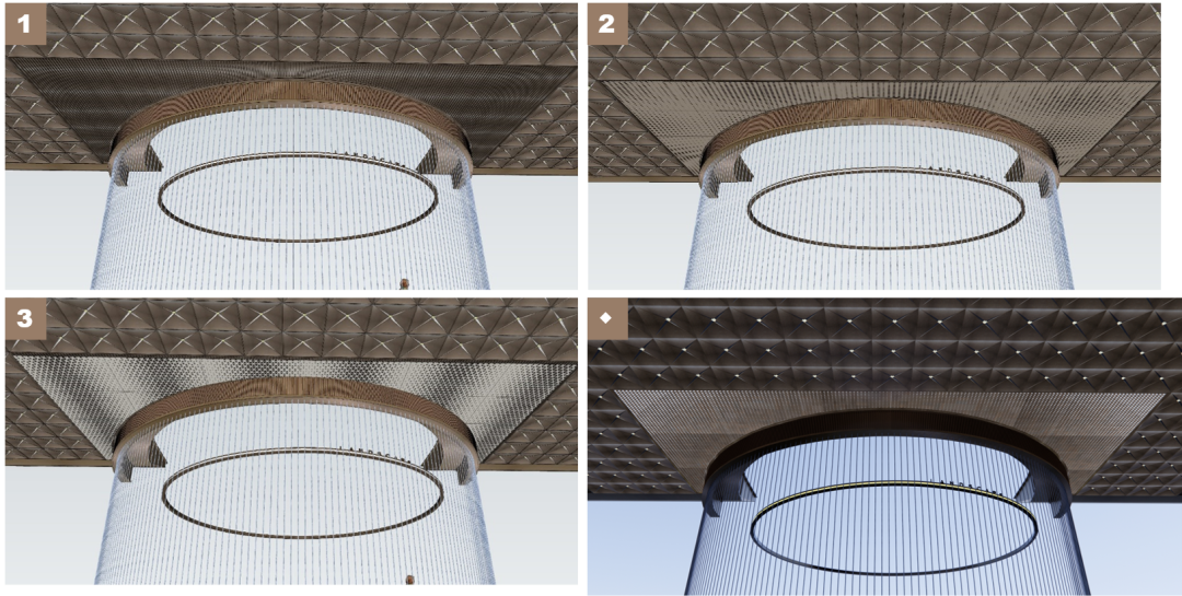 主入口星空吊顶结合景观水幕圆环排版,在圆环交接位置增加渐变穿孔铝板设计,背衬亚克力加泛光与星空吊顶呼应。最初选用竖向格栅,但排列板直,过于简单,后采用较为轻盈的穿孔铝板,与吊顶形成呼应,但圆形穿孔方式与吊顶肌理没有呼应关系,改为三角形穿孔纹理形式,与吊顶斜切内凹造型相呼应,由疏到密往圆环渐变过渡。
