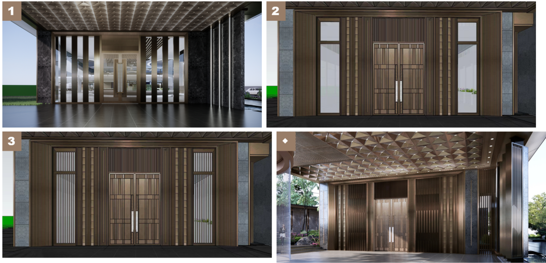 通向室内空间的入口门用均分格栅的方式略显笨重,增加长条窗户后采用了更为纤细轻盈的格栅,但为了保护室内的隐蔽性,最终去除了玻璃窗,增加鳞片状韵律造型排布于两侧,用格栅进行虚实过渡。