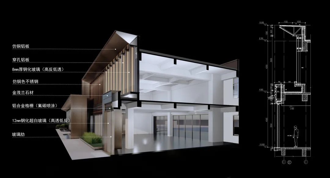 建筑立面风格时尚而简约,二层折行玻璃+弧形穿孔铝板内藏灯光,泛光透过穿孔铝板形成“星河”效果与吊顶呼应。材质交接自然过渡,形体与交接咬合关系清晰。首层采用高透低反的平面玻璃,以便更好地向外展示,二层则采用高反低透的钢化玻璃折行排布。
