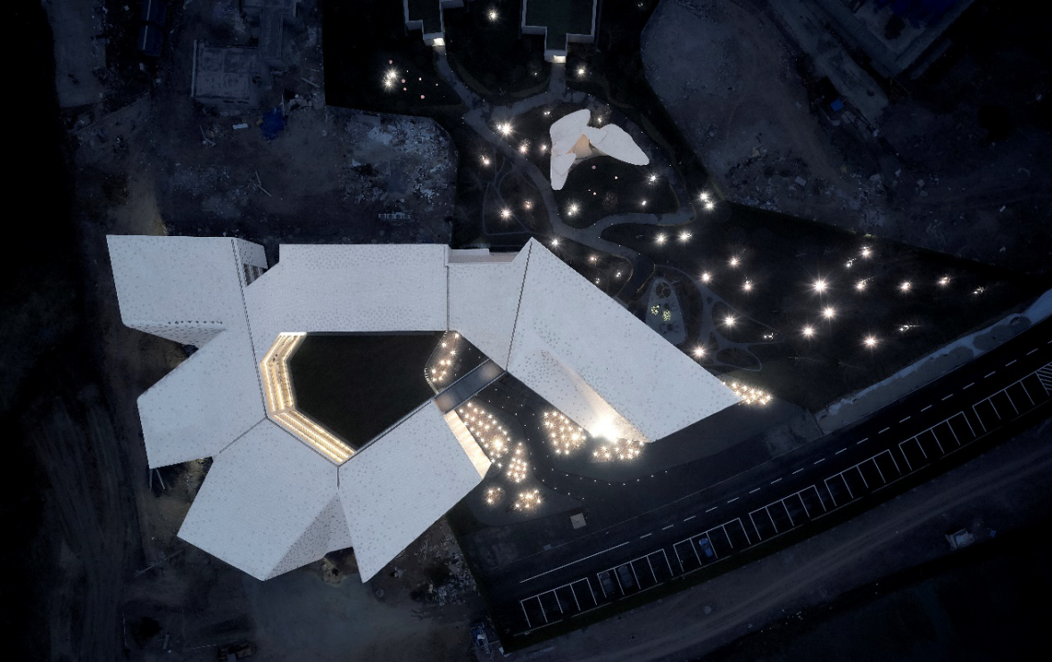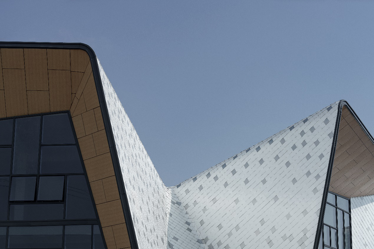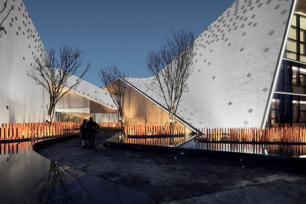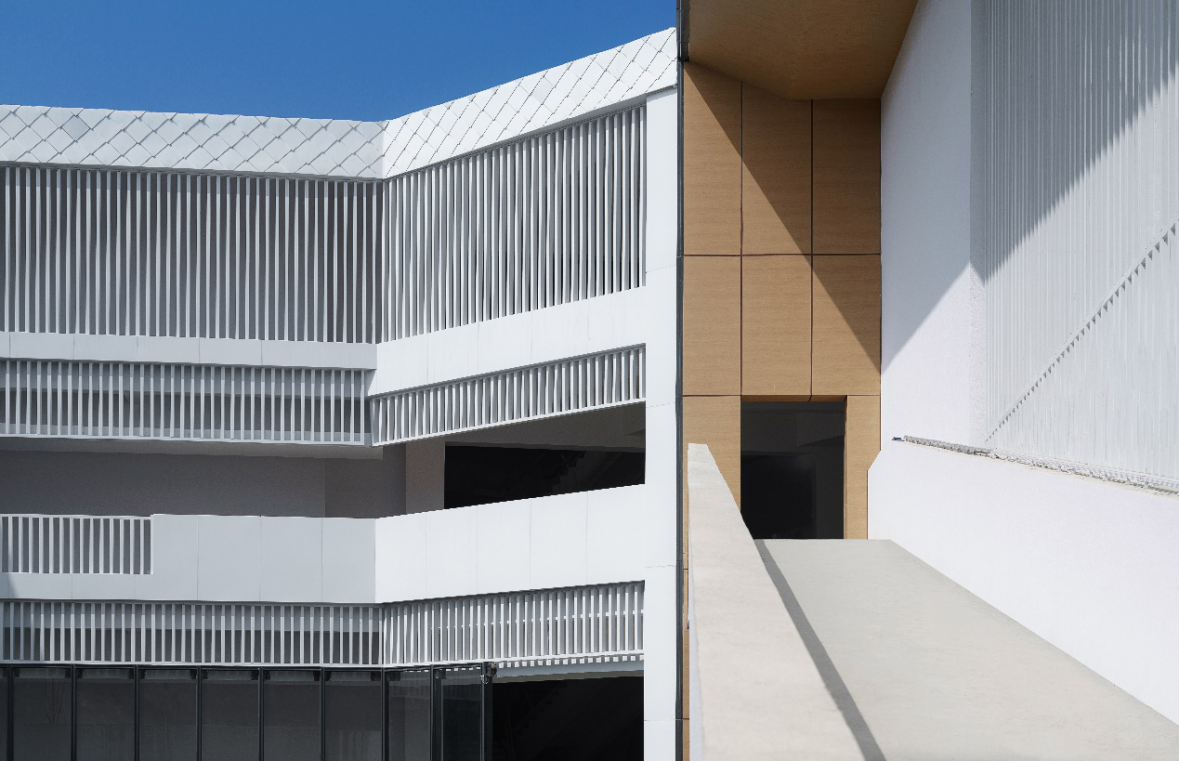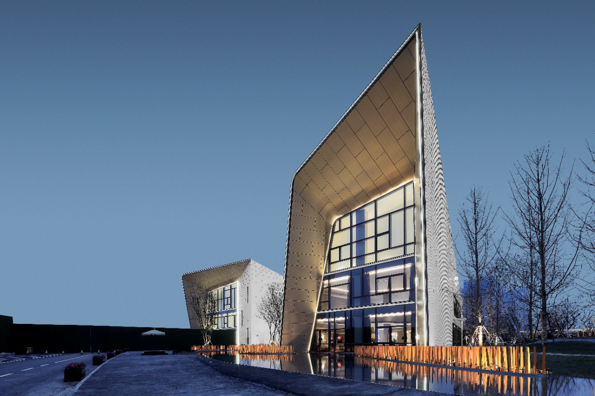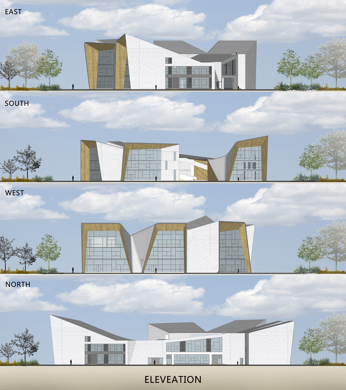 布局上,结合异形地块建造复杂而又统一的建筑体。基本几何形和组合方法来表达建筑的本质,建筑沿着台地围合出入口广场、中心院,并从形态上向对外打开,一同围合而成,从实到虚形成一个隐形的环。