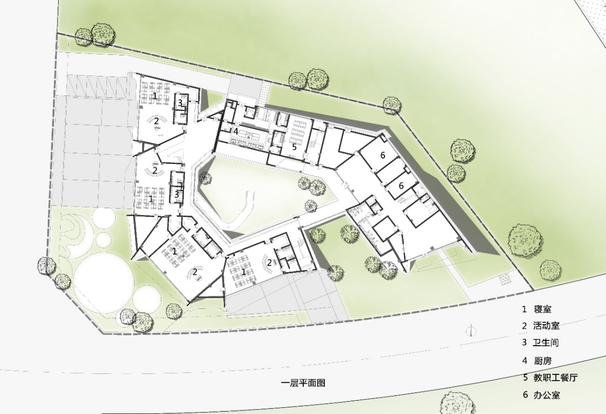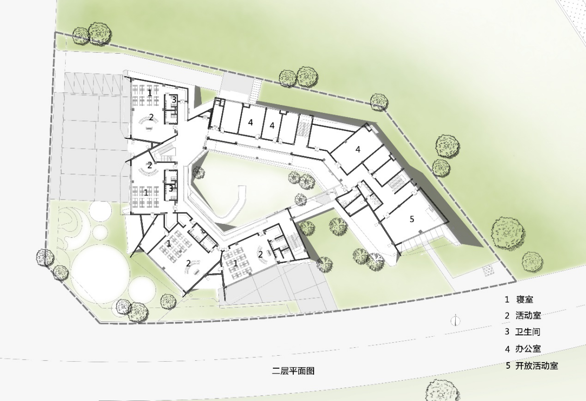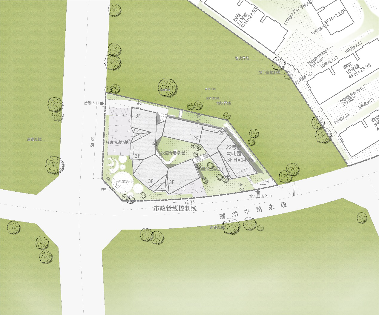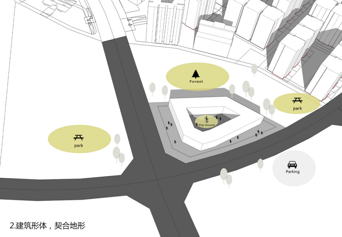 地块东西北三向均被城市景观带包裹,而北向的百米绿化带更是成为城市重要景观轴。建筑形体契合异形场地,将景观引入建筑,以建筑呼应景观。儿童通过与自然的接触可以得到各种体验的同时,建筑物本身亦可作为环境教育的教材被灵活使用。