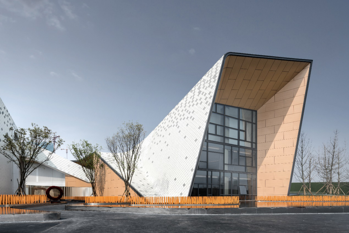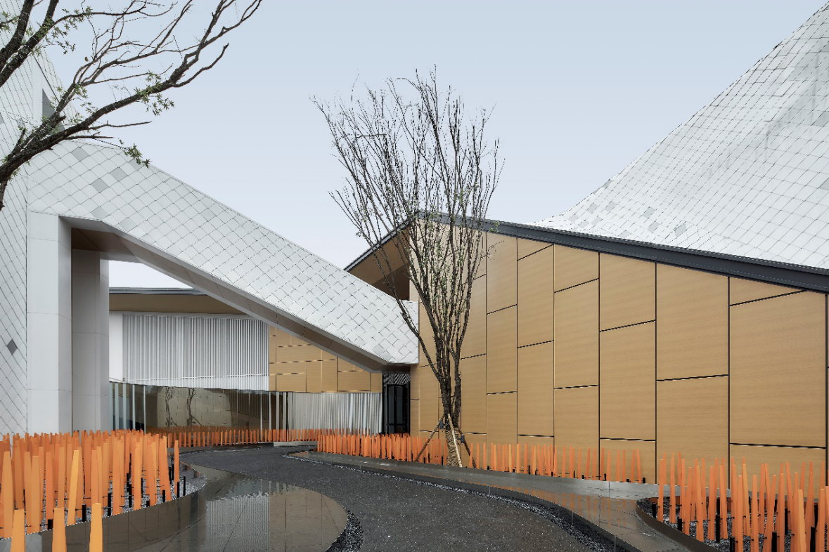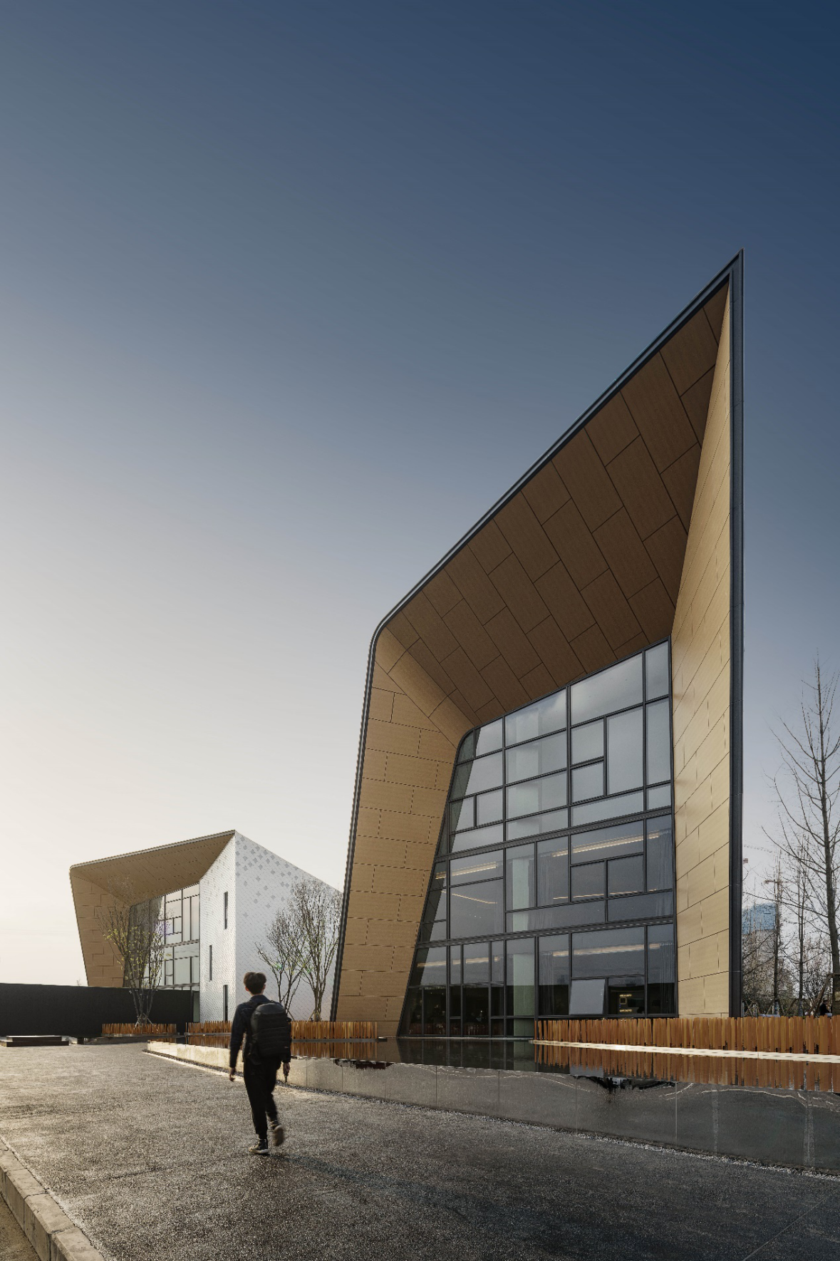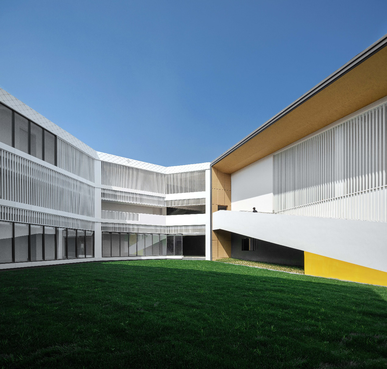 地块东西北三向均被城市景观带包裹,而北向的百米绿化带更是成为城市重要景观轴。建筑形体契合异形场地,将景观引入建筑,以建筑呼应景观。儿童通过与自然的接触可以得到各种体验的同时,建筑物本身亦可作为环境教育的教材被灵活使用。