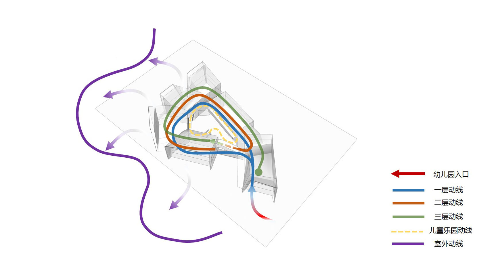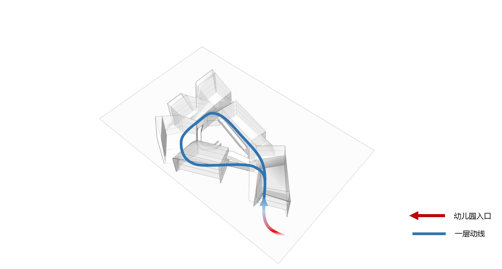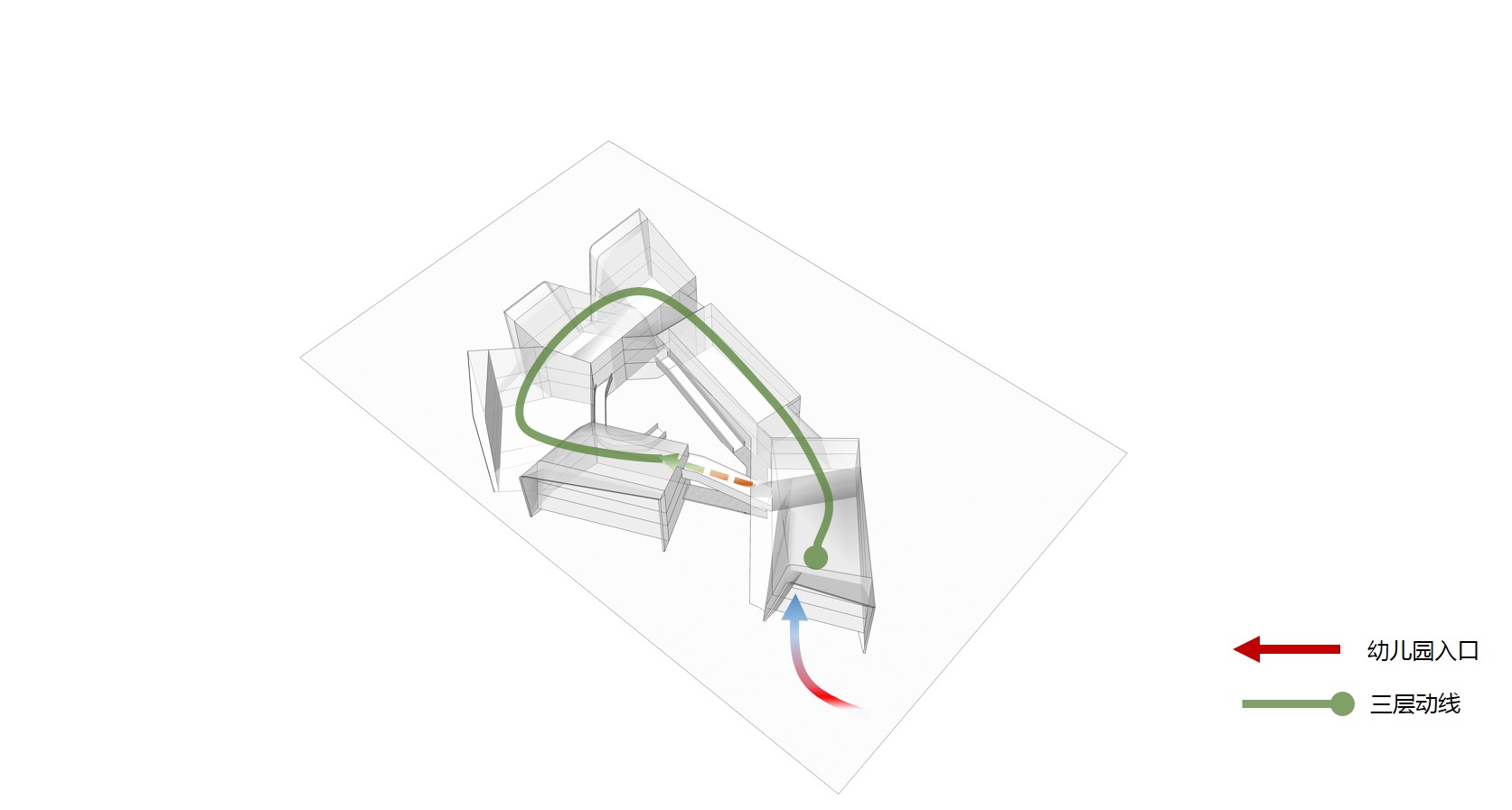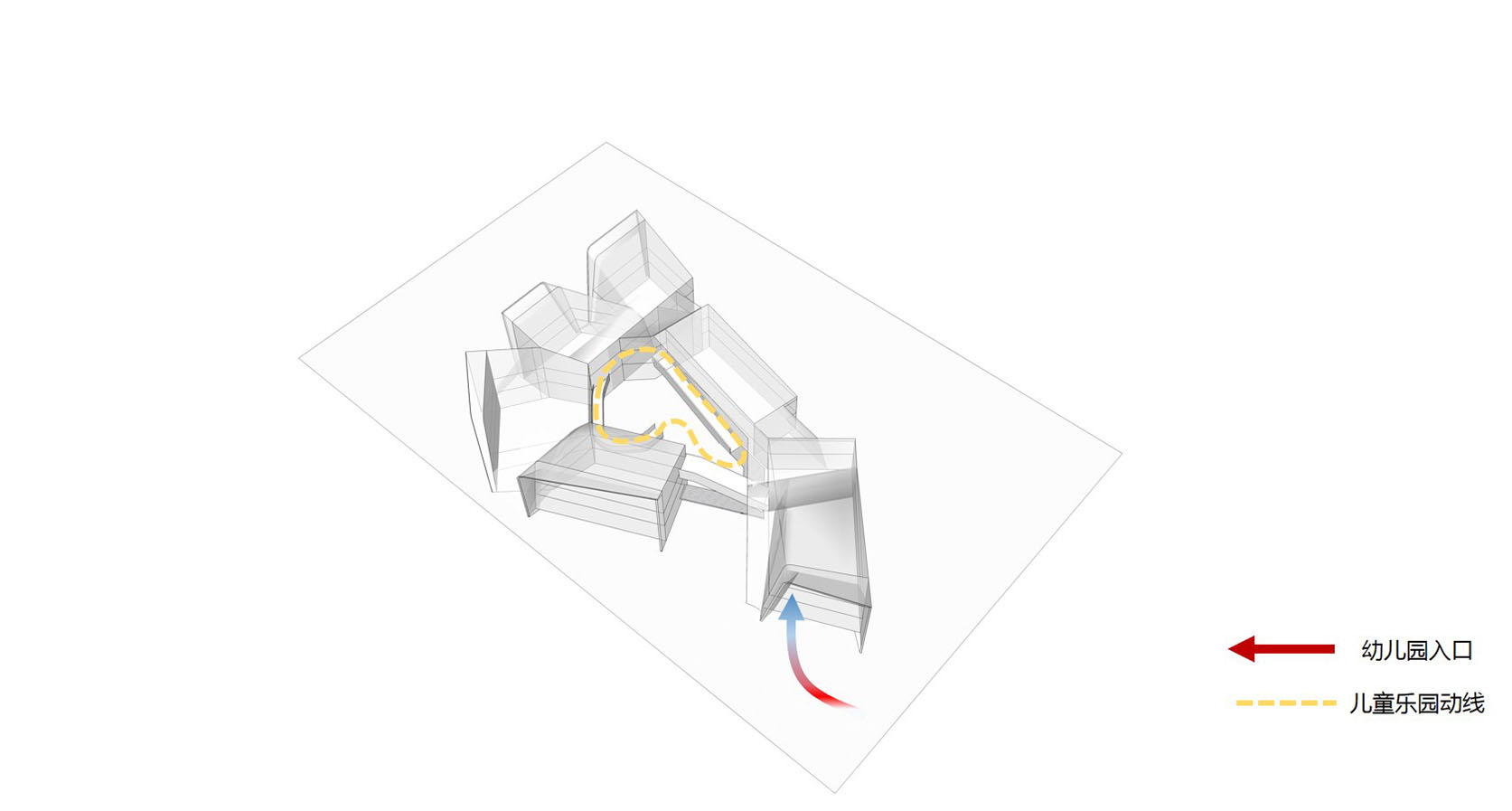 从幼儿园单元性特征出发,将形体切割,建立建筑与人流的关系,对光照和室外活动场地的要求,使其体块推向南侧。通过在建筑环境与自然风景之间建立过渡性的微观地理环境而实现创新。