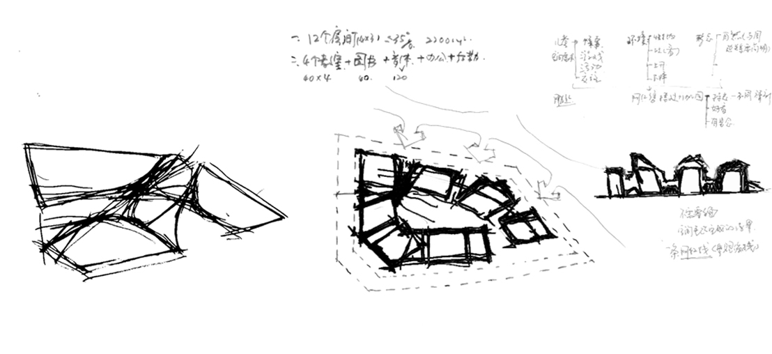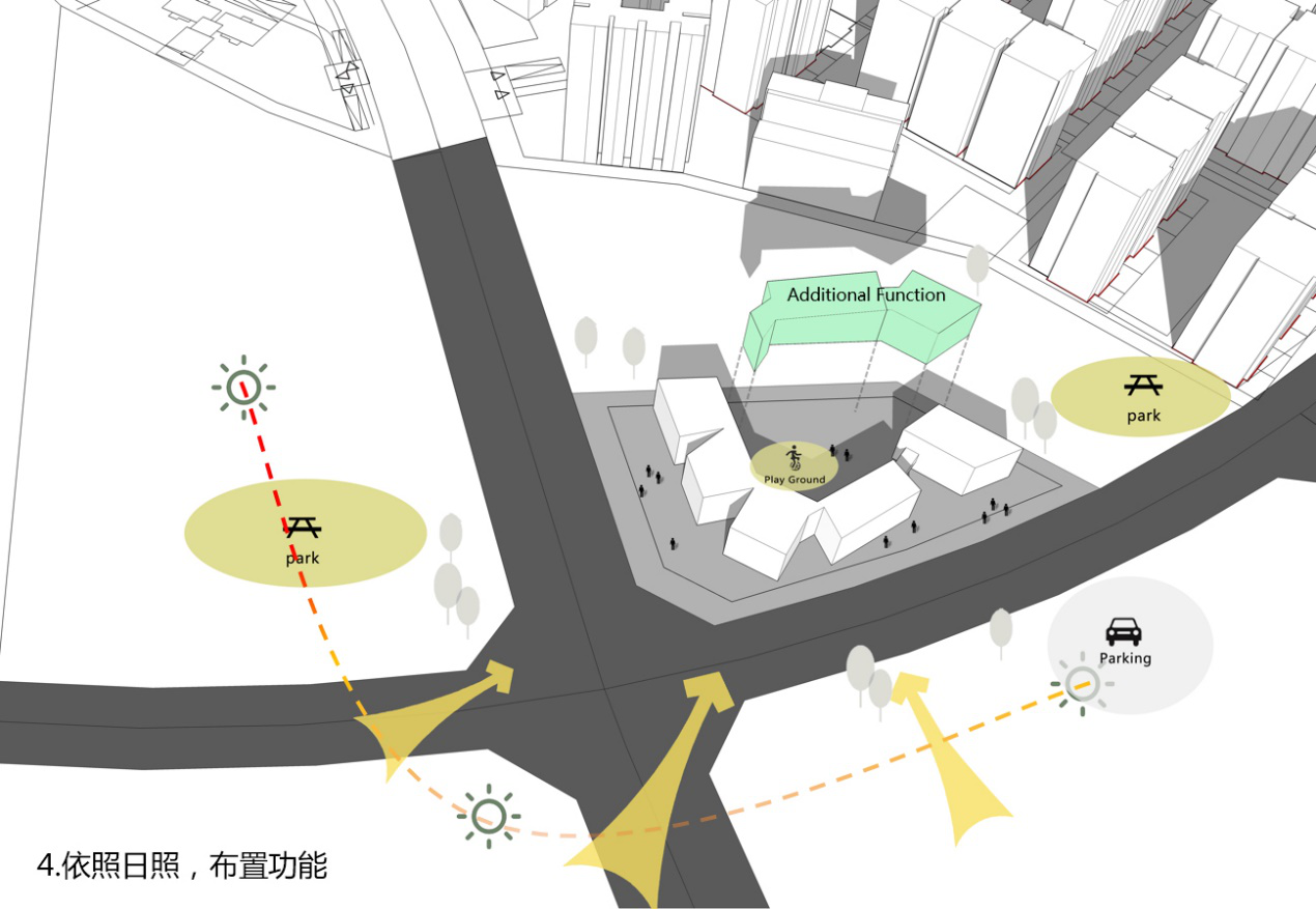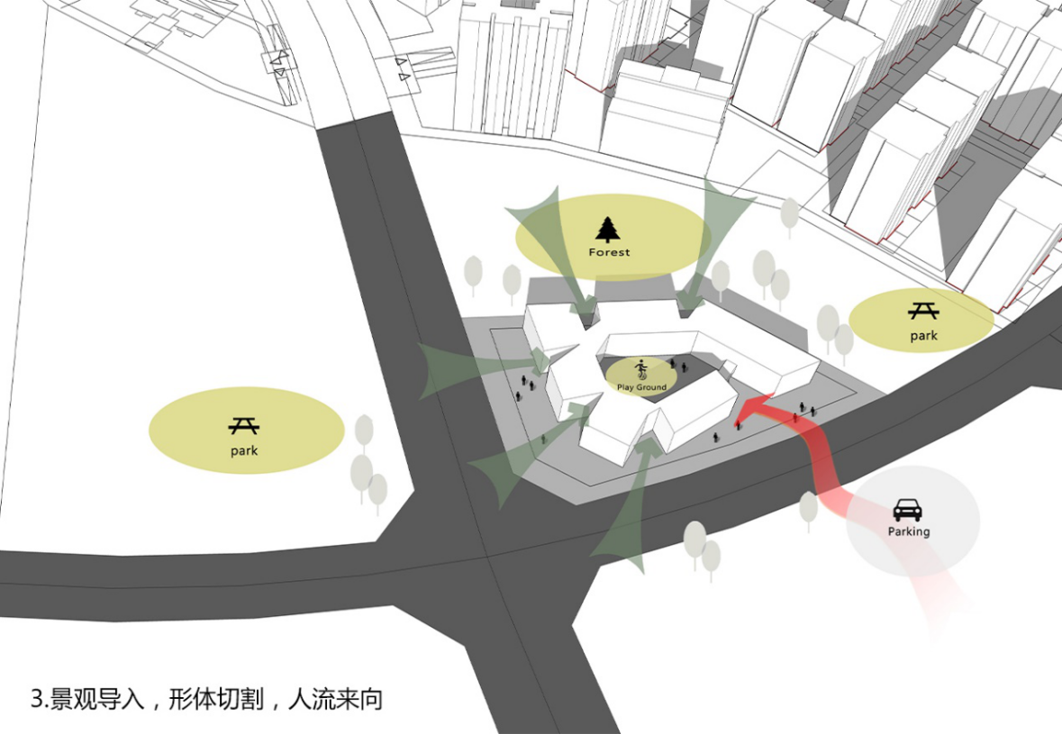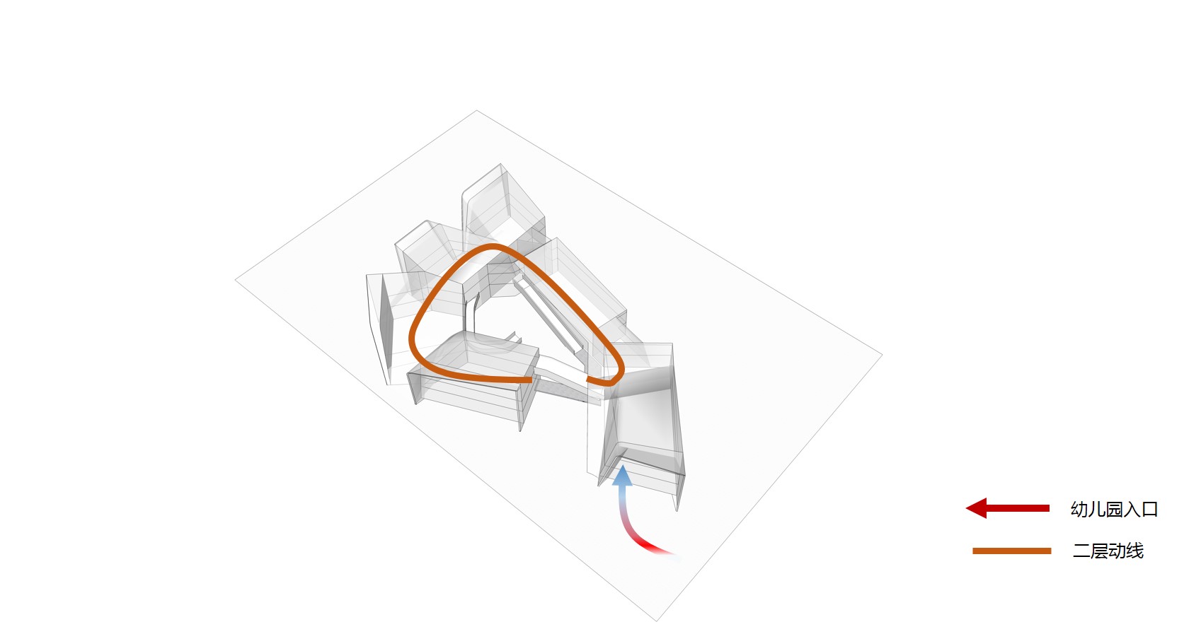 从幼儿园单元性特征出发,将形体切割,建立建筑与人流的关系,对光照和室外活动场地的要求,使其体块推向南侧。通过在建筑环境与自然风景之间建立过渡性的微观地理环境而实现创新。