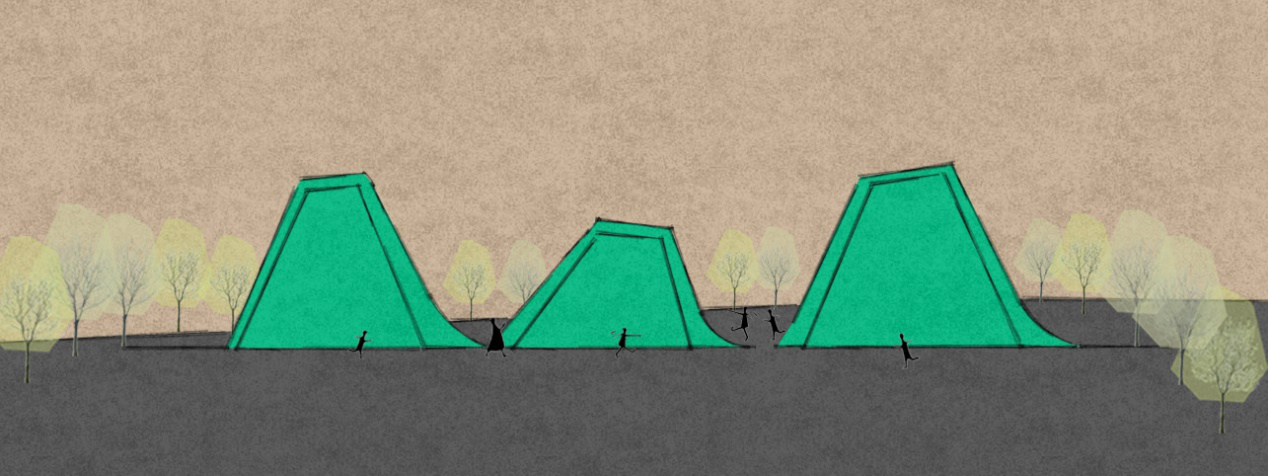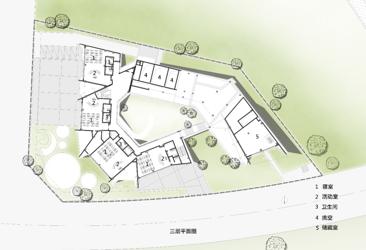 赖特曾说过,“设计是自然的提炼,以一种纯几何方式出现的因素” 。本案是用建筑来使自然抽象化的过程,希望儿童在山林中蓬勃生长。建筑形体来自于山体的抽象画演绎,以清晰、鲜明的图形呈现出来,并在局部形成制高点作为建筑的昭示性,不会令人乏味。以精致简练的手法表达出抽象自然的意义,与周边丰富的景观带多样统一,如山林环绕一般,视觉心理得到满足。