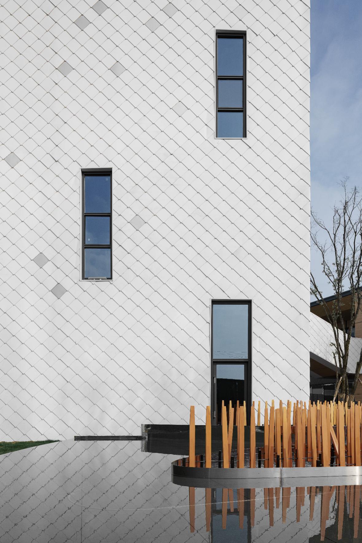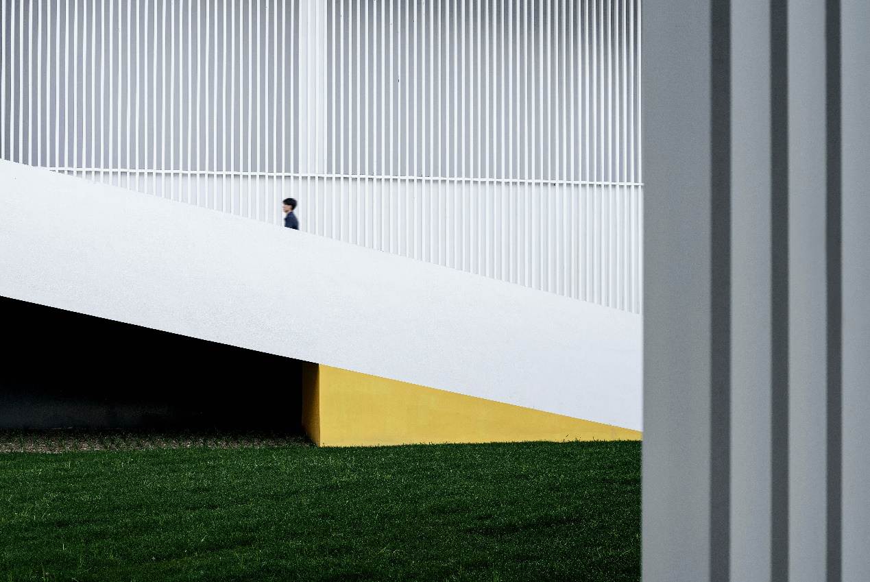 白色实际是能够强化对自然界所有其他色彩感觉的颜色,对着白色表面能够最好地欣赏光影虚实的表演。设计师用白色来澄清建筑概念,提高视觉形式的力量。白色建筑与自然环境形成图底关系,在光线的作用下,白色墙面映衬着自然,这种对比并不是破坏自然环境,而是与大自然既对立又融洽。