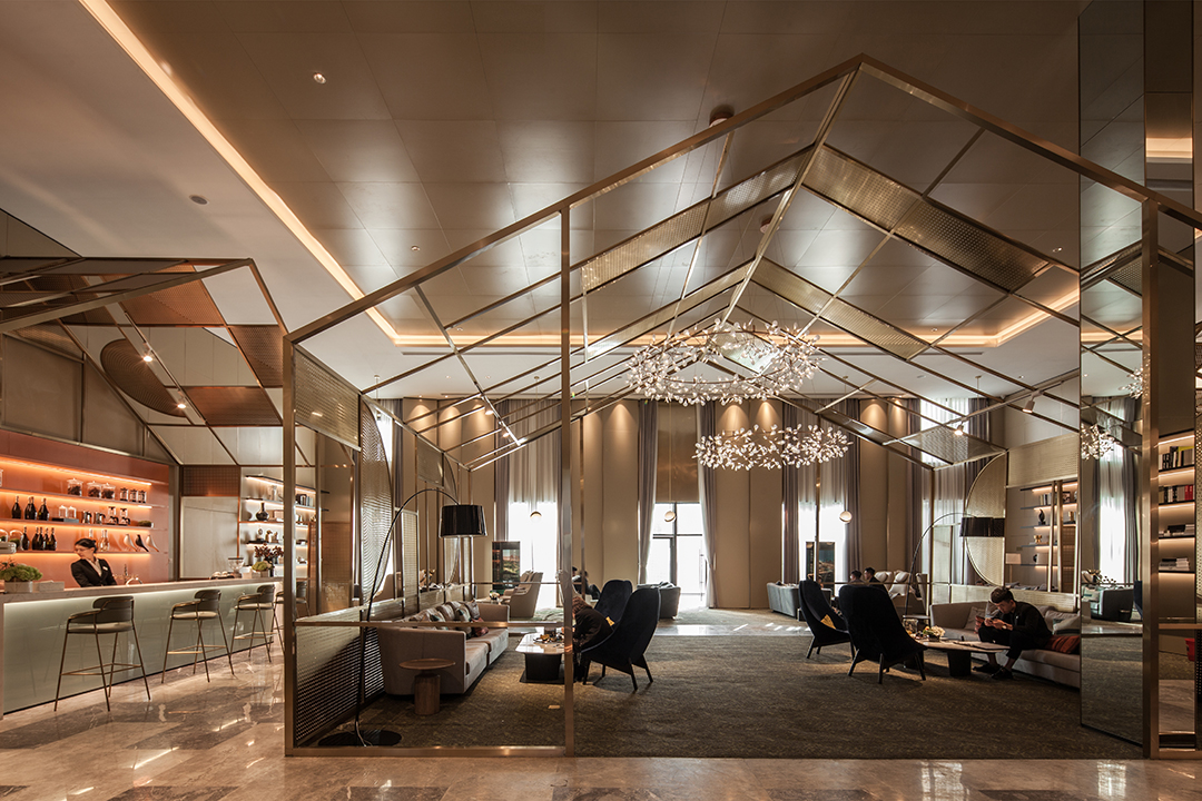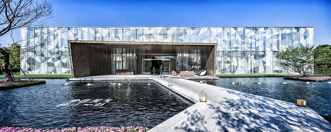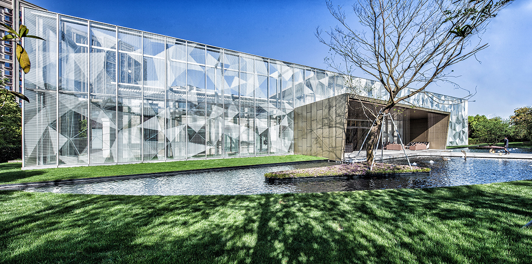 一个极简的立方体,只是通过玻璃幕墙的处理,塑造一个“星空”,巧借人工,抽象自然。这个项目的设计源于景、表以形、达于意,由景入境,通过一个纯净的玻璃盒子唤起人们内心的自然意趣、山水情怀。“云水立方”,巧借人工,抽象自然。