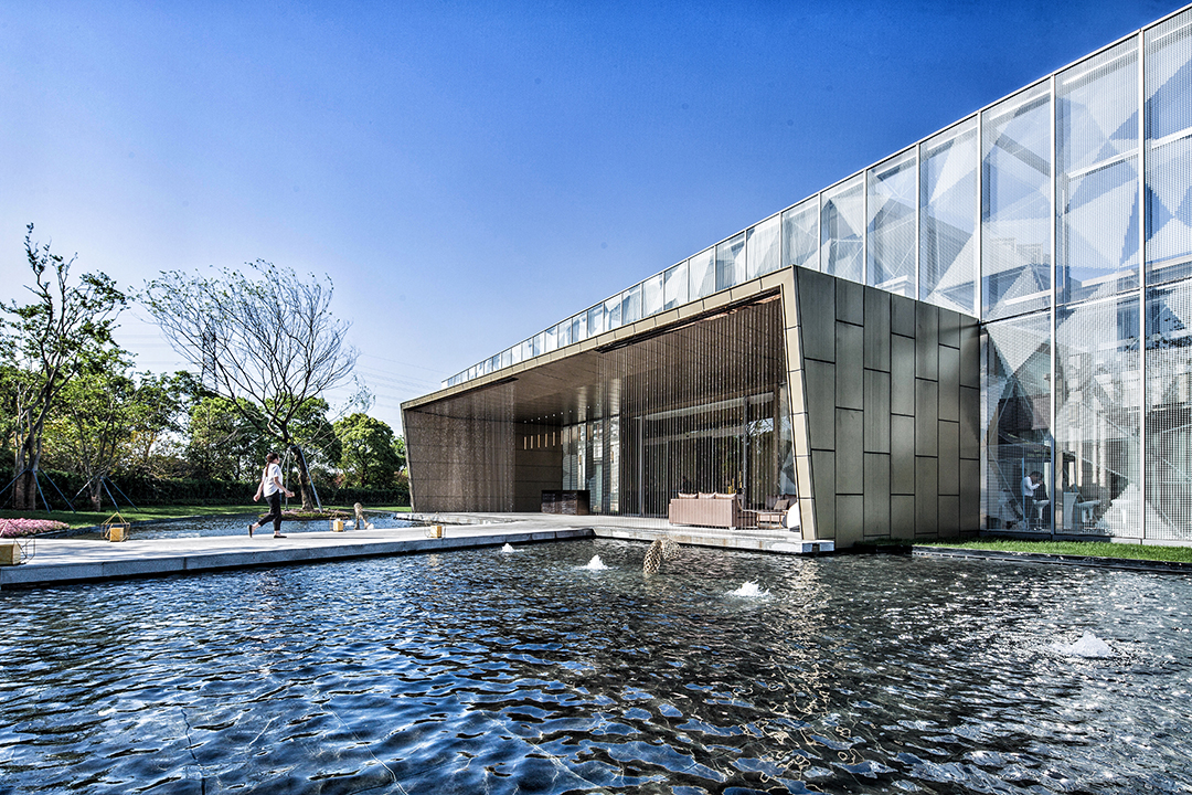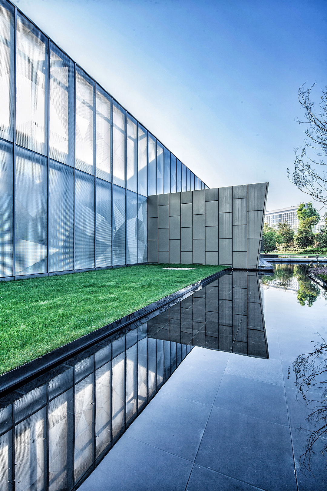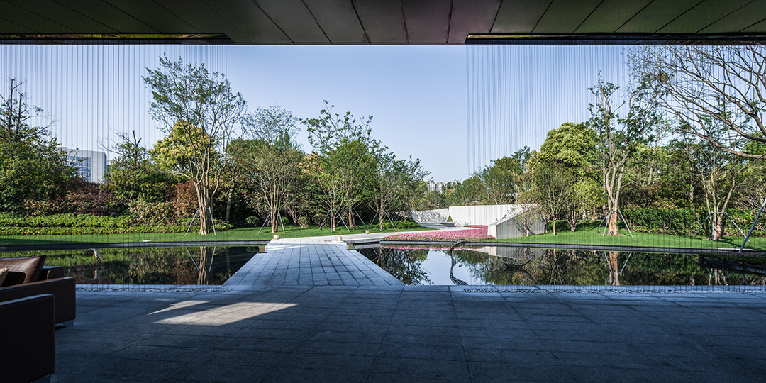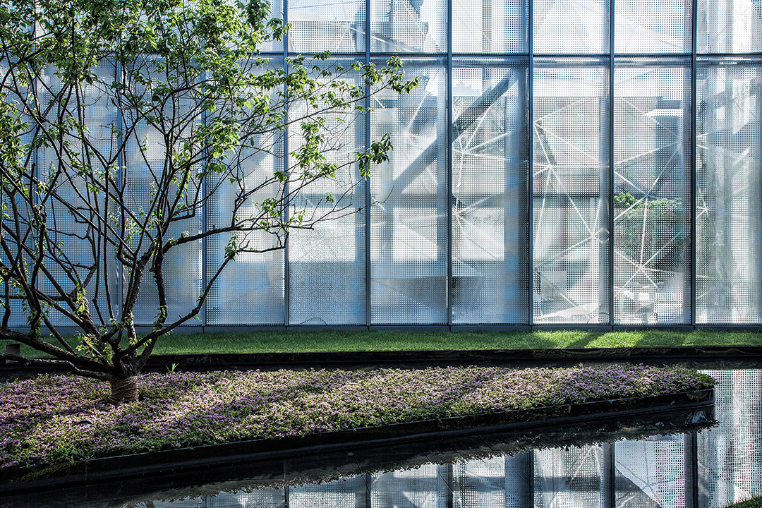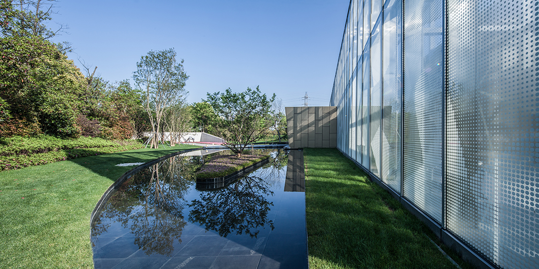 在通透玻璃的立面处理设置水池的处理,水元素的引用为建筑的构成增添了自然的乐趣,继而把室内与室外的鲜活结合了起来。