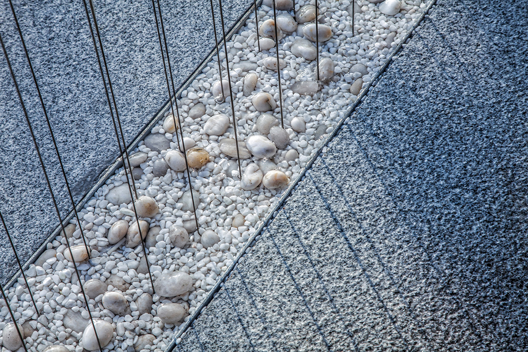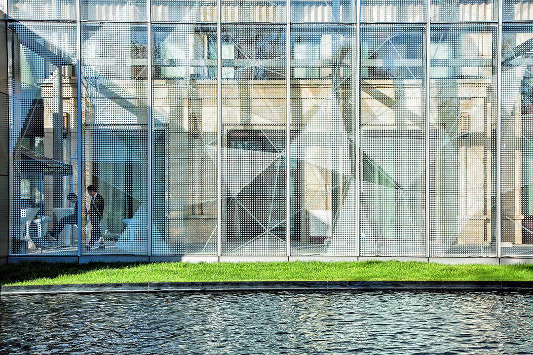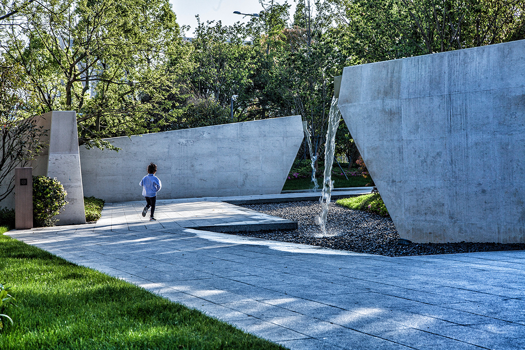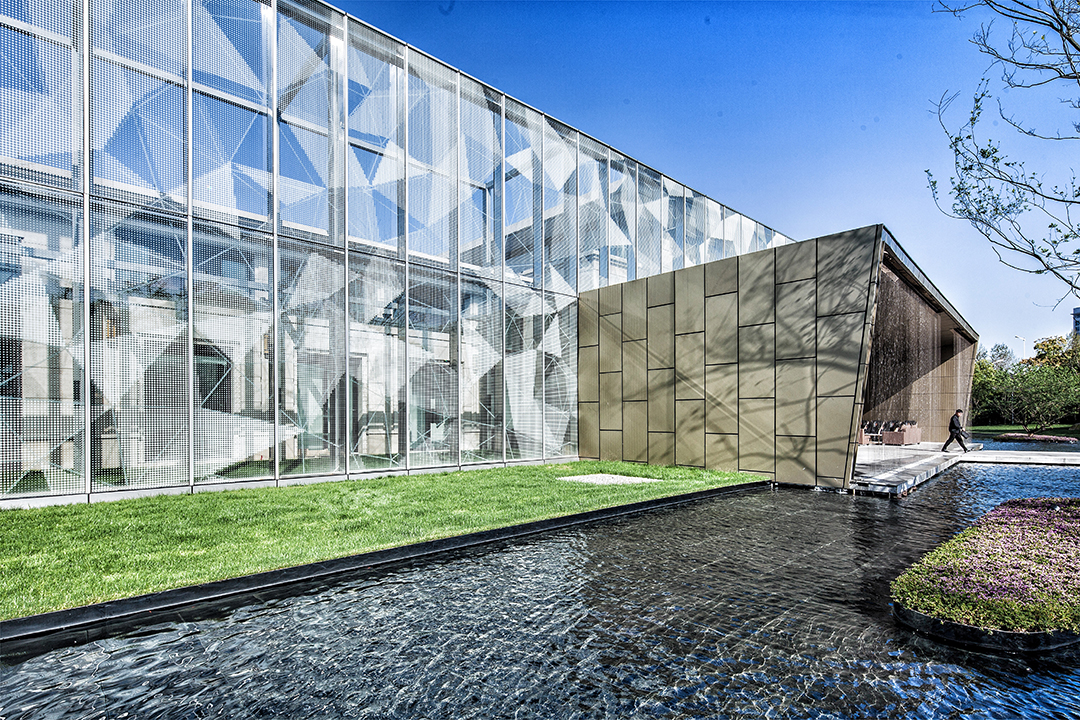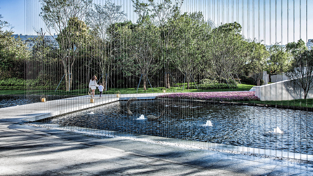 在通透玻璃的立面处理设置水池的处理,水元素的引用为建筑的构成增添了自然的乐趣,继而把室内与室外的鲜活结合了起来。