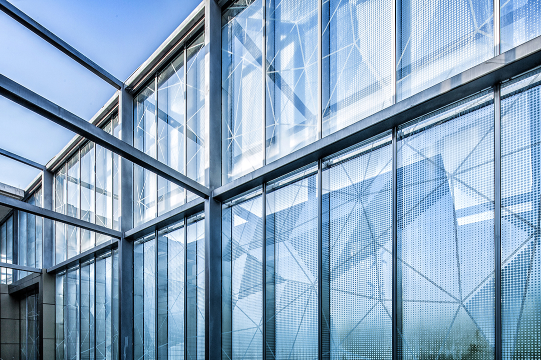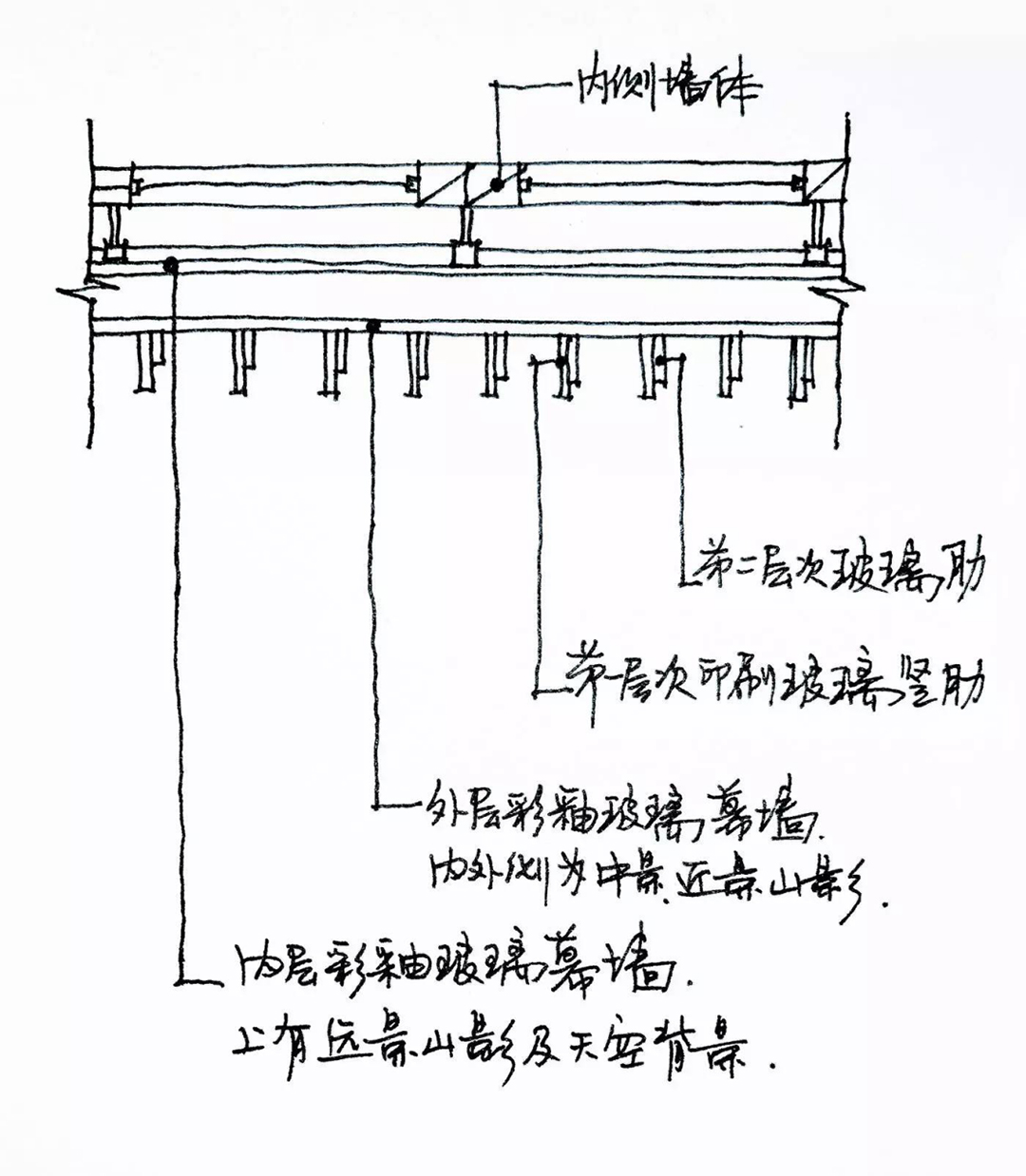 在极短时间里和做工上的难度,对于极小尺寸的把控,横隐竖显的幕墙体系,营造景观层次和空间厚度的效果。利用玻璃材料的反射和透射,结合数码彩釉技术,共同打造一个边界模糊、层次流转的含蓄形态。