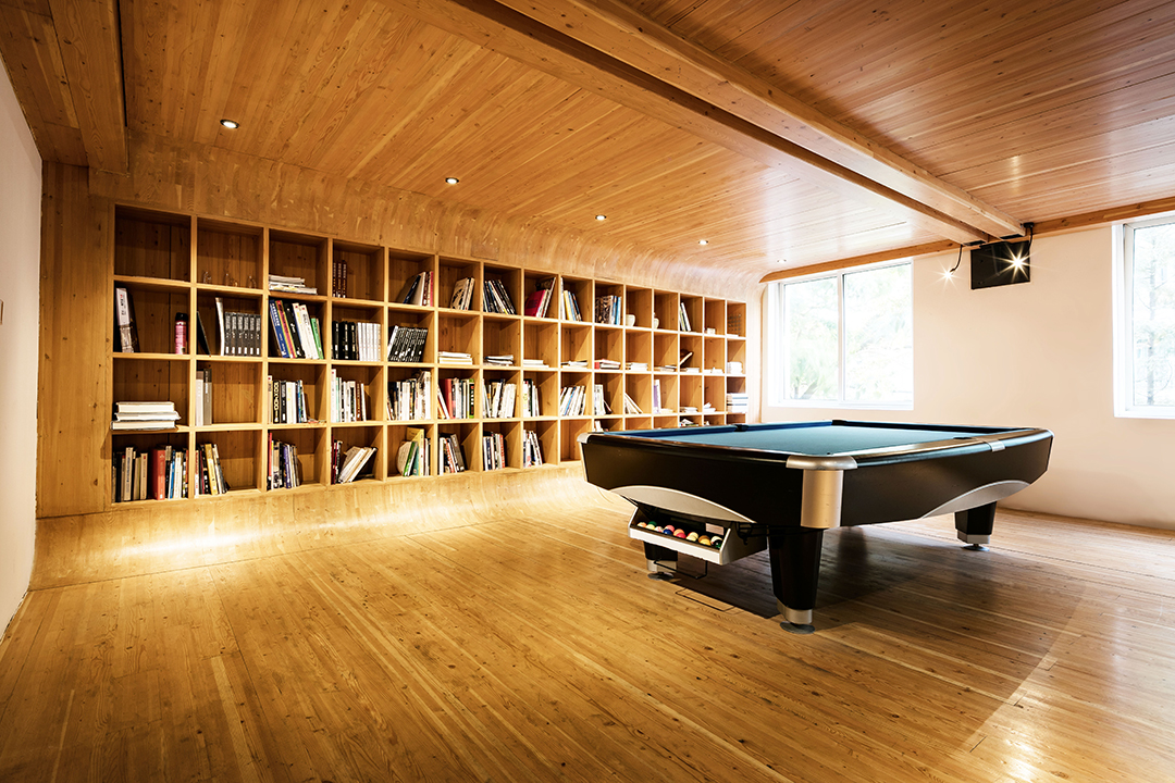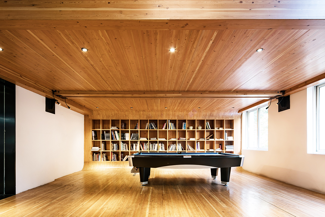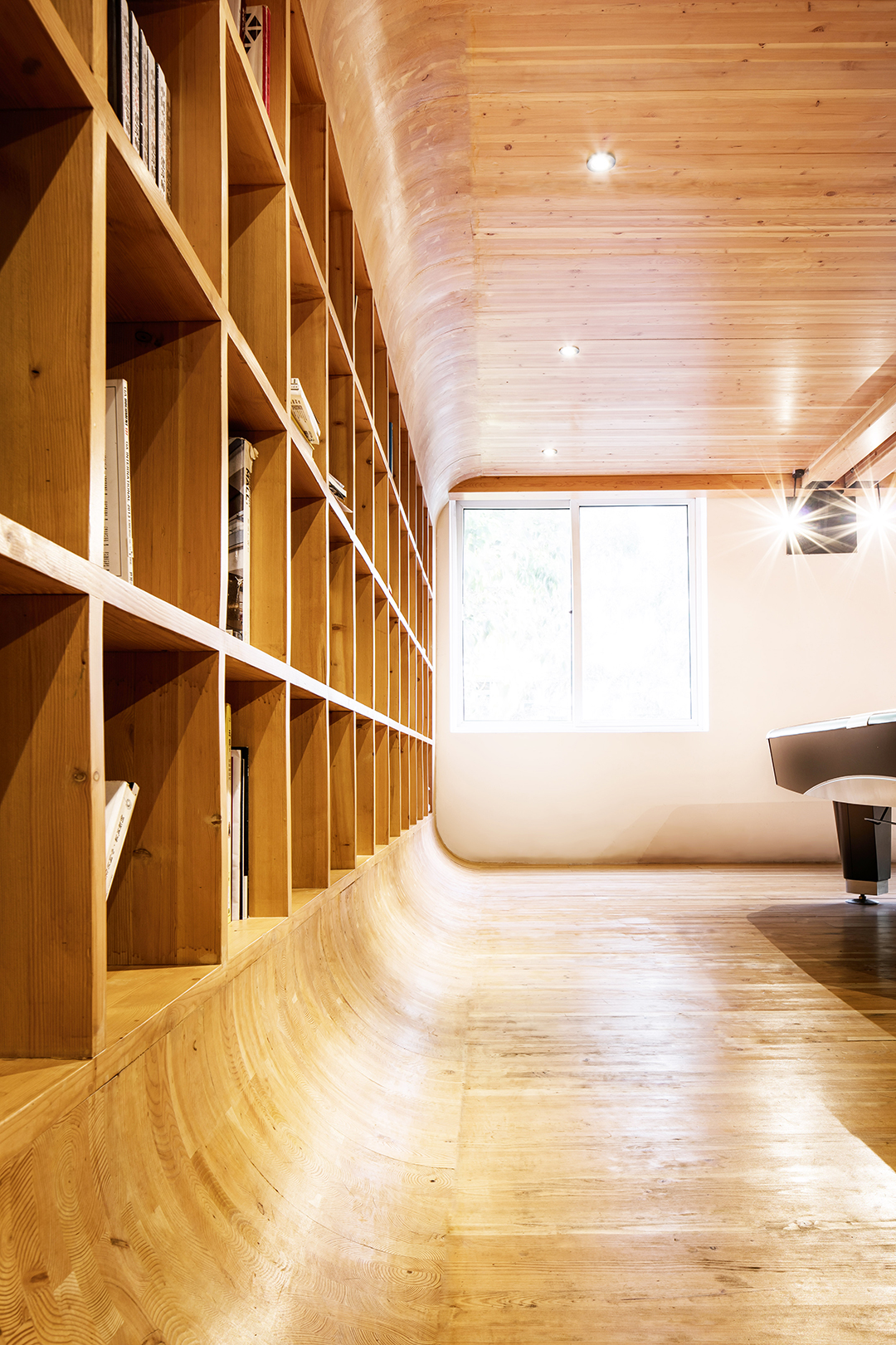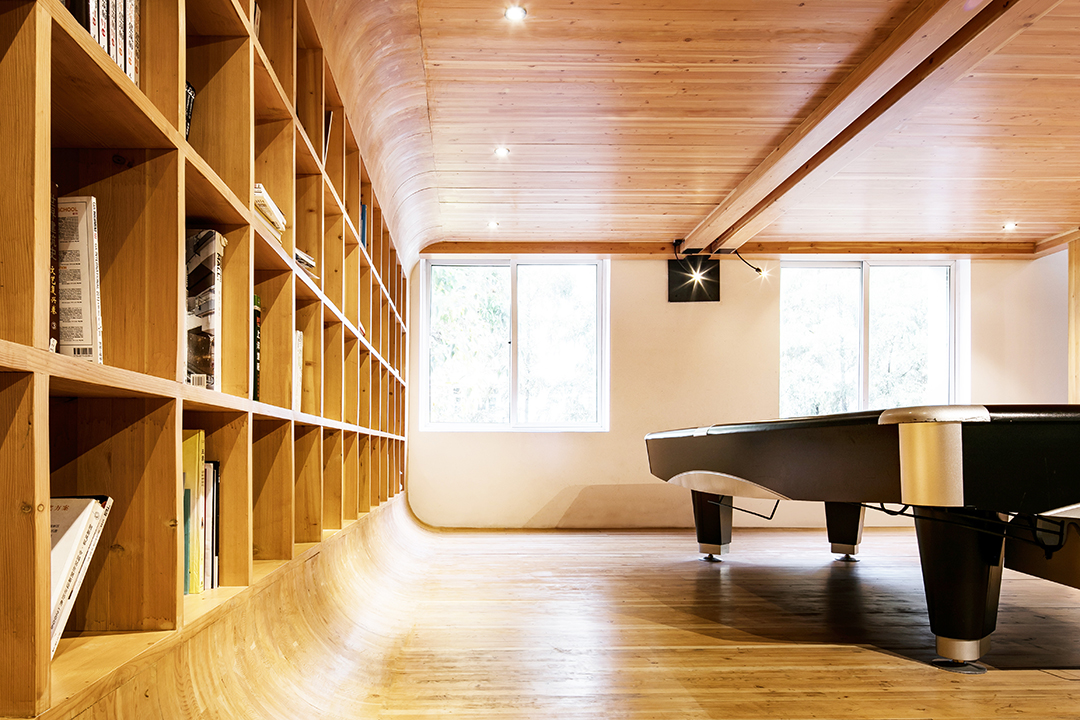 为了使空间具有连贯性,天花板、墙面、地板的连接处均由一块块切割的曲面胶合木拼接而成。所营造的整体空间,视觉冲击力强烈。此外,左侧的一体化胶合木书柜形成秩序感,不仅打破了单一的木色,使空间具有层次,也为读者构造了一个静谧的阅读区。