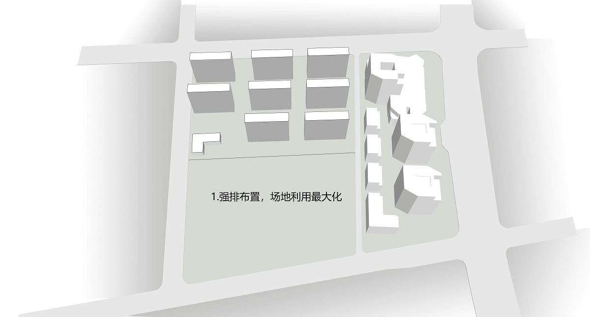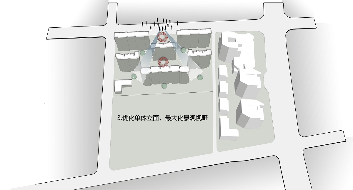 项目用地局促,面临的首要问题就是如何在较高容积率下进行合理的空间布局。为保证小区北侧入口区域一定的空间退让,满足沿城市道路界面的通透率,住宅楼栋采用错位行列式布局,并由此形成几个相互穿插渗透的庭院空间。两者之间的关系合理的处理,加强了内外之间的空间连续性。通过全区景观洄游路径的设置,实现小中见大,步移景异的空间效果。