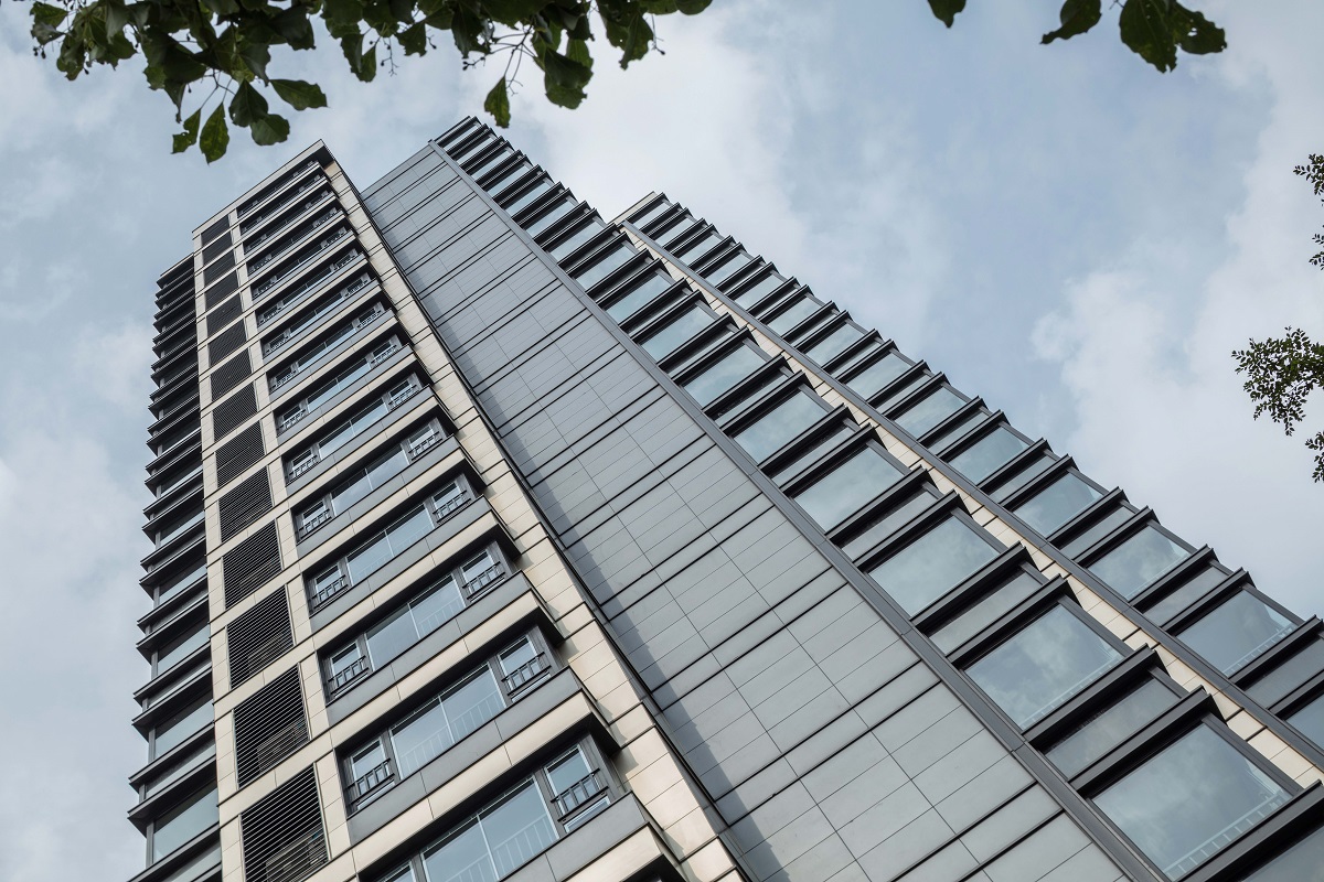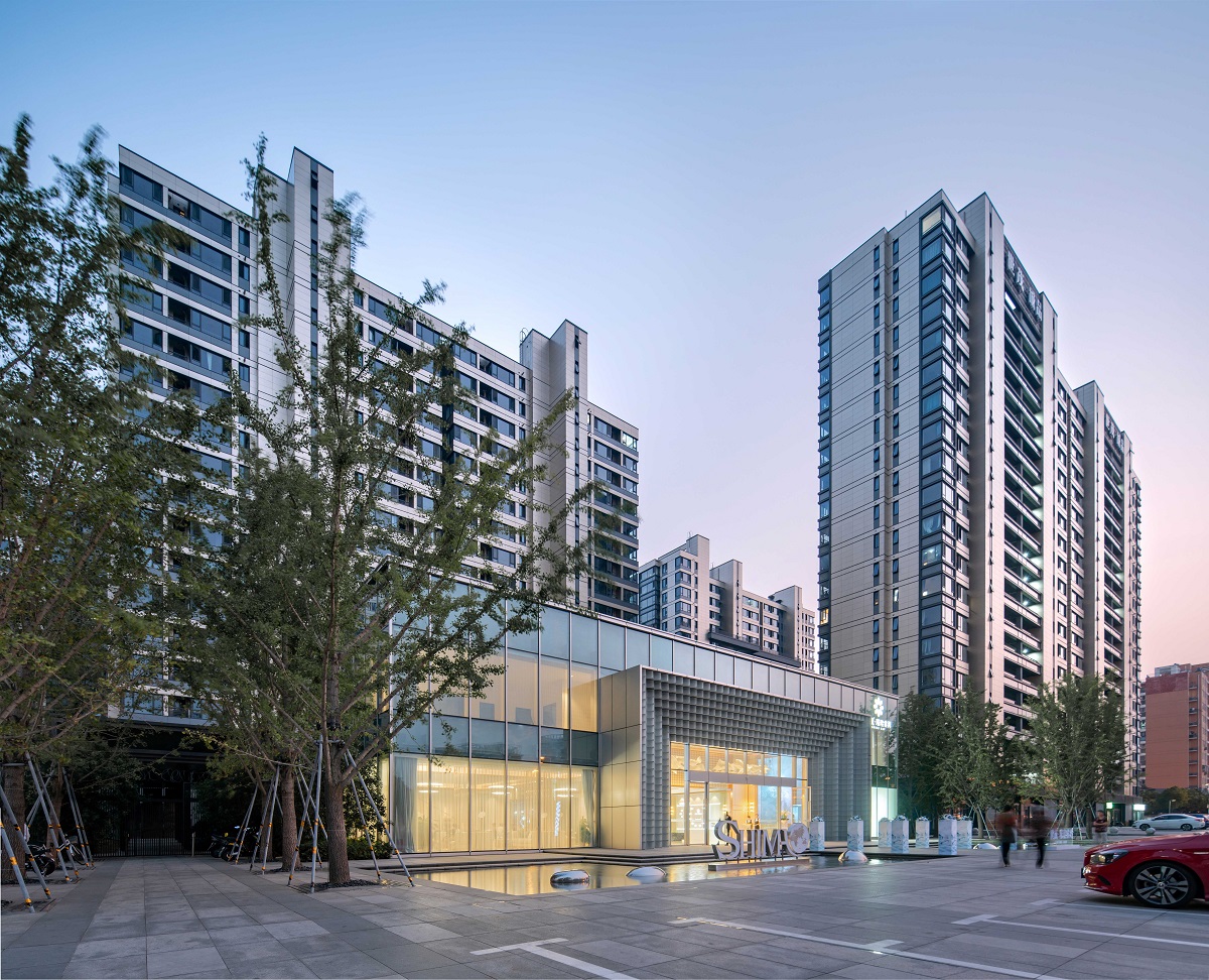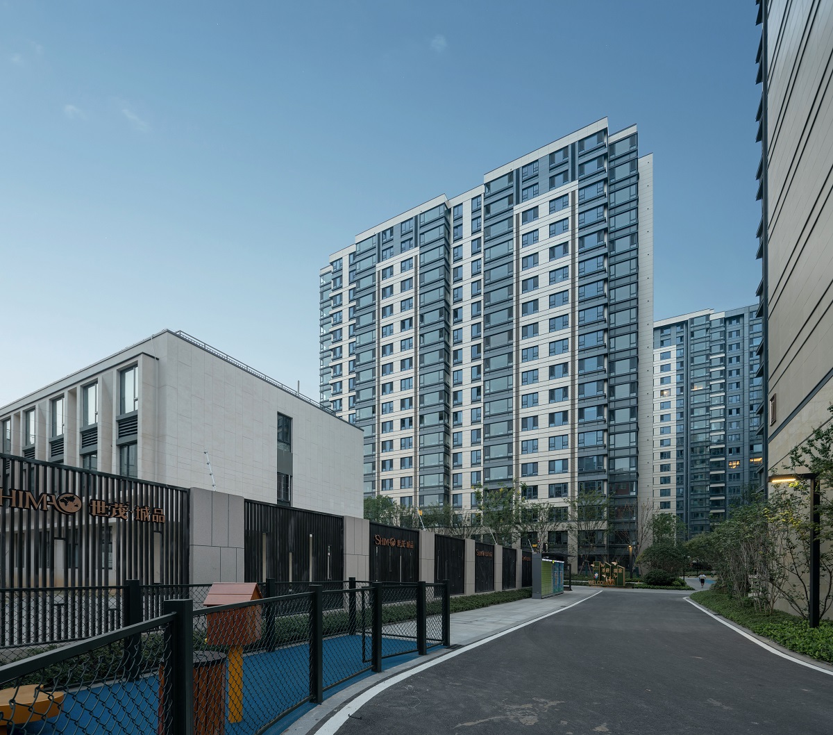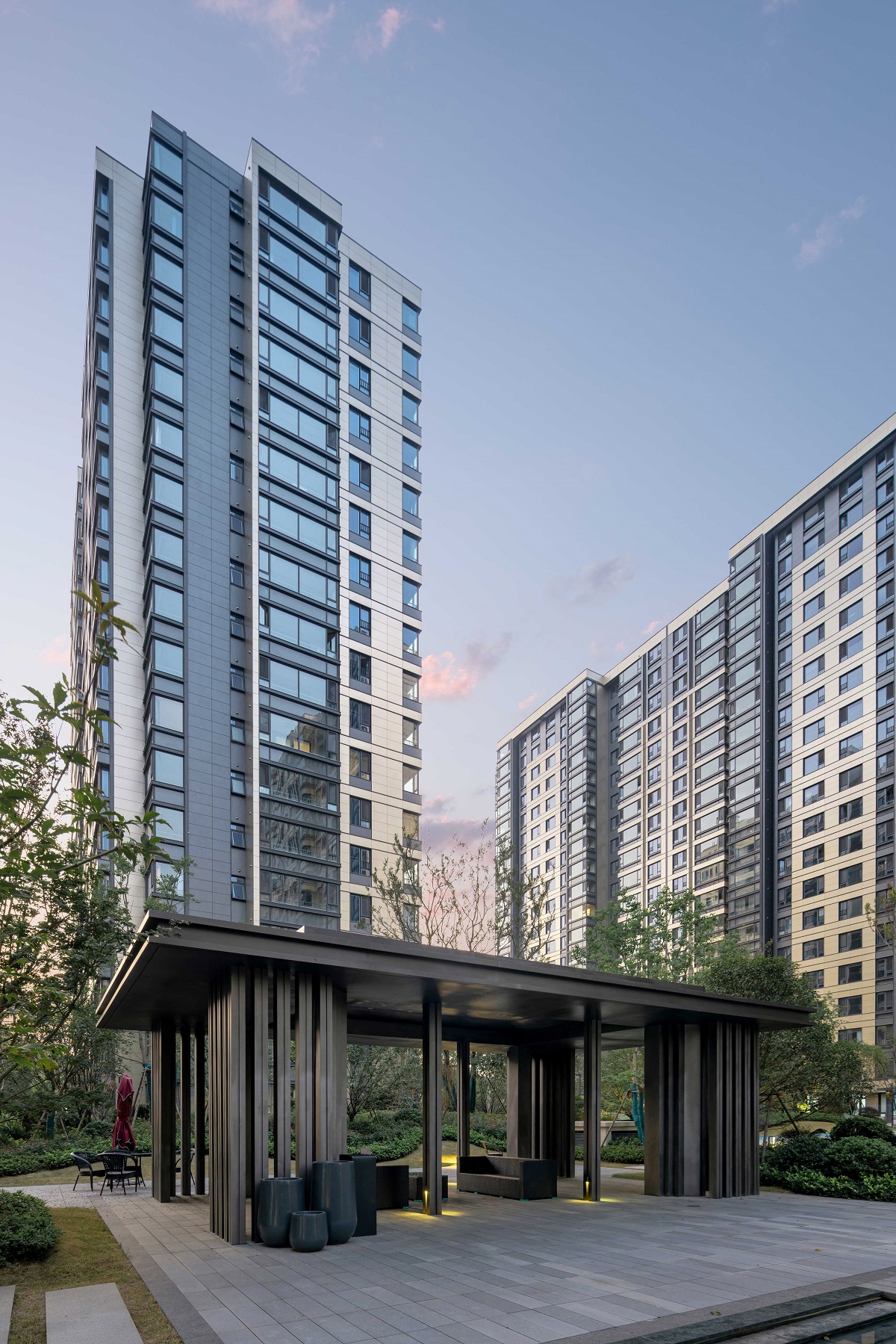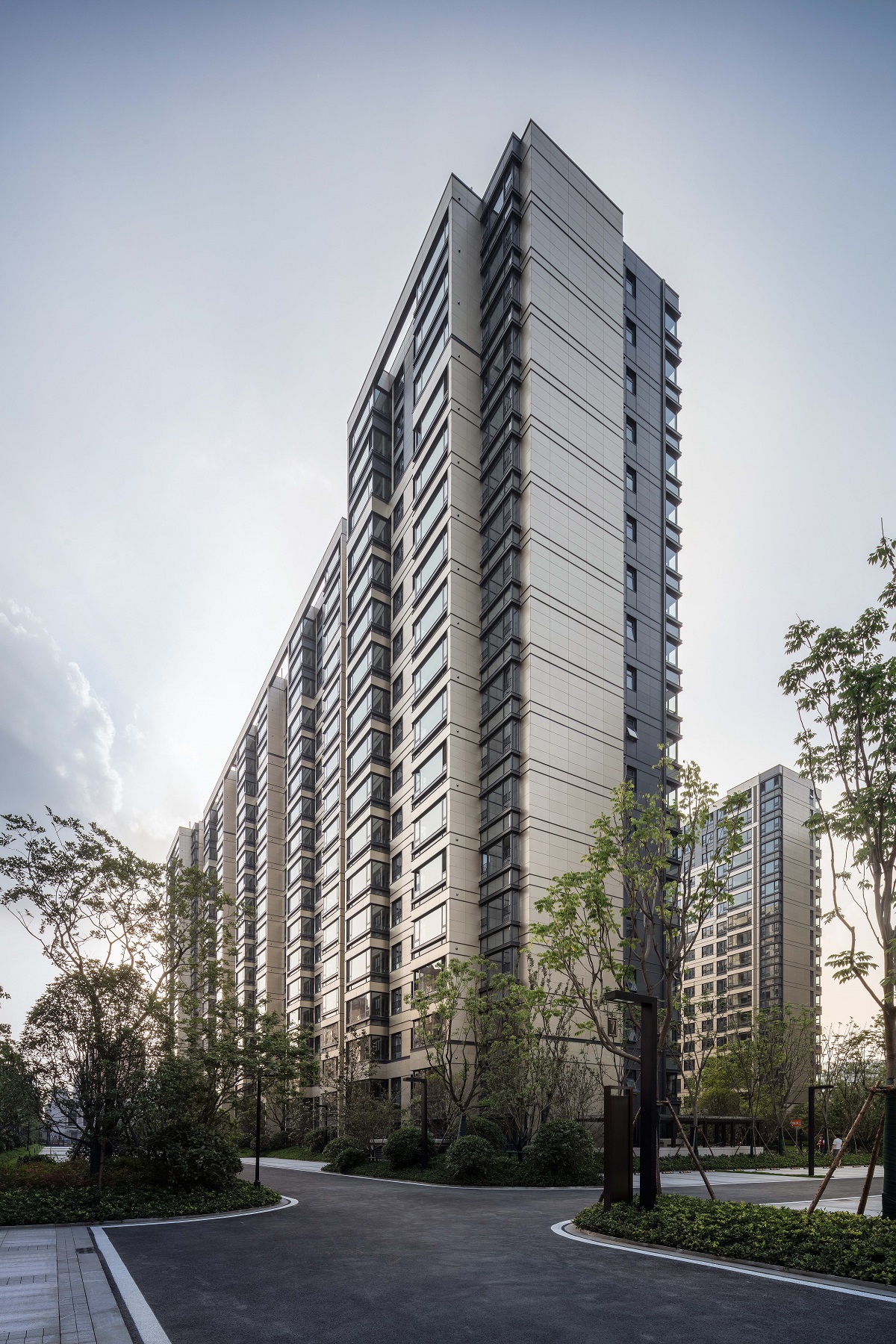 鉴于基地周边多为商办公建且临近城市干道,设计伊始住宅就已定调为公建化立面。设计团队从建筑形体的比例关系着手,引入类幕墙窗系统,在建筑整体的形体内通过虚实关系的提炼和优化,具有更明显的昭示感。最终呈现一个比例合宜、整洁、轻盈的立面效果。